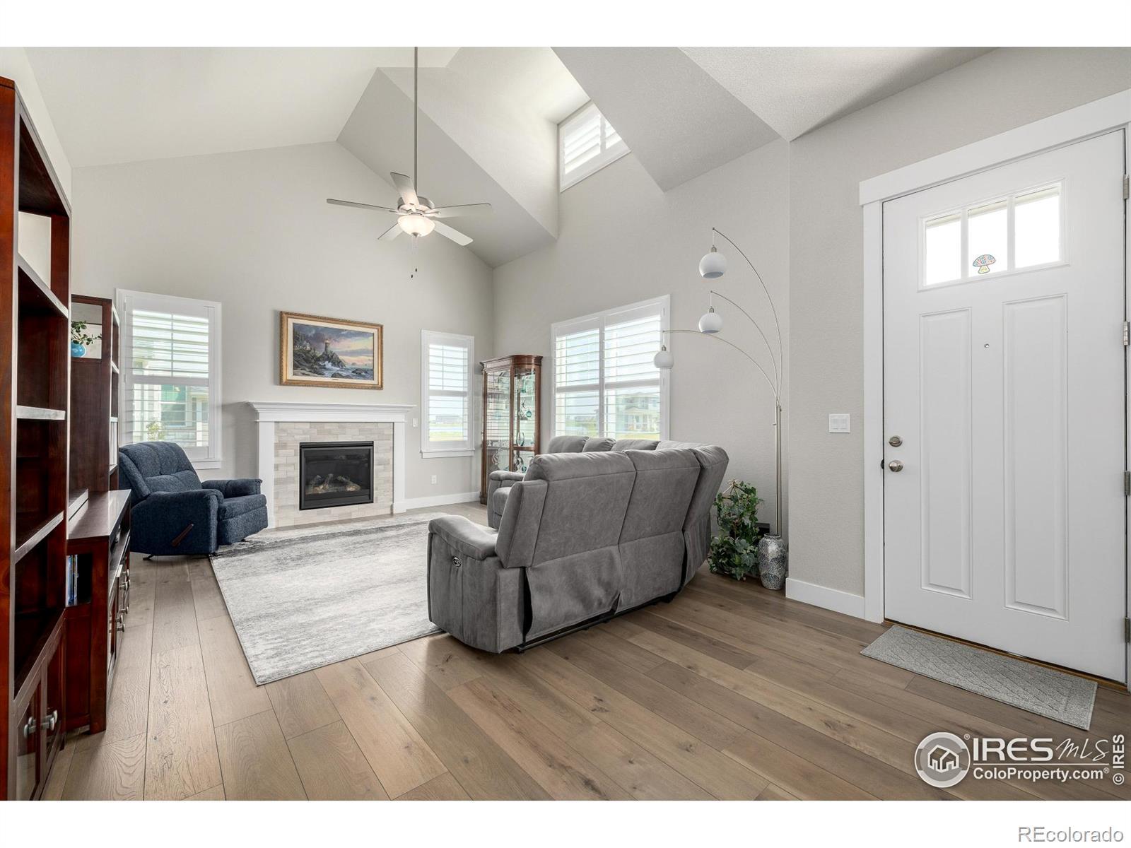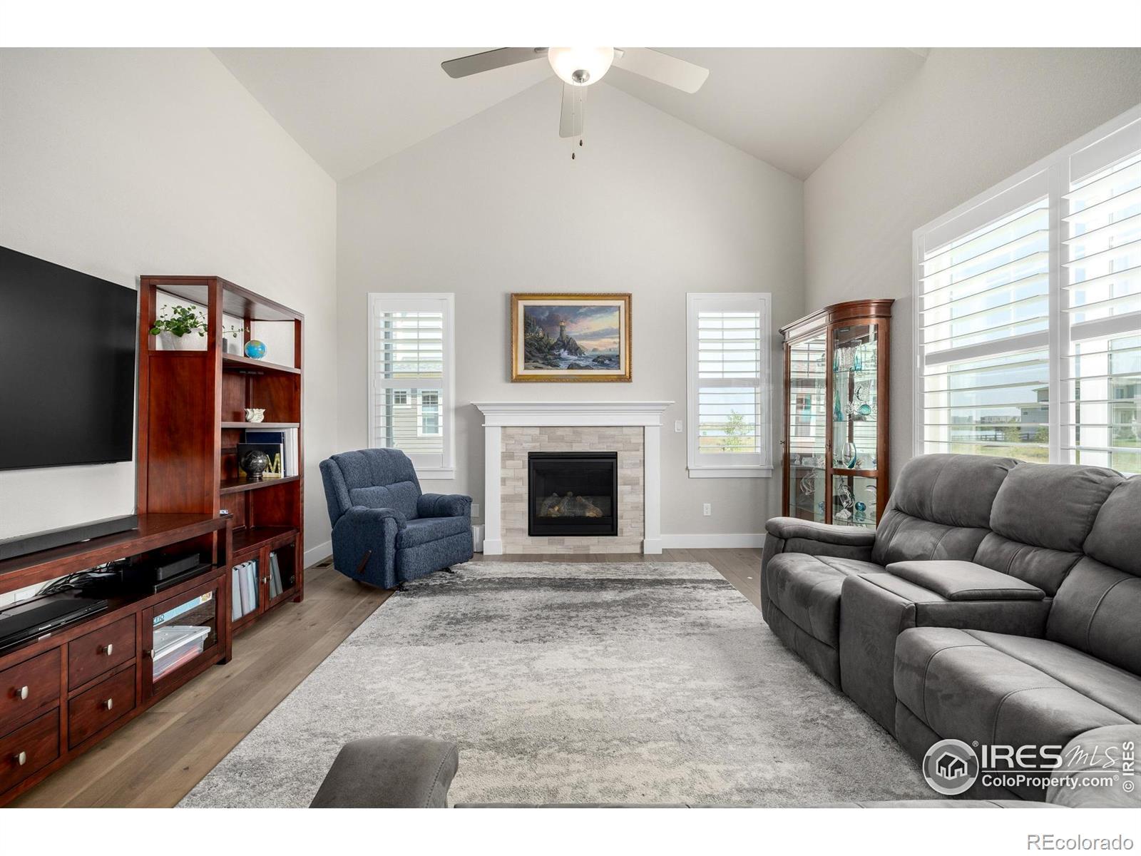 With sweeping lake views and a coveted end-unit setting, this townhome in The Lakes at Centerra offers a lifestyle of both beauty and convenience. A welcoming front porch patio opens to a thoughtfully designed interior where vaulted ceilings, abundant natural light, and a flowing open floor plan create an atmosphere of comfort and ease. The main level features a pristine living room accented by warm wood flooring and a fireplace that anchors the space. The kitchen is designed for both form and function, offering generous cabinetry, quartz counters, stainless appliances, and a spacious island that serves as a natural gathering point. The first-floor primary suite provides comfort and privacy, complete with an ensuite bath and walk-in closet. The finished basement expands the living space with a versatile family room, additional bedroom, and bath, ideal for guests or quiet retreats. A rear-entry two-car garage offers convenience and security, while the fenced yard invites time outdoors with panoramic water views. Set in immaculate condition and perfectly situated near shops, dining, and trails, this home pairs tranquility with everyday access. Plantation shutters, refined finishes, and smart design details elevate each space, making this residence a rare opportunity in one of Loveland's most desirable communities.