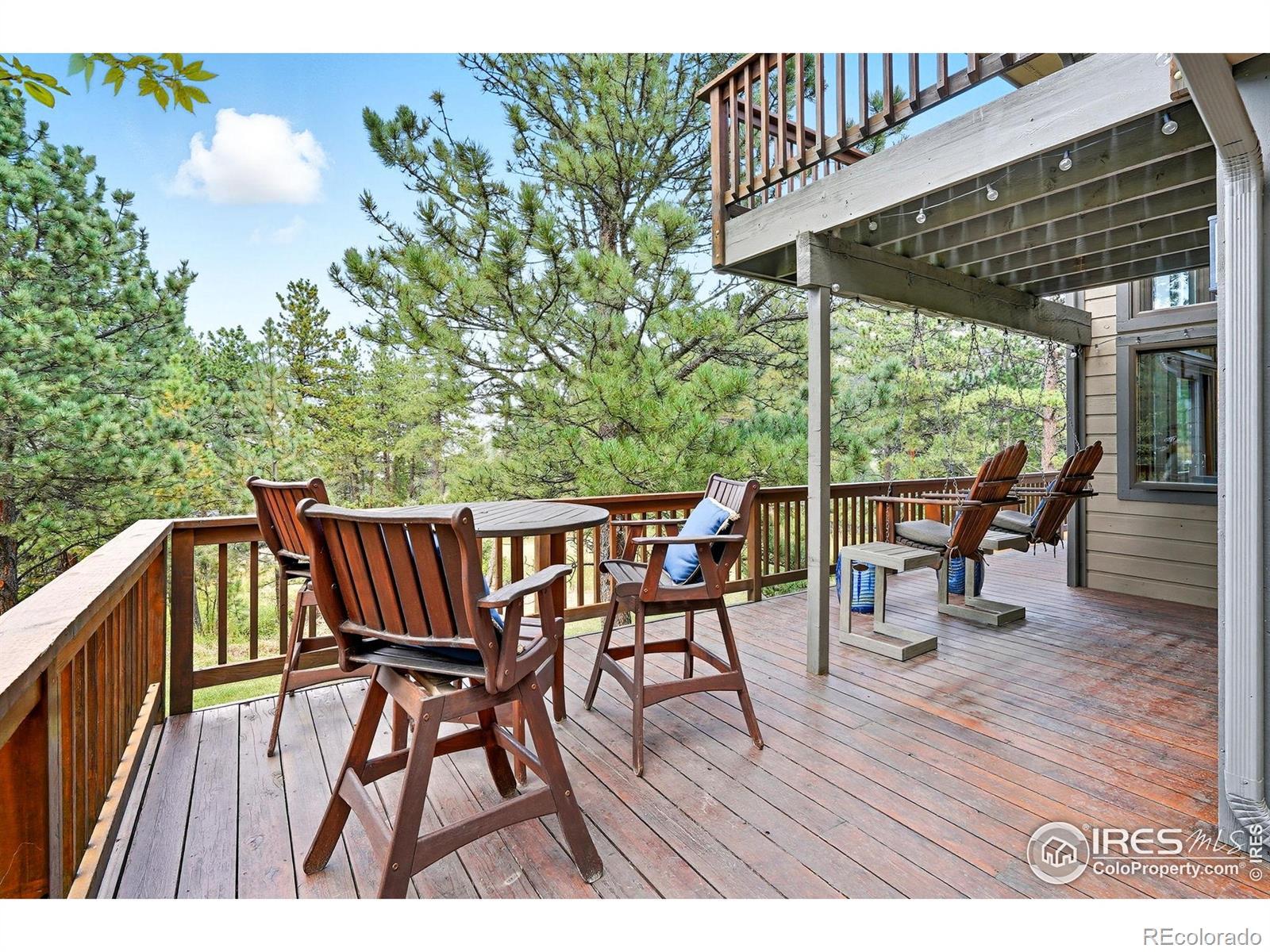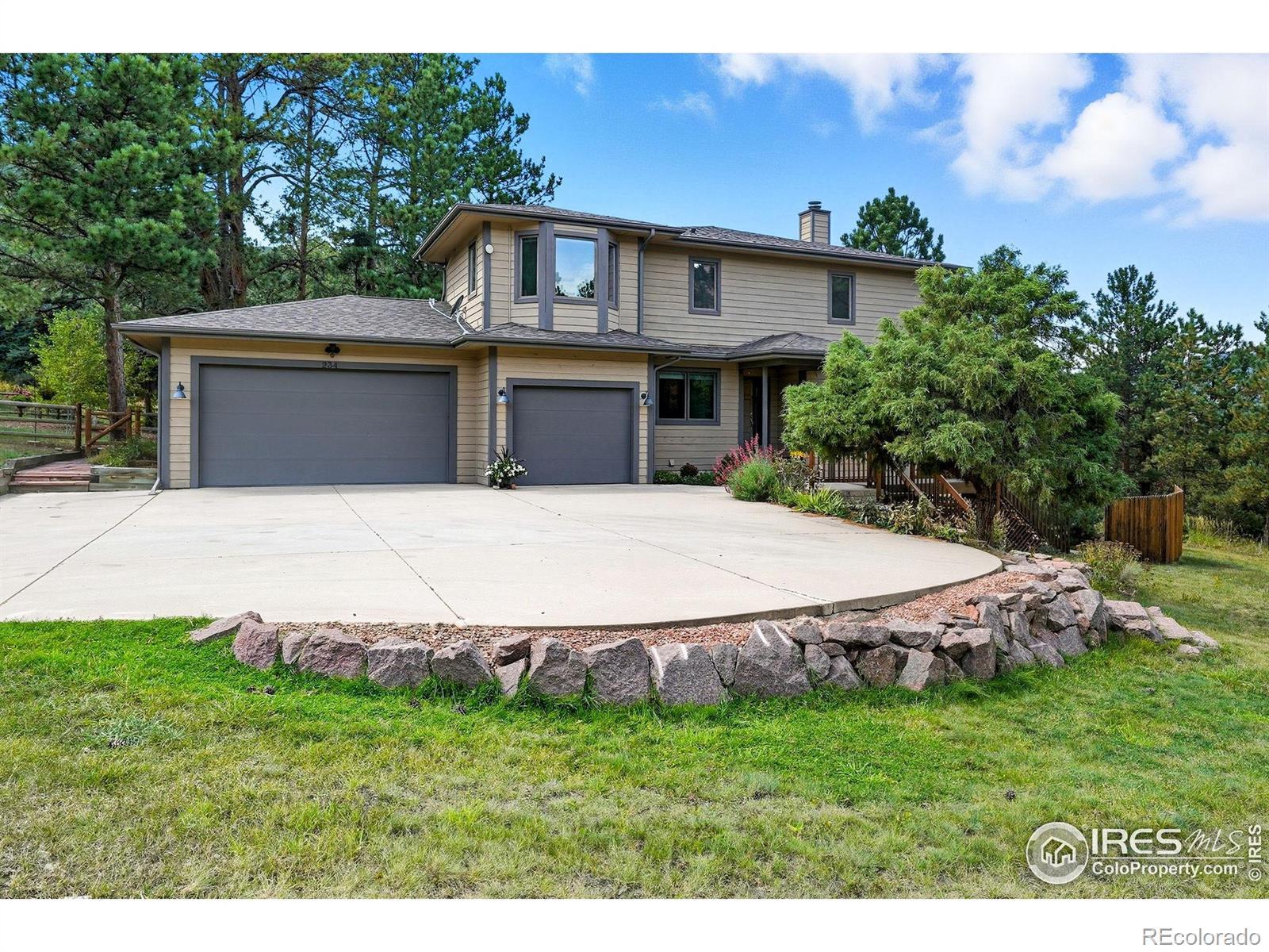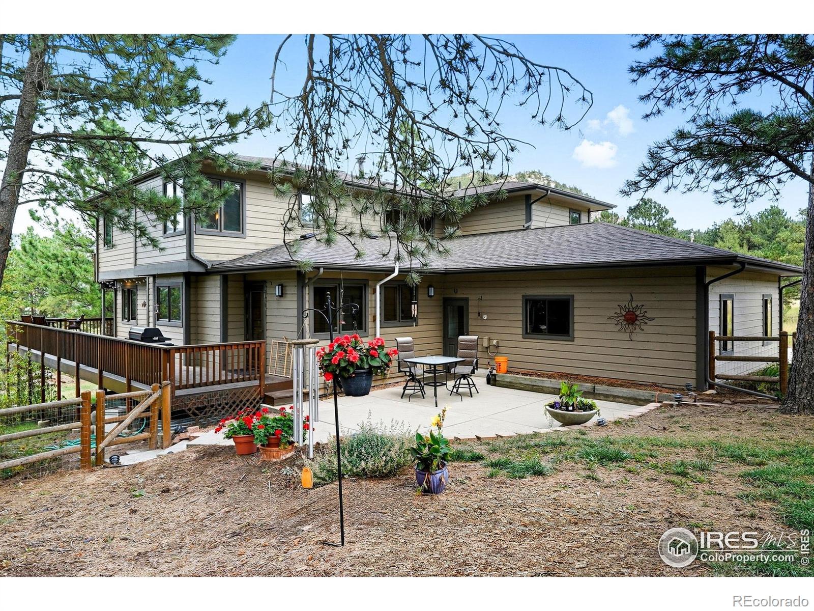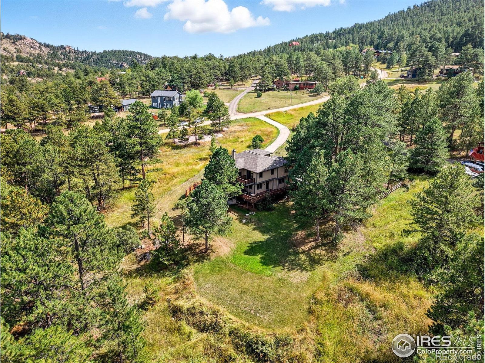 Nestled in the serene mountains just outside Lyons, this lovely home offers breathtaking views and visits from local wildlife, creating a pine-scented sanctuary! The main level features a great room with a wall of windows that frames the picturesque pines, allowing natural light to flood the space. The updated kitchen boasts granite countertops, modern appliances, and ample room for entertaining family and friends. A cozy wood-burning fireplace serves as the heart of the home, providing warmth and ambiance during the colder months. The light-filled office offers an inspiring workspace, perfect for remote work or creative endeavors. The expansive 1,000+ sq ft wrap-around deck extends your living space, while hanging swings create ideal spots for outdoor gatherings and peaceful relaxation. Upstairs, you'll find three bedrooms, including a primary suite with a large walk-in closet and its own private deck. The luxurious en-suite bath is well-equipped with a soaking tub and a glass-walled shower. Downstairs, the fully finished walkout basement presents an excellent investment opportunity with an additional bedroom, bathroom, living space, and kitchenette that can be utilized as an au pair, MIL, or short-term rental accommodations. The home sits nicely centered on a 2-acre lot, lovingly landscaped with the mountains as a gorgeous backdrop. Additional features include a three-car garage, a new roof (2025), a newer water heater, a radon mitigation system, and a fenced-in dog run, ensuring peace of mind for years to come. Situated in community oriented neighborhood that values connection, this property is free of HOA restrictions, while the voluntary road association adds additional benefits for homeowners. With easy access to the charm of both Lyons and Estes Park, your new home is ideally located for your next outdoor adventure!
