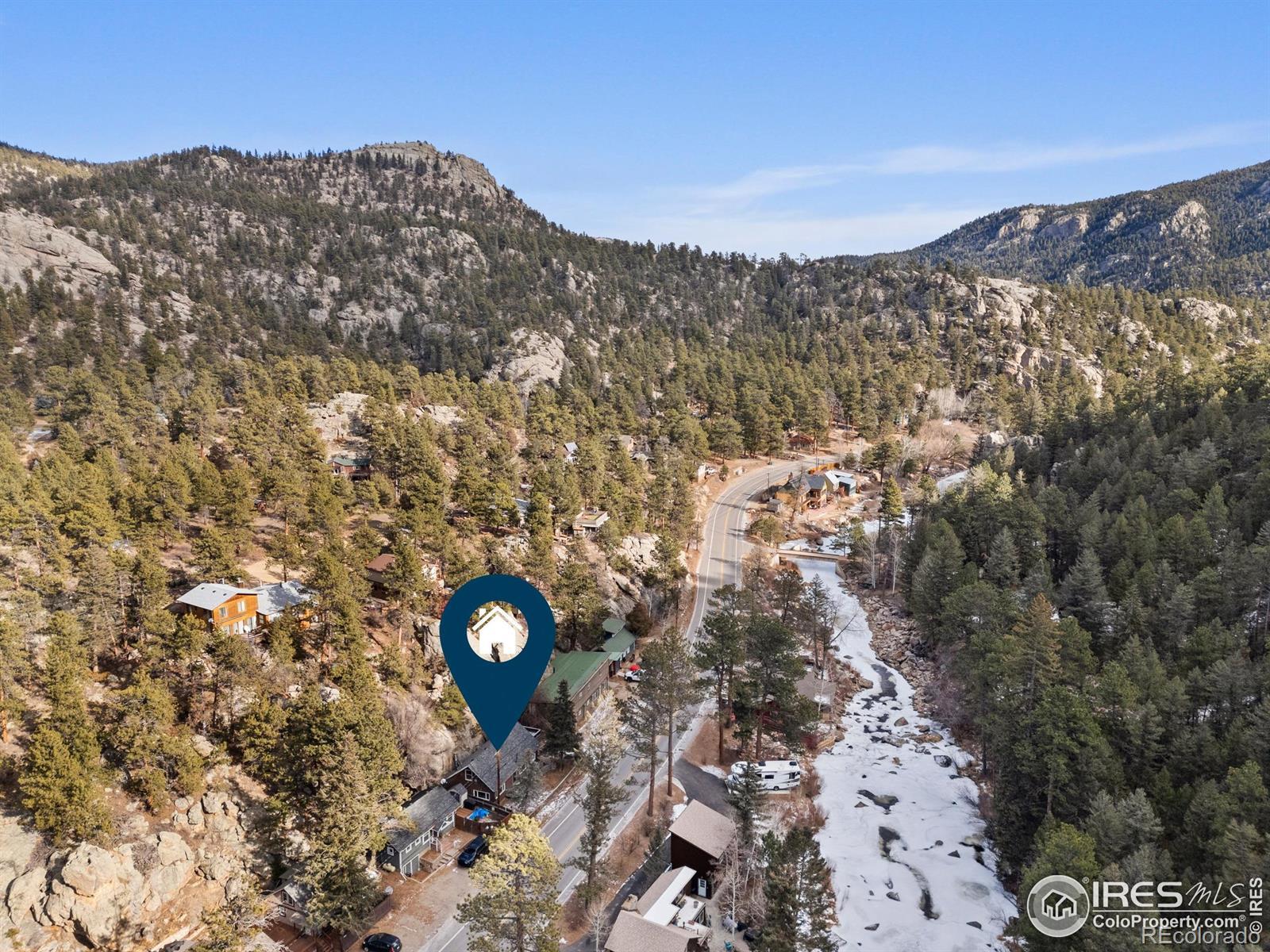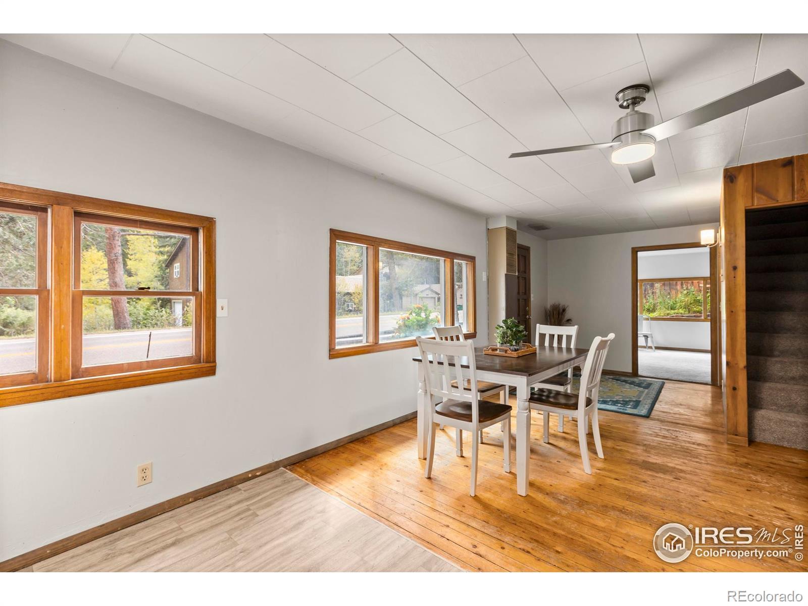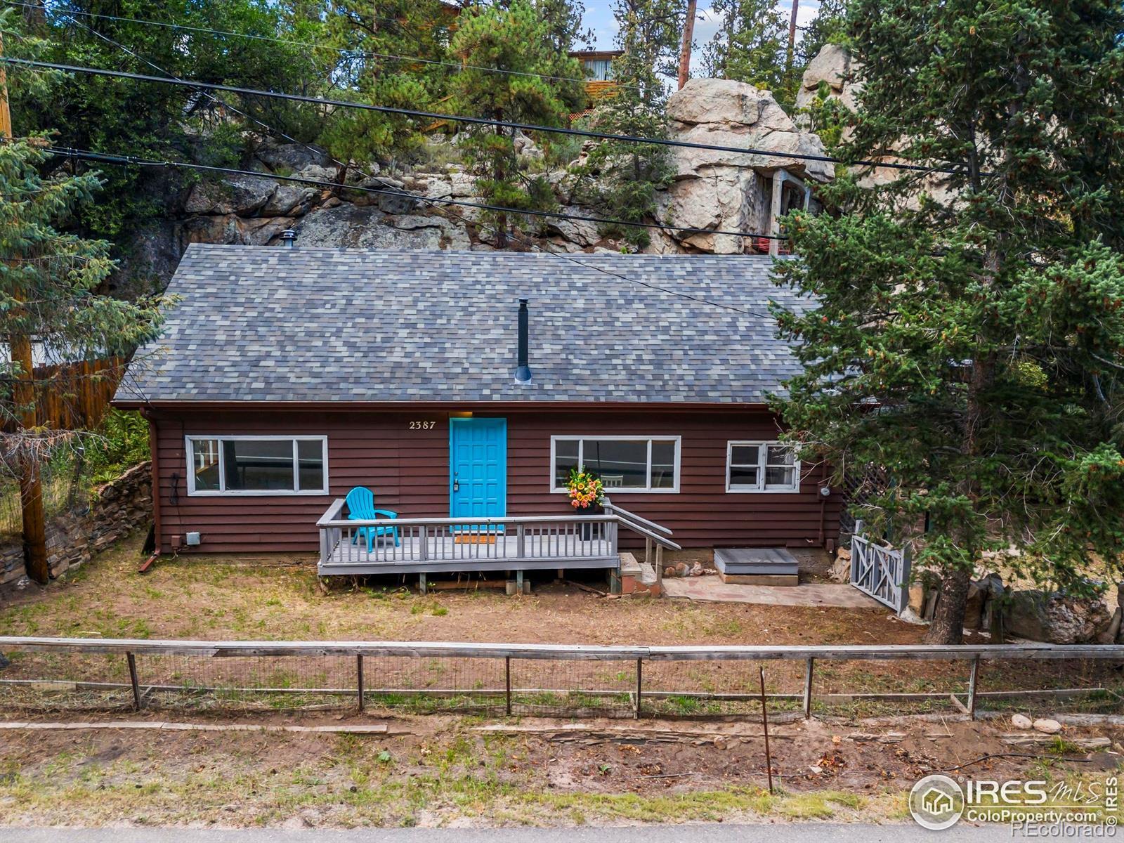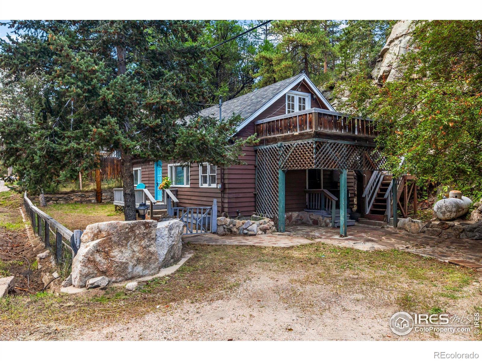 Discover this charming mountain cabin steps from world class fishing and minutes to Estes Park. This cozy 1415 SF cabin features a massive 1,500 SF detached shop, providing ample space for storage or hobbies. Recent updates include new appliances, roof, bath, paint, and carpet. Enjoy the warmth of vintage knotty pine paneling accents along with a cozy wood burning fireplace in the inviting living room. Don't miss your chance to own this mountain paradise!