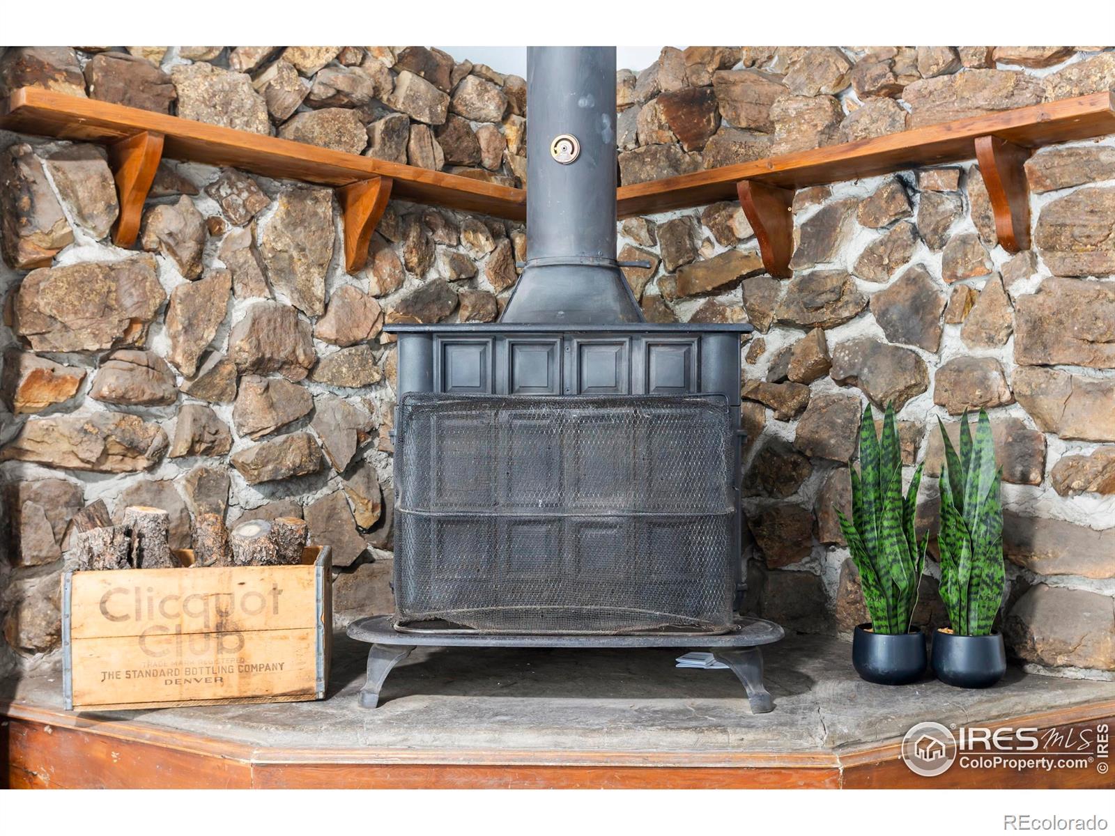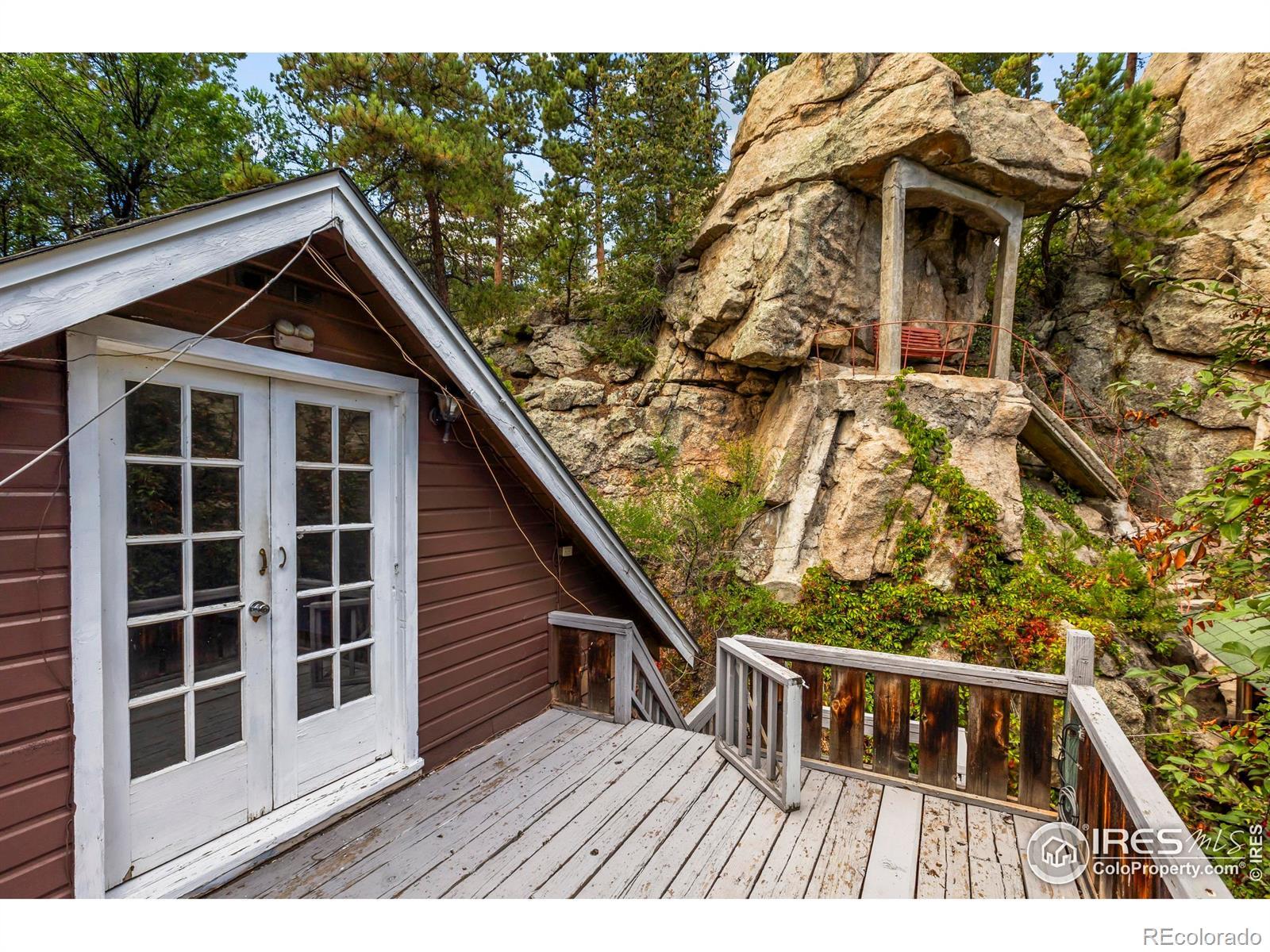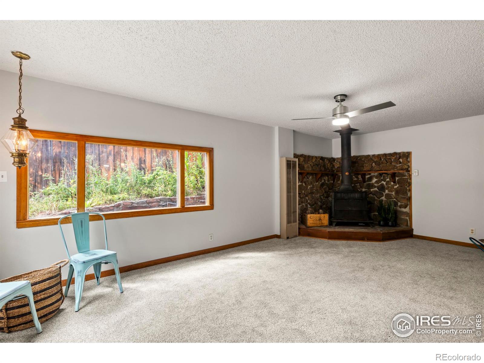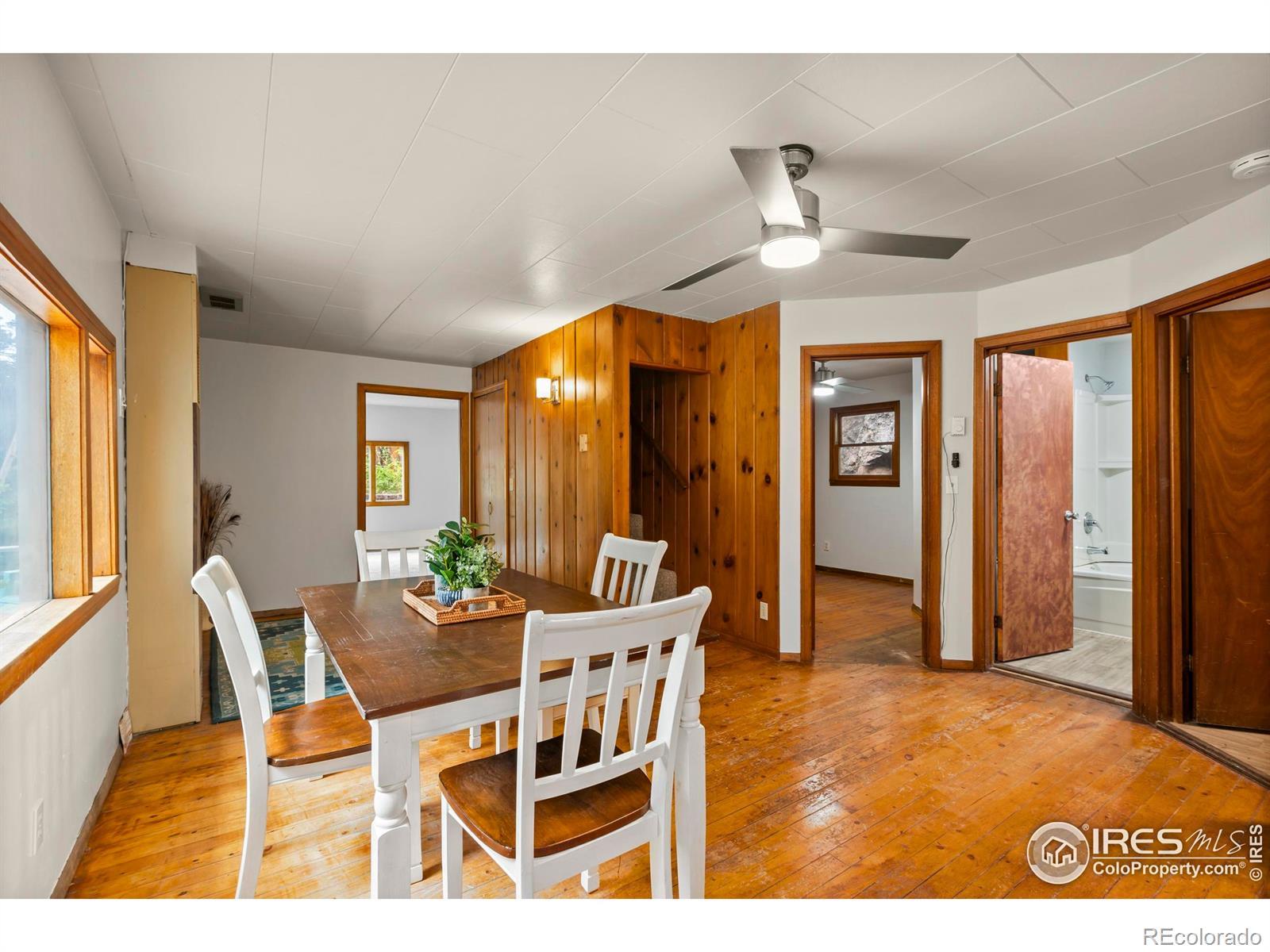 Discover this charming mountain cabin steps from world class fishing and minutes to Estes Park. This cozy 1415 SF cabin features a massive 1,500 SF detached shop, providing ample space for storage or hobbies. Recent updates include new appliances, roof, bath, paint, and carpet. Enjoy the warmth of vintage knotty pine paneling accents along with a cozy wood burning fireplace in the inviting living room. Don't miss your chance to own this mountain paradise!