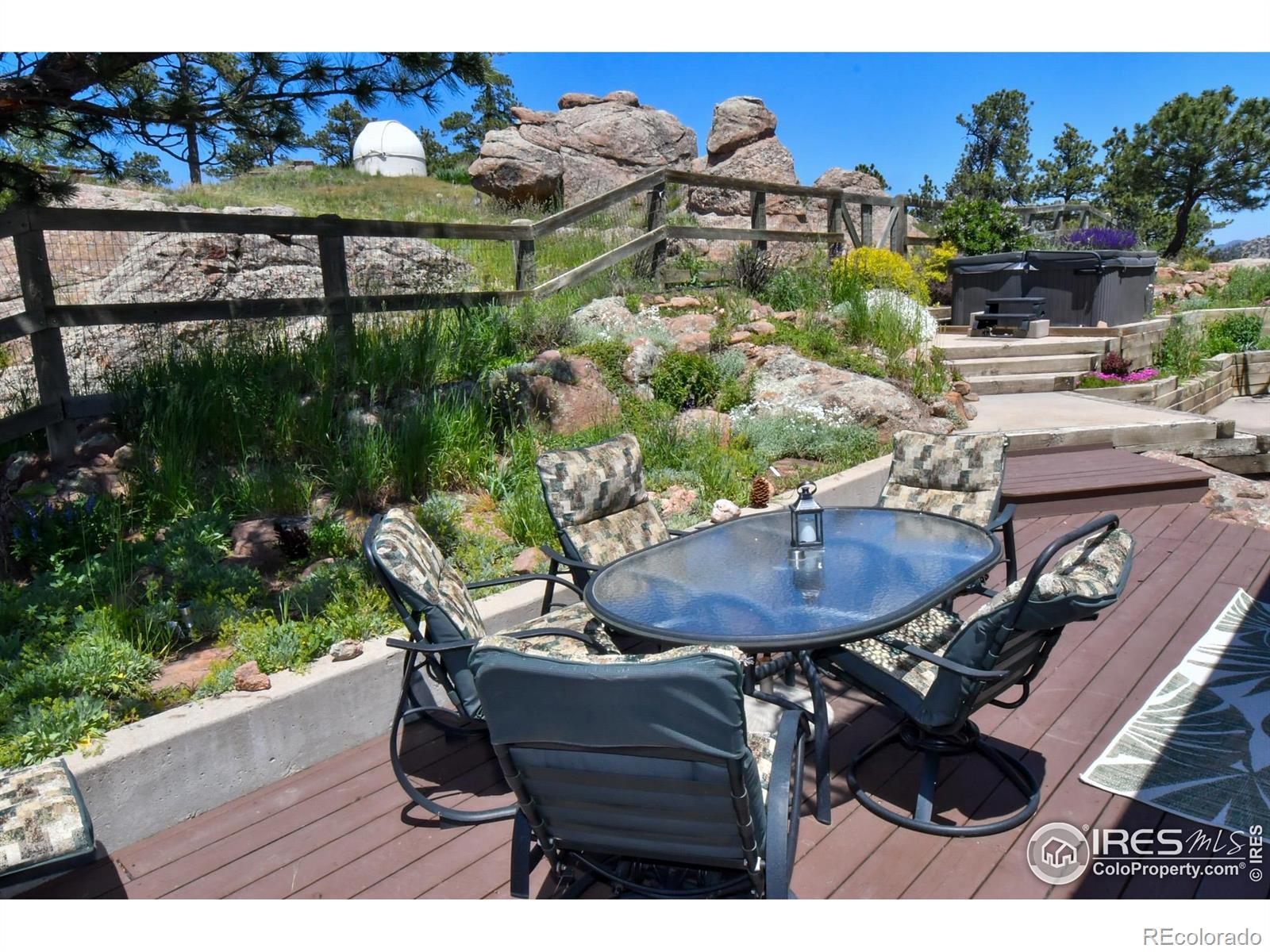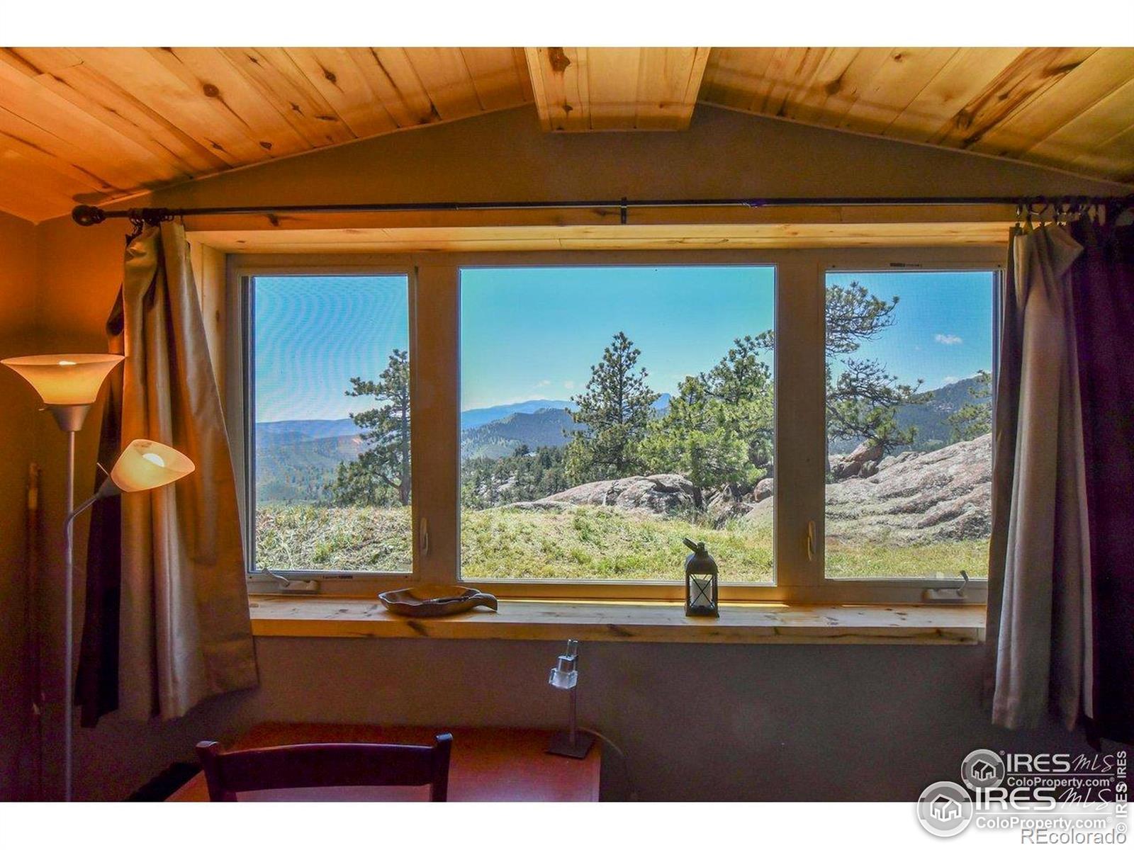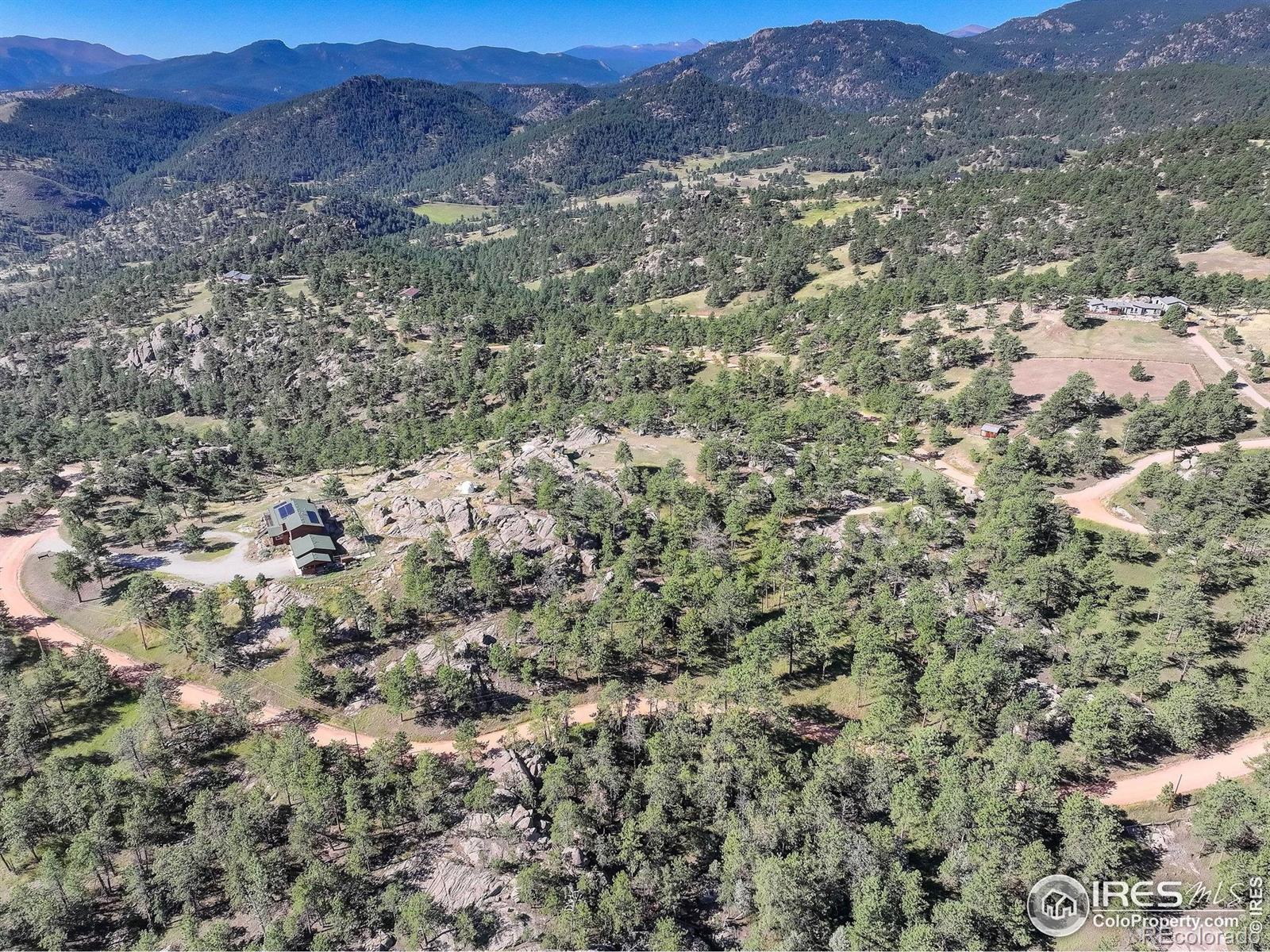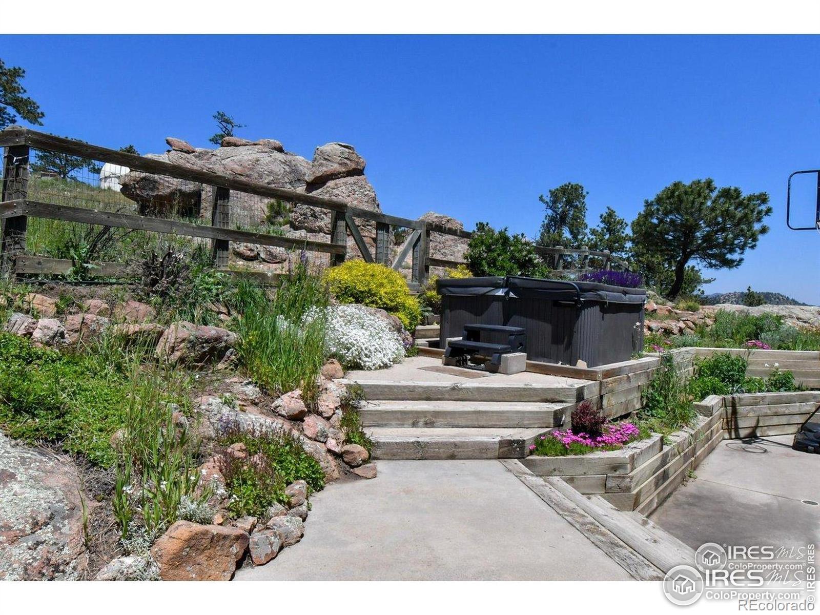 Spring Gulch Ranch. A rare dream home in a coveted canyon. This exquisite property is minutes to the town of Lyons and offers mountain living at its best, with extraordinary views from every room and lots of natural light. Stroll the gorgeous walking path that weaves through this 14.8 acre wonderland. Enjoy the amazing rock outcrops and many usable areas...great for meditation, camping, outdoor concerts and more. Fifty paces behind the house, a beautiful cabin sanctuary with electricity awaits you or your guests. At the end of the day, soak under the stars in the new hot tub! You will love the luxury and flow of the newly remodeled kitchen with high end quartzite countertops, a large island, new stainless appliances, induction stove, double oven & modern floor tile with views of the canyon and trees. The master suite also has incredible views with a newly remodeled 5 piece bath with marble and quartzite including a soaking tub, separated toilet and huge attached walk-in closet. The exquisite living room has vaulted ceilings with a wall of windows looking south out to the canyon and mountains and rock outcrops. The wood stove brings added heat and ambiance then flows into the dining area and kitchen. This all electric, newly updated 400 amp electric home has low energy carbon footprint and energy bills, because of the 31 solar roof panels, electric boiler heat (retains humidity) and on-demand electric hot water. An oversized 2 car garage has lots of cabinets with an attached carport for a 3rd vehicle and several storage sheds outside. The Well produces enough water for a family of 3 with an extra 4800 gallon cistern for back-up or watering gardens, and the well developed flower gardens have a sprinkler system and several raised garden beds. Start living your mountain retreat!