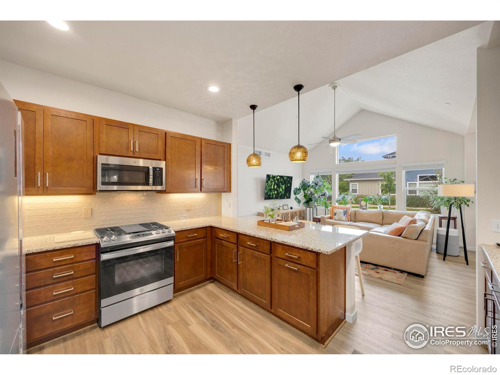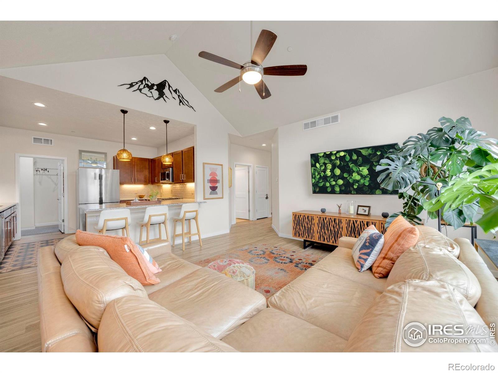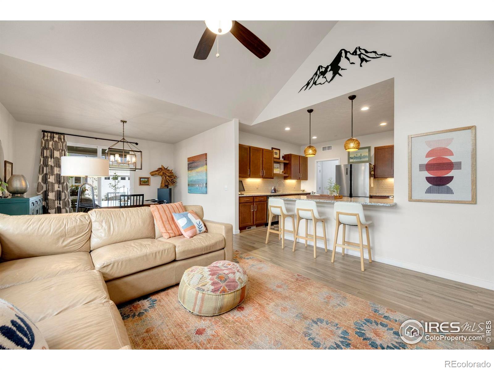 Bright and spacious 3 bed 2 bath "Stair & Metro District Free" end unit townhome in Fort Collins; situated just steps from Traverse Park where you can take advantage of open space, walking trail, playground equipment, and a pump track. Inside, enjoy entertaining from your oversized kitchen with granite countertops, seemingly endless cabinet space, and tasteful custom lighting. Having a more formal gathering? Move to the separate dining area or enjoy our perfect weather on the covered patio with privacy screen on one side, greenery and xeriscape on the other. When the day is over, retire to your owner's suite including a large double vanity and oversized shower in the bathroom, and more stylish lighting to read by in the bedroom. This unit is a true "Lock and Leave" property, snowbird or travel without having to worry about exterior maintenance.