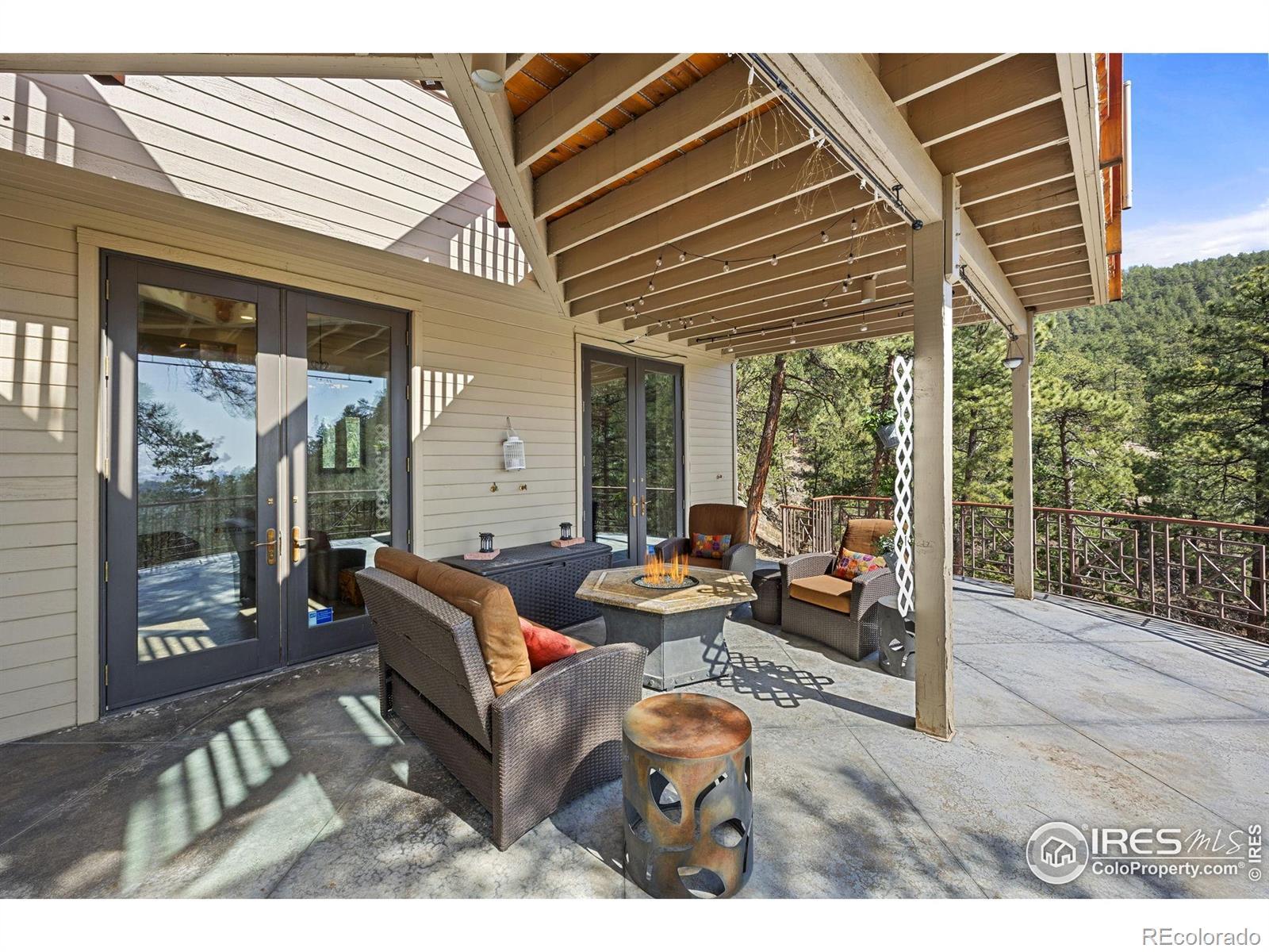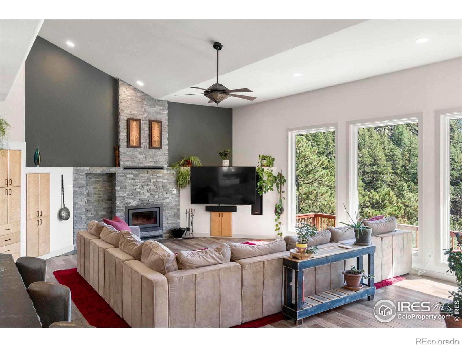 Exclusive Carriage Hills Estates retreat on 30+ pristine acres, just 5 miles from Boulder. This private sanctuary features panoramic mountain views, towering pines, and wind-protected positioning. Interior: 3 spacious bedrooms, lofted office, large gym/potential 4th bedroom, sauna, wine room, and expansive recreation space with floor-to-ceiling bookshelves. Three fireplaces (2 wood-burning, 1 gas) create warmth throughout. Recent Updates: New heating system, flooring, picture windows, remodeled bathrooms, stunning fireplace, fresh paint, backup generator, and refreshed landscaping. Outdoor Living: Soaring windows and multiple decks showcase unmatched views and flood the home with natural light. Listen to seasonal streams and spot wildlife from your deck.This isn't just a home-it's a mountain sanctuary blending modern comfort with timeless charm. Priced below appraisal!