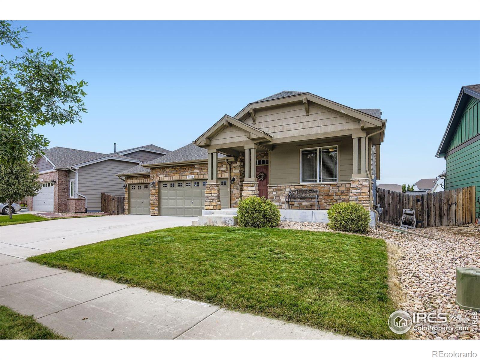 Step into this inspiring ranch in the highly sought-after Timnath Ranch! This 3,753-square-foot home features an open, welcoming layout and a full basement, beginning with a charming covered front porch that beckons you inside. Designed for comfort and flow, the spacious 3-bedroom, two full-bathroom ranch-style interior includes an east-facing office/bedroom, perfect for a work-from-home environment. The kitchen and dining area, adorned with hardwood floors, is ideal for both everyday living and entertaining, boasting a large island, stainless steel appliances, ample cabinets, a walk-in pantry, and stunning granite countertops. The primary suite offers vaulted ceilings, a luxurious five-piece bath, tile flooring, and a walk-in closet, creating a peaceful retreat. An additional generously sized bedroom, a convenient laundry room, and a full bath are thoughtfully located down the hall. Outside, the landscaped, fenced backyard with a covered patio provides an inviting space for relaxation and joyful gatherings. The three-car garage supplies ample parking and storage space for tools and toys. The unfinished basement with 9-foot ceilings and a rough-in presents exciting opportunities for customization or additional living space. This vibrant neighborhood features trails, playgrounds, a pool, and parks-just minutes from golf courses, shopping, and dining-offering the perfect setting for a vibrant, relaxed lifestyle.