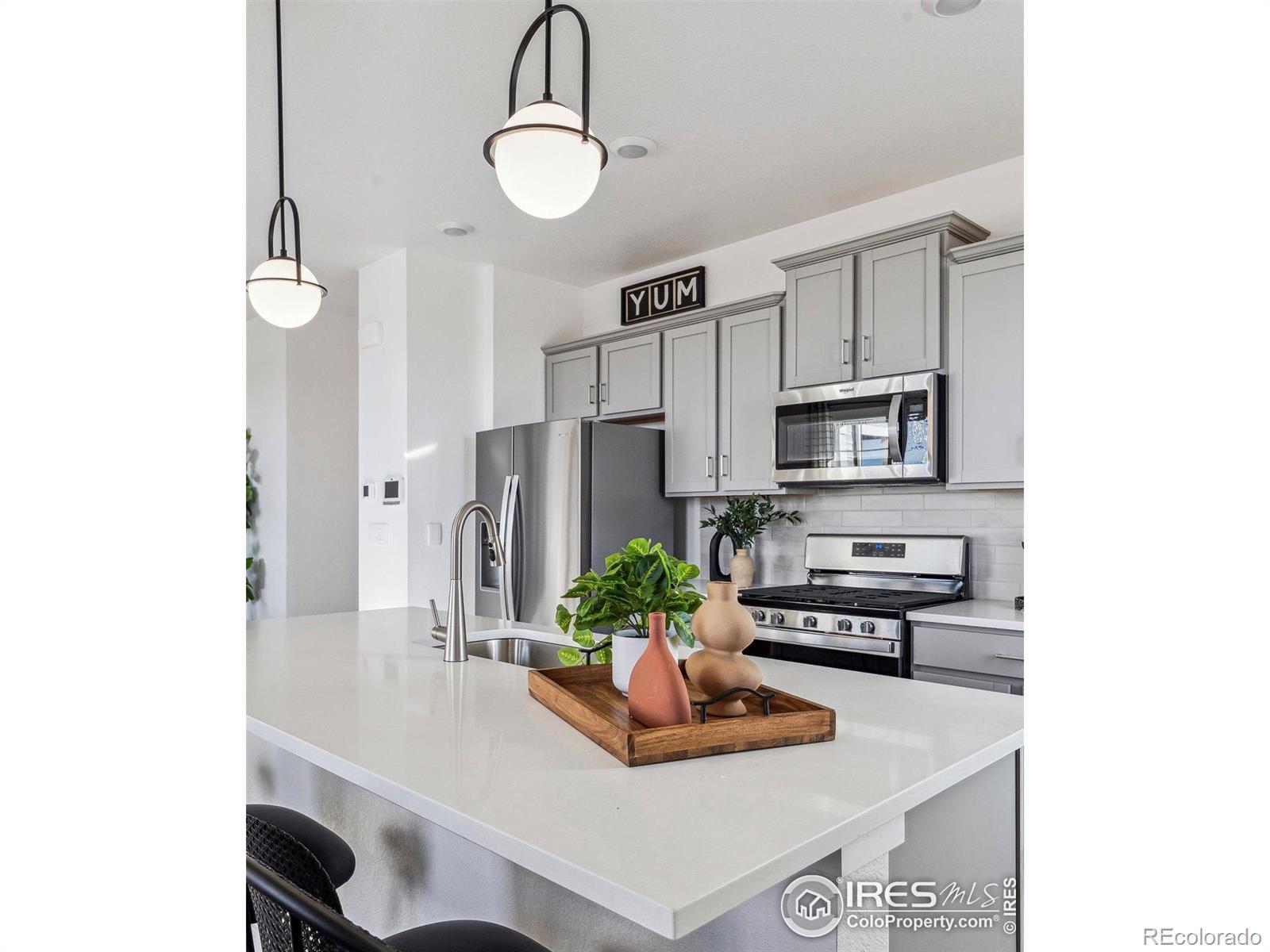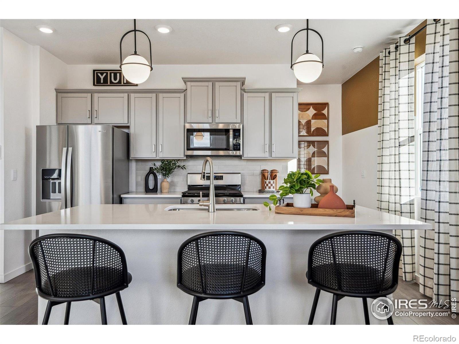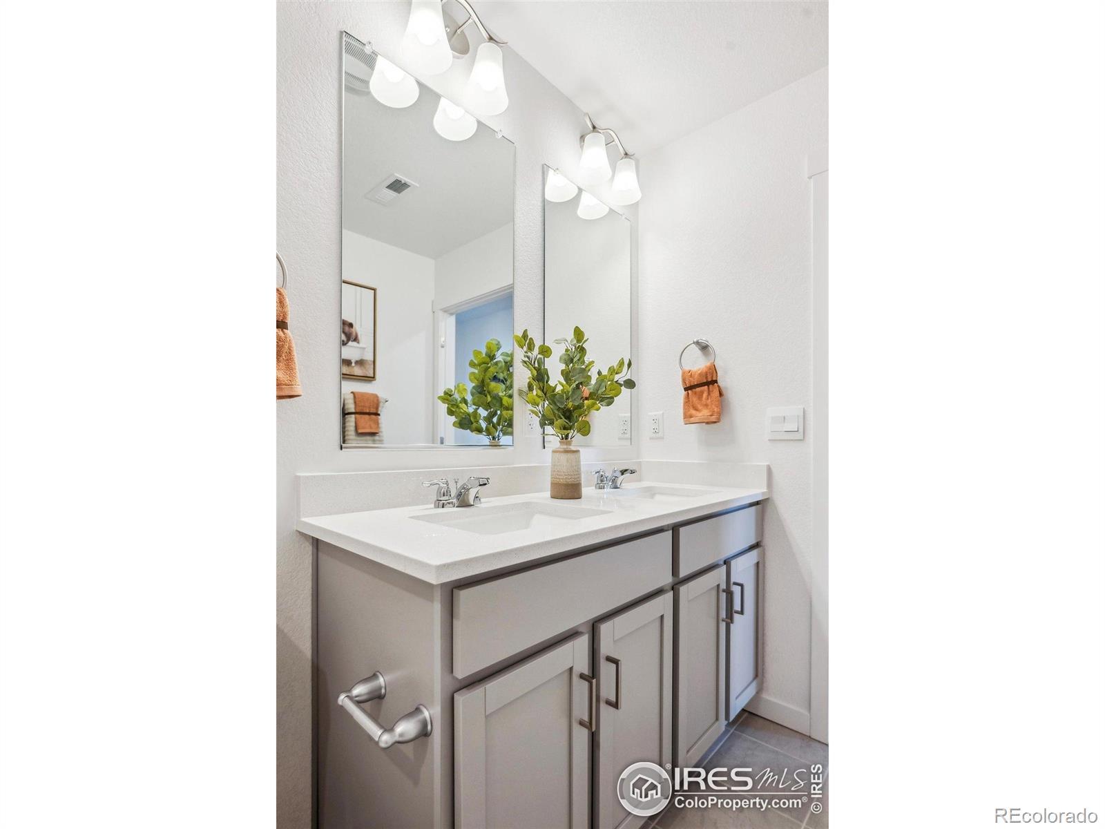 The Vail is a two-story floor plan offered in the Villas at Vantage community in Berthoud, Colorado. The 1,684 square foot home features 4 bedrooms, 2.5 bathrooms, and a 2-car garage. Aiming to impress the Vail floor plan welcomes you in from the front covered porch to the open concept living area. As you enter the heart of the home you will see the stunning kitchen that features premium cabinetry, stainless-steel appliances, and an expansive eat-in island that flows seamlessly into both the living room and dining area. The spacious living room is perfect for relaxing or entertaining and provides ample space for any set-up. A powder room is tucked away but still convenient for guests to use. The large primary bedroom is located upstairs and is complemented with two spacious walk-in closets and an ensuite bathroom that features a dual vanity and walk-in shower. You'll also find three additional bedrooms with plenty of space and plush carpets. A laundry room and second bathroom that also includes a double vanity sink are centrally located upstairs providing optimal functionality. Home also fronts onto a large grassed common courtyard, and additionally features maintenance-free front yard landscaping, tankless water heaters, active radon systems, blinds, and Smart Home Tech with remote access capabilities - all in a location backdropped by water and mountain views. The Vantage neighborhood includes a unique set of features and amenities such as TPC Colorado privileges including use of their world-class Fitness Center, Resort Style Pool with swim-up bar and hot tub, and restaurants. Use of Vantage Pool, Splashpad, Grilling Area, Playground and 2 Dog Parks in the 5-acre, on-site complex are also included in the HOA. ***Photos are representative and not of actual property***