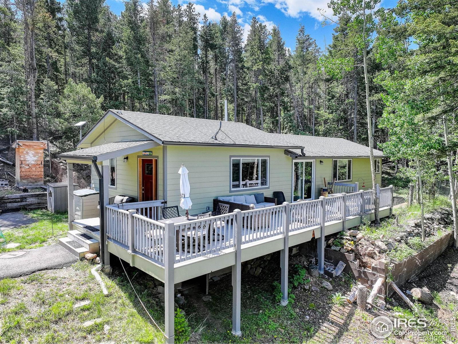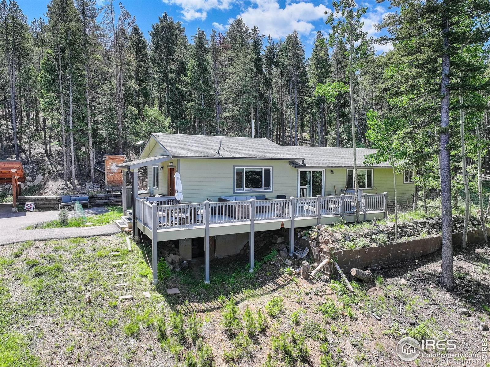 Listing Agent's preferred Lender is offering a 1-year 1% rate buydown for qualified Buyers! Escape to your own private mountain haven in the heart of Black Mountain Ranch Estates, where this enchanting Conifer retreat sits on a full acre wrapped in towering pines, wildflowers, and breathtaking mountain views. Live the peaceful Colorado lifestyle you've always dreamed of-surrounded by nature, wildlife, and crisp alpine air, with complete tranquility and privacy. The interior is warm, welcoming, and full of charm, featuring engineered hardwood floors in the cozy living room with direct access to a peaceful side patio-perfect for sipping your morning coffee, enjoying summer barbecues, or stargazing under crystal-clear night skies. The kitchen is equally impressive with durable tile flooring, gleaming granite countertops, natural pine cabinetry, modern spotlight lighting, stainless steel appliances, and convenient access to the backyard. The primary suite offers a serene retreat with plush carpet, built-in lighting, and a spa-inspired en suite bath featuring granite counters, rich dark cabinetry, and a fully tiled shower surround. Two additional bedrooms with soft carpet and built-in lights provide space for guests or a home office, while the second bathroom includes built-in shelving and a beautifully tiled shower. Major upgrades include a new well, a new water heater installed in January 2025, and a whole-house generator that powers everything except the dryer. A detached 2-car carport protects your vehicles year-round, with bonus space for your RV. Newer septic system and city-plowed roads add year-round convenience. Just minutes from hiking, biking, and Maxwell Falls, this stunning home is a rare mountain gem blending comfort, self-sufficiency, and spectacular natural beauty. Close to Echo Mountain Ski Resort!