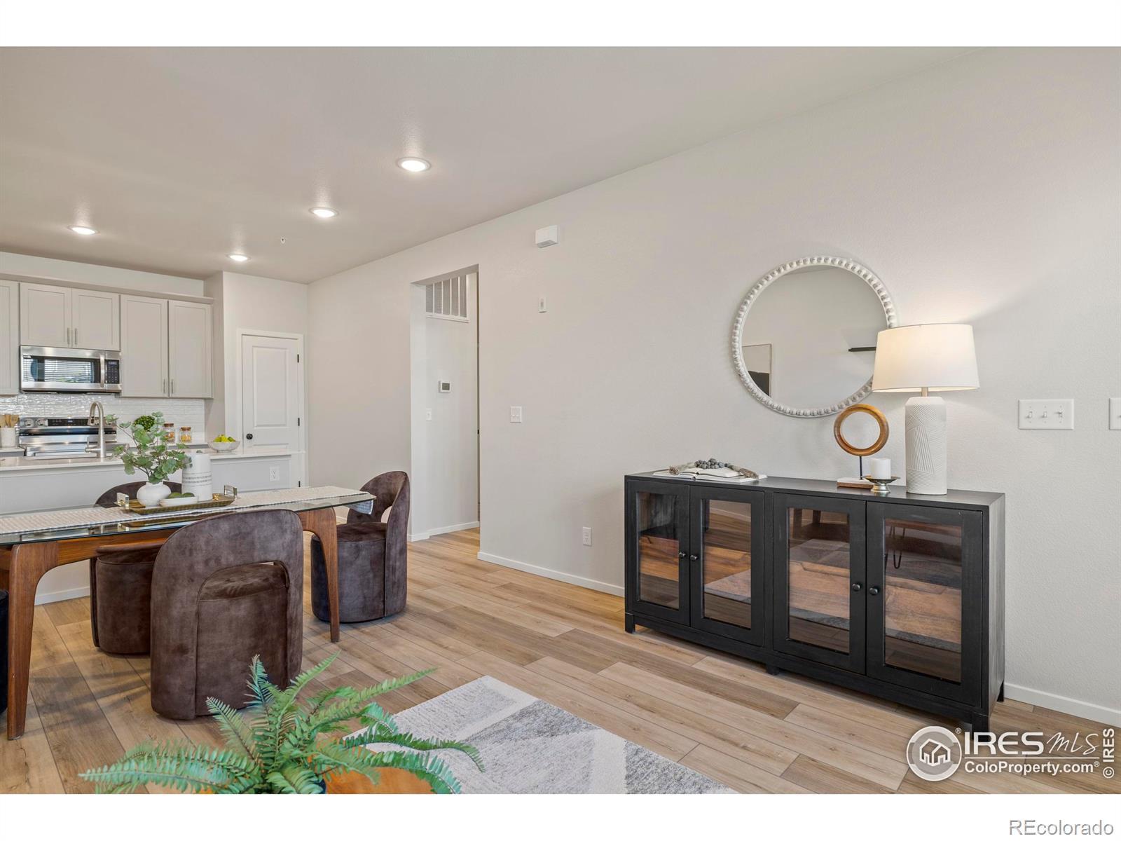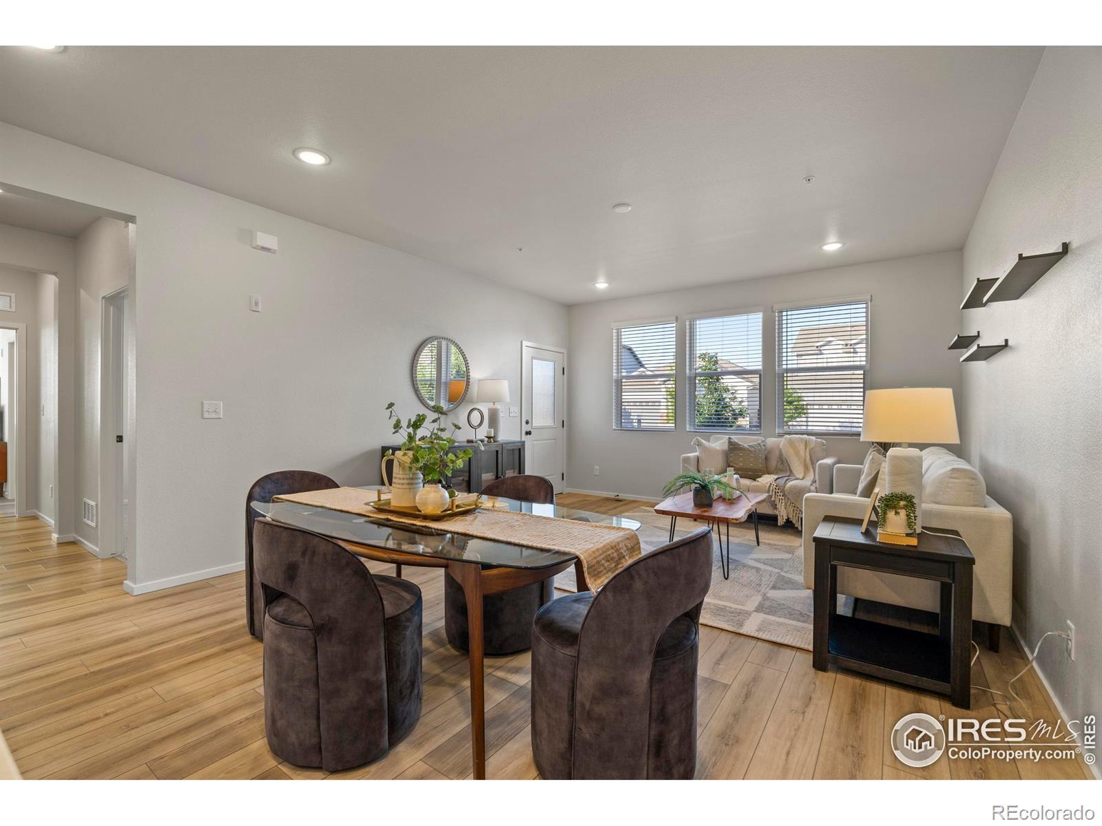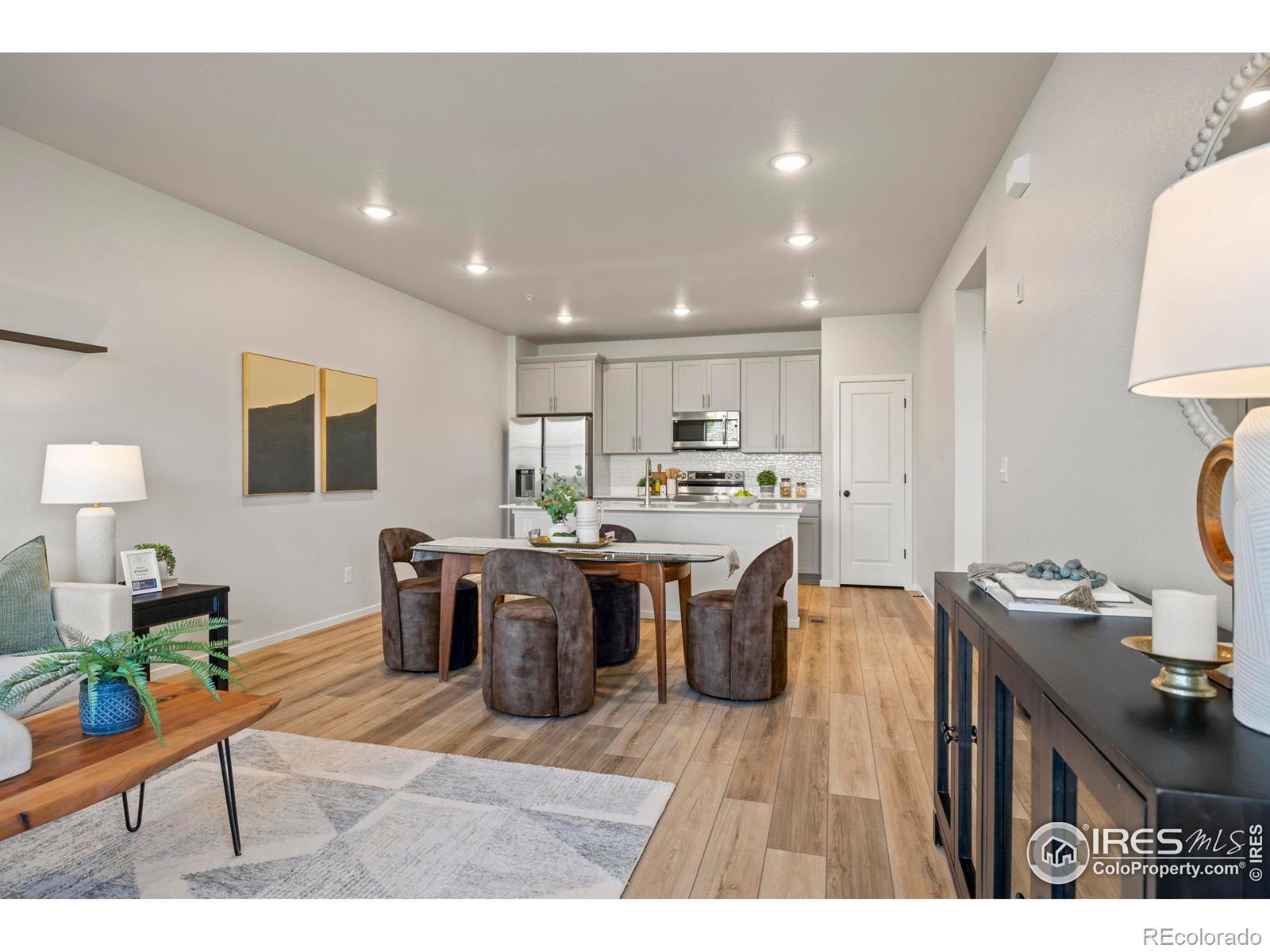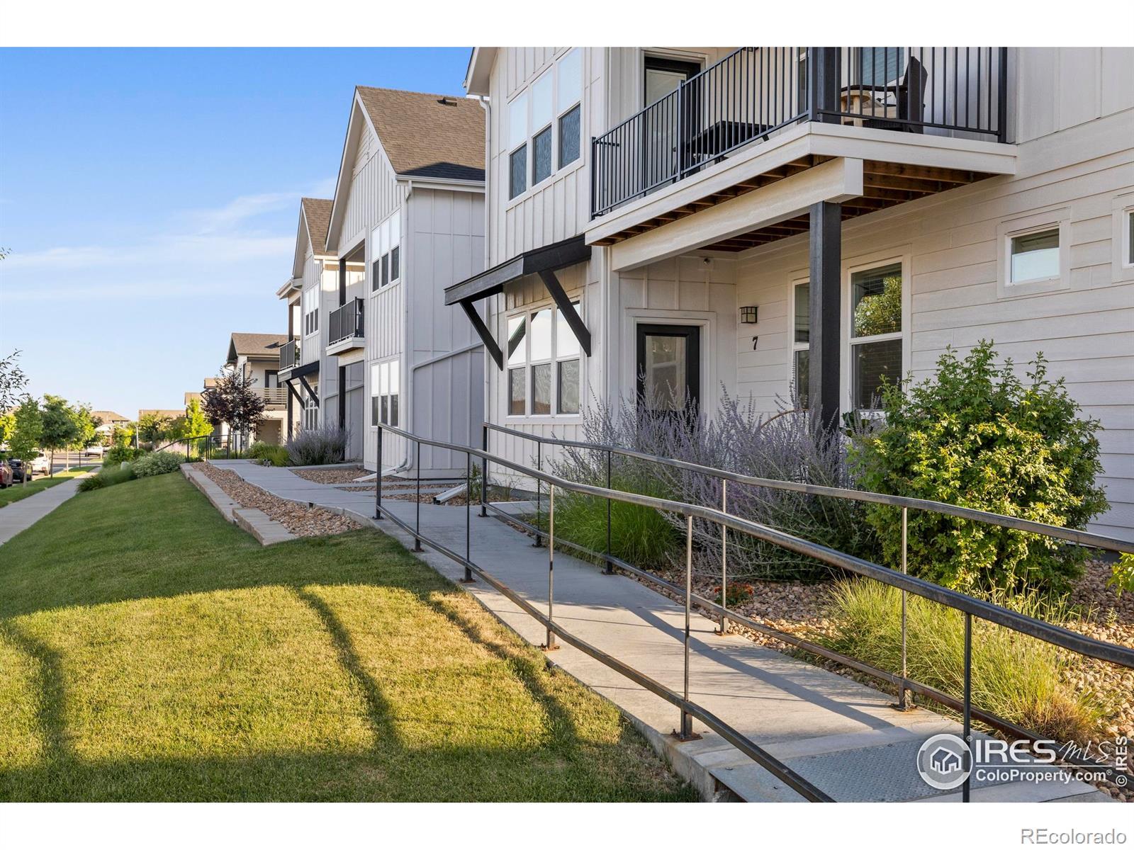 PRICED BELOW the builder's current inventory of 2 bed/2 bath attached homes, this 2022-built end-unit condo offers both immediate equity and long-term income potential. Whether you're looking for a turnkey primary home, a low-maintenance lock-and-leave, or an attractive rental investment, this ground-level property checks every box. Designed with a modern farmhouse feel, the 2-bedroom, 2-bath layout delivers comfort, style, and accessibility-with ramp entry and no stairs. Set in a quiet location that fronts to grassy open space, the east-facing patio offers a peaceful retreat with shade for summer evenings. From here, you're steps from scenic trails, neighborhood dining, and the Raindance River Resort Pool-complete with lazy river, water slide, and walk-in beach. Inside, the bright open floor plan features a welcoming living area, a gourmet kitchen with quartz counters, shaker cabinetry, center island, pantry, and stainless appliances, plus a dining area for everyday meals or entertaining. The spacious primary suite showcases luxury vinyl flooring, a spa-inspired bath with a walk-in tiled shower, dual vanities, and a generous closet. The secondary bedroom offers flexibility for guests, an office, or short-term rental potential-complete with its own full bath. Additional highlights include attached one-car garage with direct entry through the laundry area, keyless entry + storage closet and additional street parking right out front for easy hosting. Located within one of Northern Colorado's most desirable master-planned communities, you'll enjoy golf cart access to restaurants, parks, and resort-style amenities. Absolutely turnkey and move-in ready-priced to sell with unmatched value compared to new construction. Don't miss the 3D walkthrough on the property website!