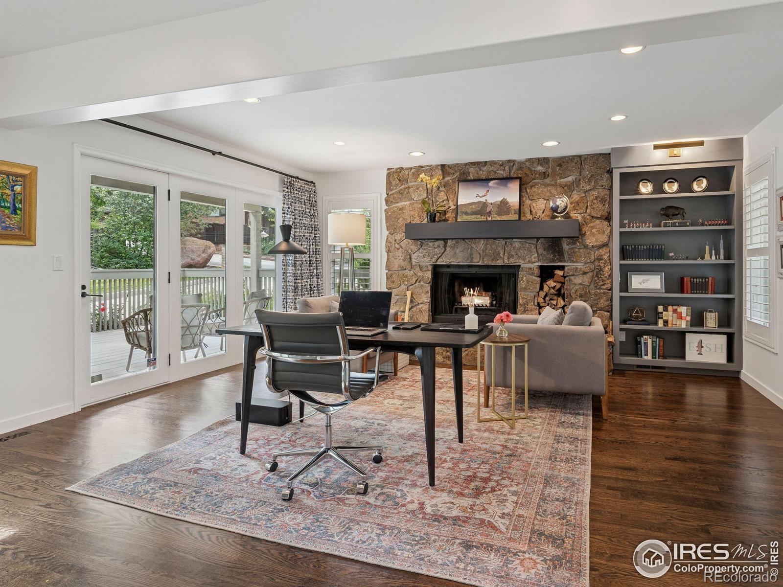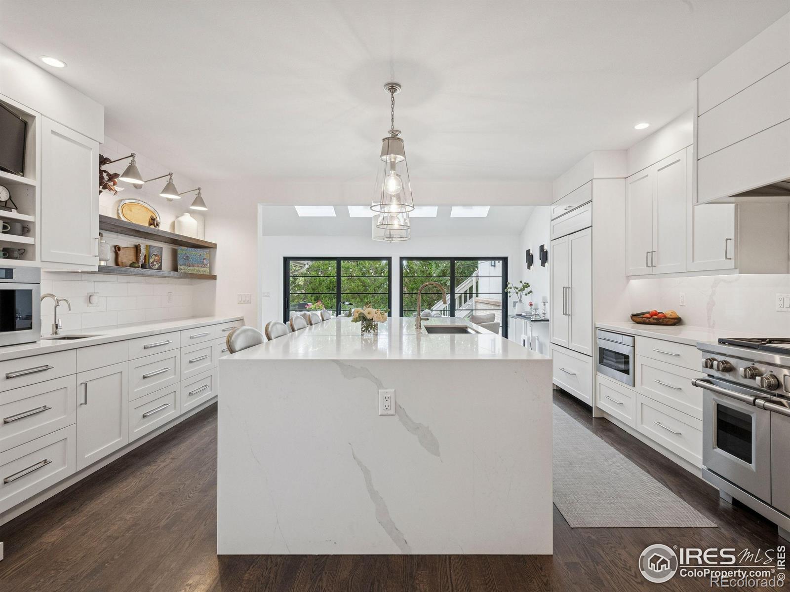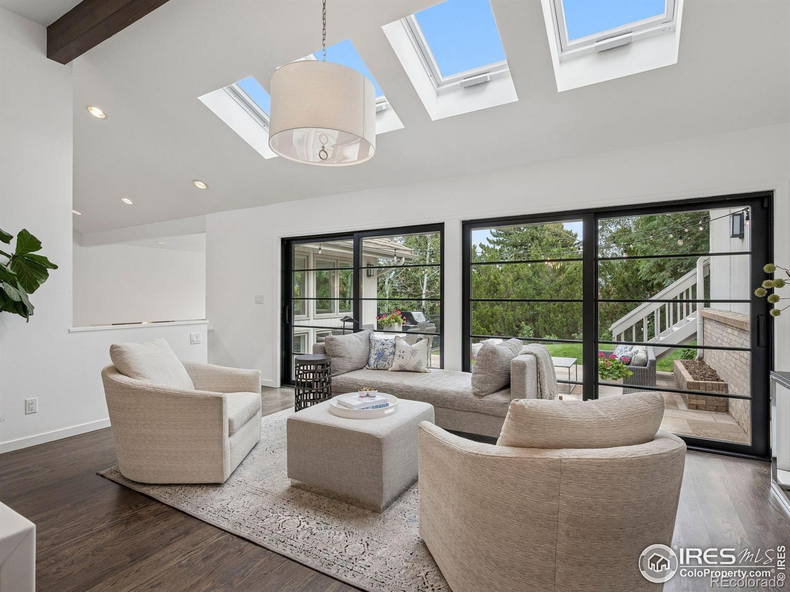 Experience Boulder's most coveted lifestyle in this exceptional residence, just steps from Chautauqua Park and Auditorium. Set on a generous half-acre lot with over 7,200 square feet, the home combines timeless design with modern updates, recently completed by Donohoe Builders, and interiors by Deidre Oliver of Oliver Designs. The main level welcomes with a marble foyer leading to an open, light-filled floor plan. At its heart, a chef's kitchen features a striking white quartz waterfall island, Sub-Zero refrigeration, six-burner Wolf range, two Bosch dishwashers, and a built-in coffee-espresso maker. Adjacent spaces include a sitting room with sliding doors to the backyard, a stylish office with moss rock fireplace, a 5-person spa room with hot tub and outdoor shower, and a living and dining area with vaulted ceilings and wall-to-wall windows framing breathtaking Flatiron views. Upstairs, the primary suite offers a private deck, wood-burning fireplace, and luxurious bath with soaking tub, Carrera marble shower, dual walk-in closets, and laundry. A guest bedroom with adjacent full bath is ideal as a nursery, office, or overnight guest stay. The lower levels provide three additional bedrooms with walk-in closets, two shared full baths, a dedicated office with deck, media room, gym/recreation space, and flexible living areas with backyard access. Outdoors boasts, mature landscaping, a flagstone patio and multiple private decks. Thoughtful interior details like custom lighting, skylights, walnut and white marble flooring, plantation shutters, and Pella windows create an inviting, modern environment. With hiking trails, concerts, and community events just steps away, plus Pearl Street's dining and shopping a minutes drive from home, this property offers a rare combination of sophistication, comfort, and connection to Boulder's iconic natural and cultural lifestyle.