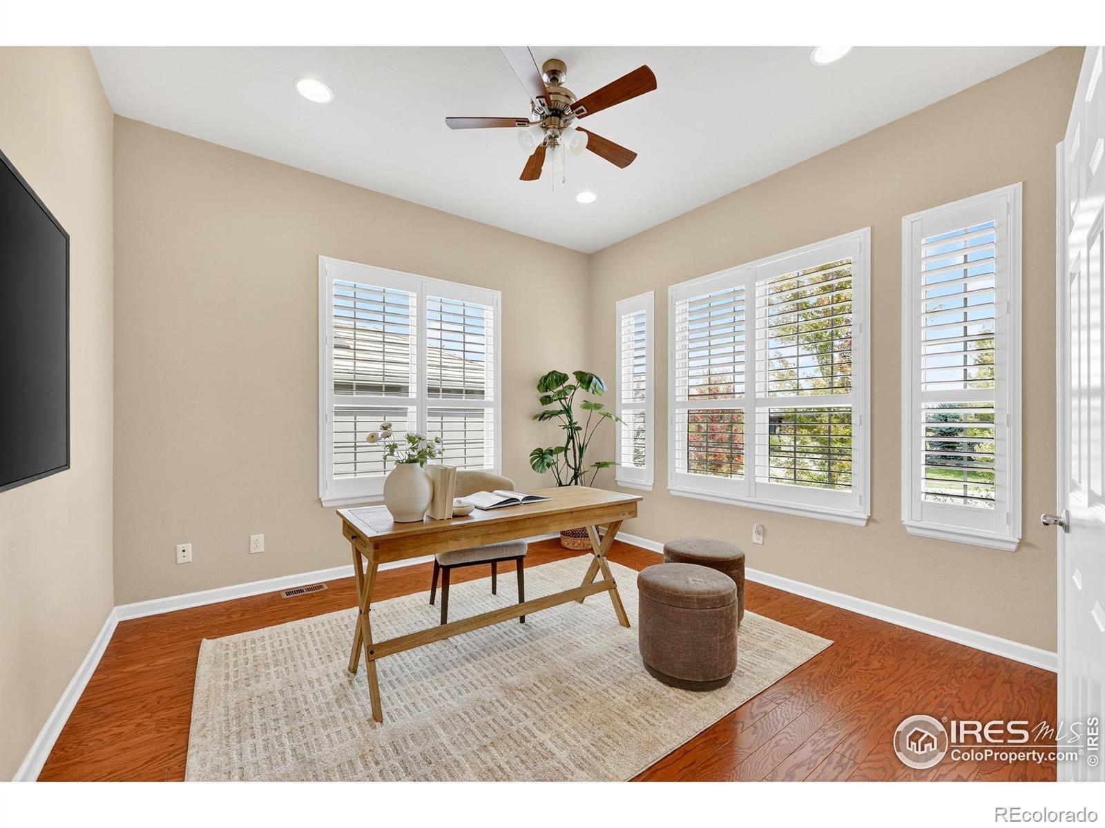 Experience resort-style living in Anthem Ranch, Broomfield's premier 55+ community. With over 90 active clubs and groups, you'll find endless opportunities to stay engaged, from fitness classes, a state-of-the-art gym, an outdoor pool, hot tub, and stunning community center and 49 miles of trails that wind through the neighborhood and open spaces. Inside, this inviting home offers a warm and open layout with a cozy gas fireplace, wood floors, and plantation shutters throughout. The large kitchen with island and pantry is perfect for entertaining, while spacious bedrooms and a private office provide plenty of flexibility. An oversized two-car garage with additional storage is an added feature. Enjoy the beautifully landscaped yard and quiet setting-your ideal blend of comfort, convenience, and community. Very lightly lived in with one owner the past 9 1/2 years with no pets. With nearby shopping and dining, plus an easy commute to Denver or Boulder, this home truly has it all.