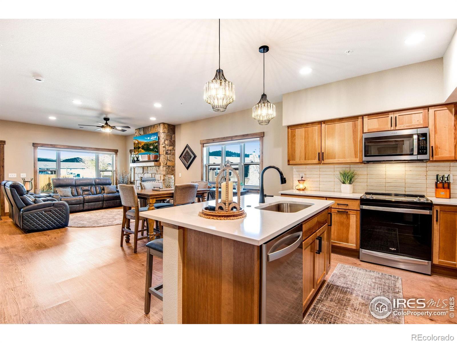 Welcome to this beautifully maintained end-unit townhome in the new Wildfire Subdivision-featuring the community's most popular floor plan and currently the only one available! Offering modern design, elevated finishes, and thoughtful upgrades throughout, this home is move-in ready and truly one of a kind. Inside, you'll find a bright and open layout enhanced by quartz countertops, durable LVP flooring, solid wood casings, and alder doors that highlight the home's craftsmanship. The main living spaces are filled with natural light, complemented by custom Hunter Douglas blinds and stylish new ceiling fans with upgraded controls. Additional electrical work, added outlets, and stairway lighting bring both convenience and function to daily living. Upstairs, the expansive primary suite offers a private balcony where you can enjoy fresh mountain air. The suite's closet has been upgraded with dual-height rods for added storage, while the laundry room includes custom shelving with a built-in drying rod. Even the garage entryway has been improved with an upgraded coat closet, blending practicality with thoughtful design. A screened front door completes the welcoming touches, making this townhome truly move-in ready. With its rare and highly desirable floor plan, prime end-unit location, heated and finished attached two car garage, and a long list of tasteful upgrades, this townhome checks all the boxes!