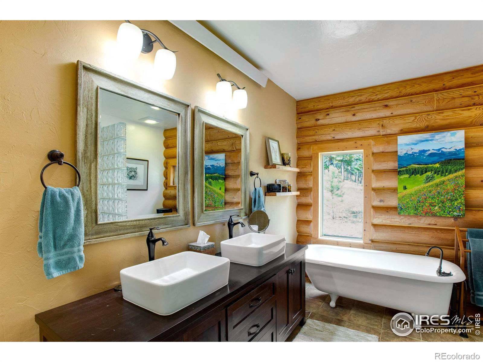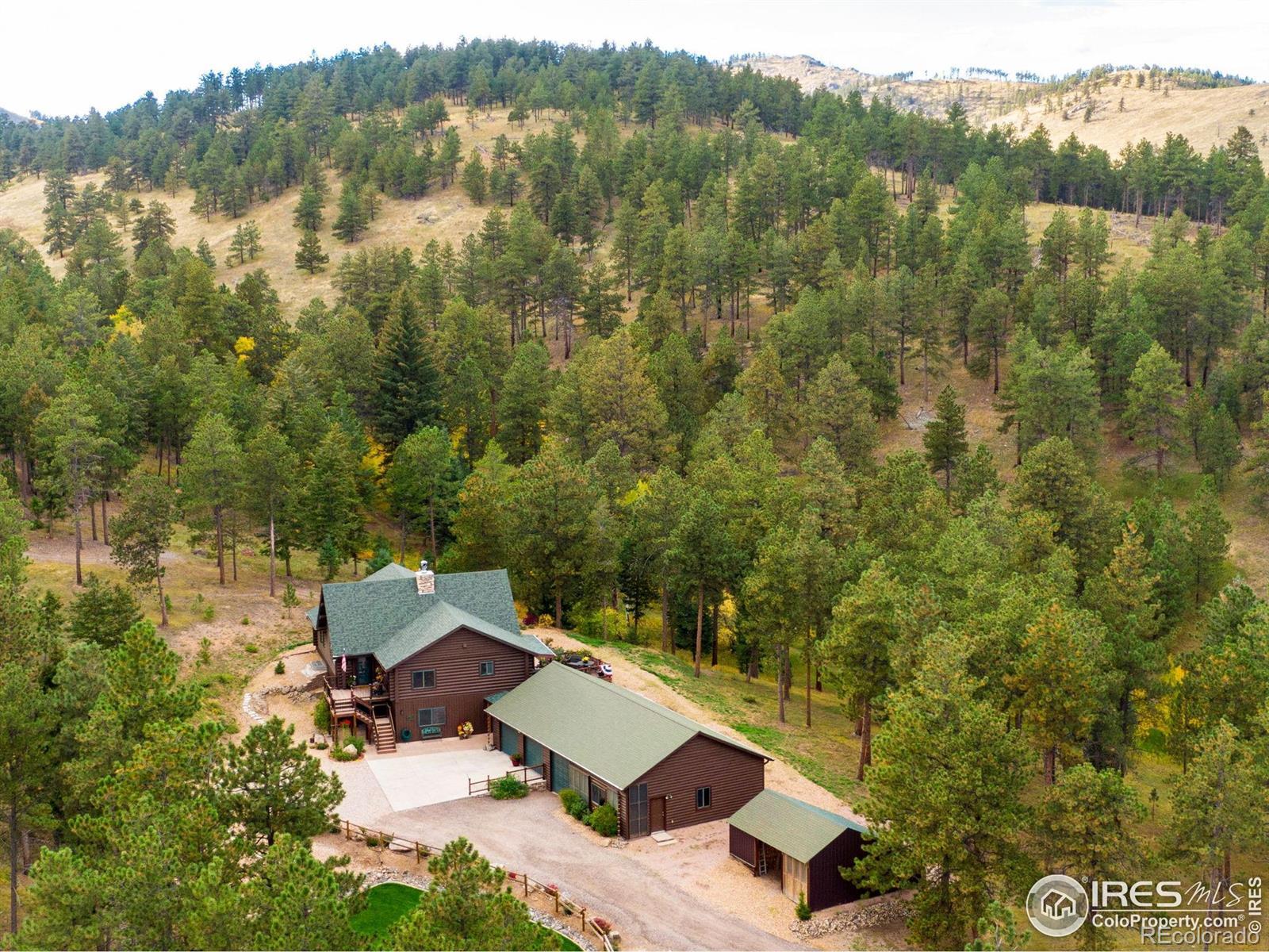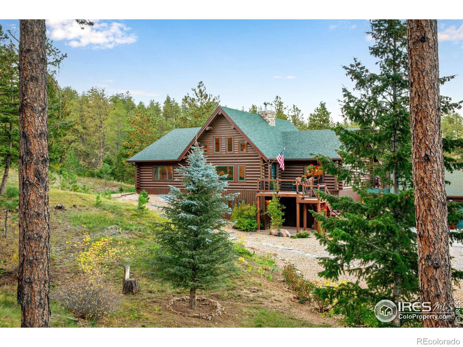 TURN KEY Option with all major furniture included. This luxurious log home sits on a 35-acre timbered lot and features abundant wildlife, a seasonal creek, rolling terrain, meadow and aspen grove. Located less than 30 minutes from Fort Collins, the property offers privacy and a true escape from the city. With 3,966 total sq. ft. and 3,638 finished, the home is solidly built and full of character and upgrades. Enter through a spacious grand foyer into a large living room with vaulted ceilings and an impressive floor-to-ceiling stone fireplace. The kitchen features granite slab counters, stainless steel appliances (all included), pantry, ample cabinetry and counter space. The primary suite offers a retreat with large closet and a 5-piece luxury bath including clawfoot tub, dual raised vanities and a spacious shower. Also on the main floor are a laundry, guest bedroom and an executive office that could serve as a TV room or formal living area. The walk-out basement includes a recreation room, family room with electric fireplace, wet bar, two additional guest bedrooms, a third full bath and two large storage areas, one designed as a cooled wine and food storage room. An attached 1,740 sq. ft. garage/shop provides ample space for vehicles and projects, complemented by a 625 sq. ft. covered wood storage area. Irrigated sodded area for fun and relaxation plus a front and back patio, water feature and so much more. Call today for a detailed feature list, floor plan or to schedule your private showing.