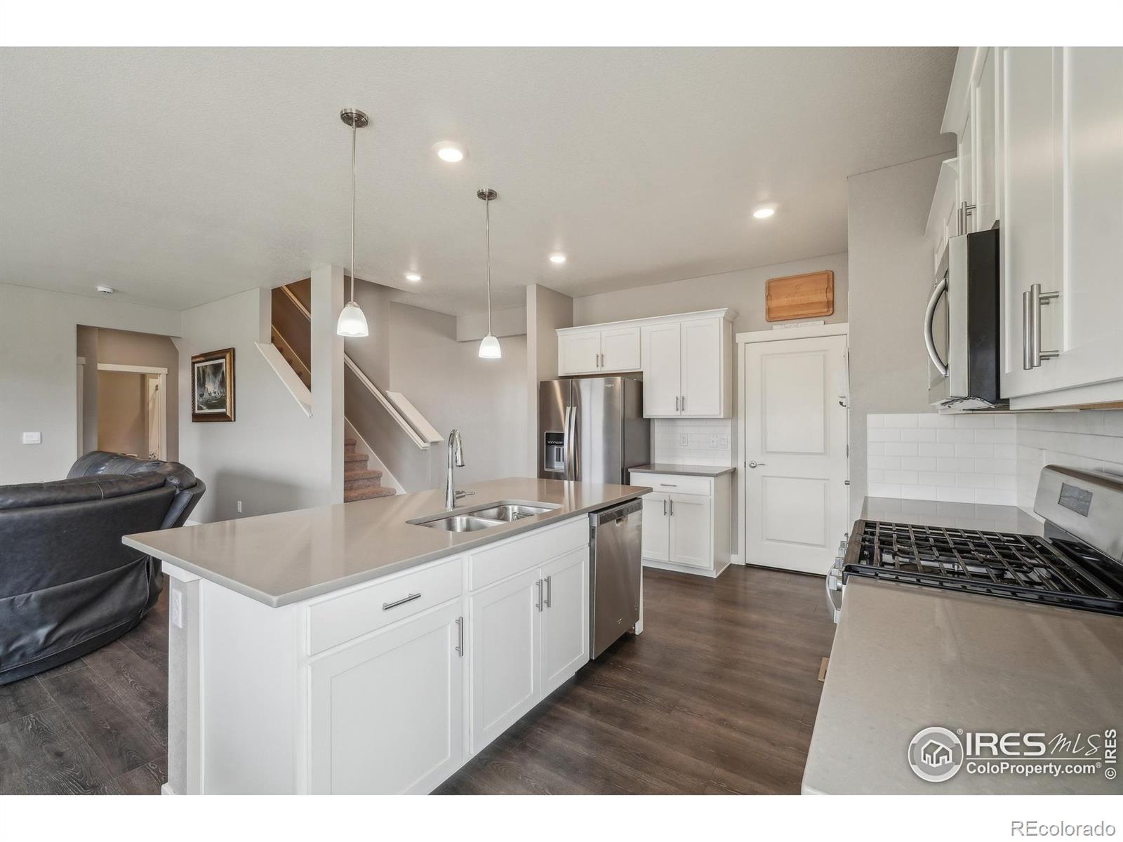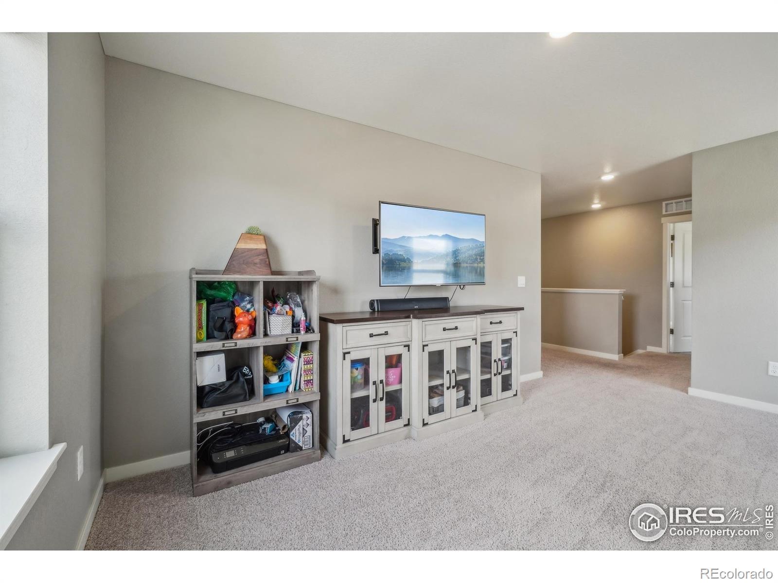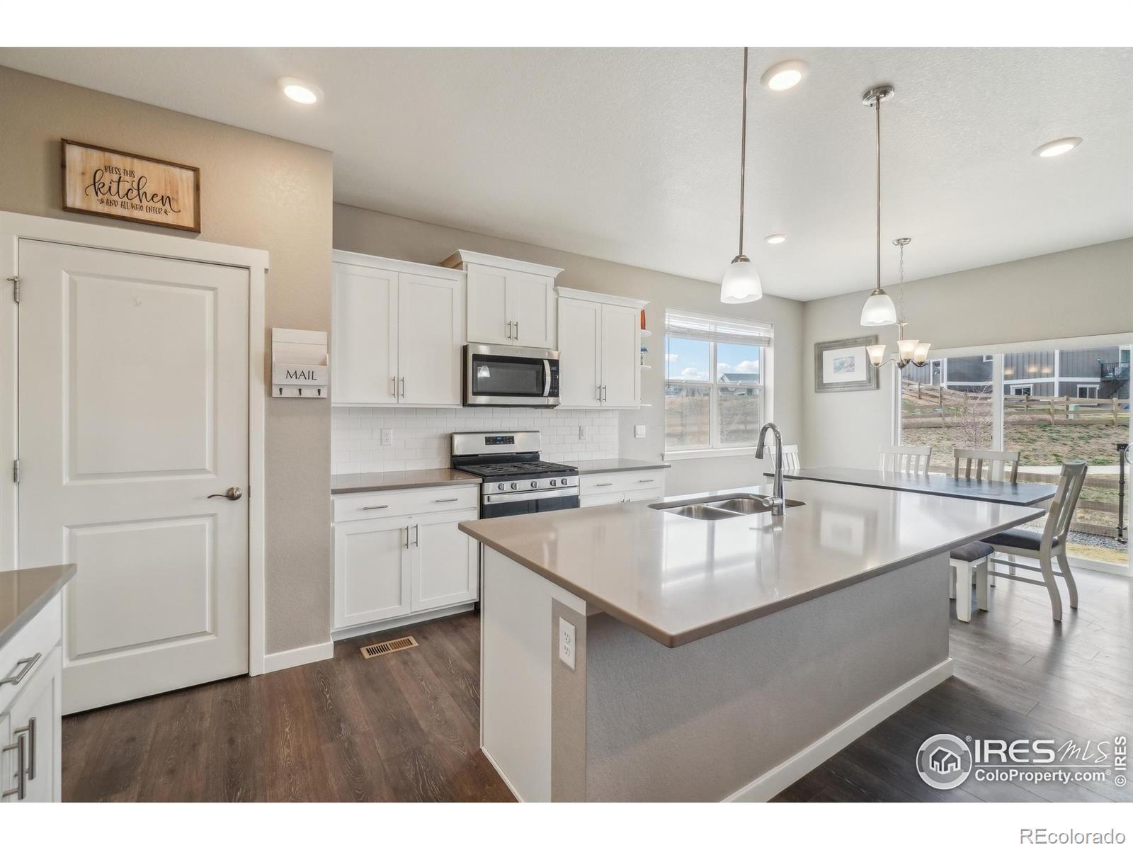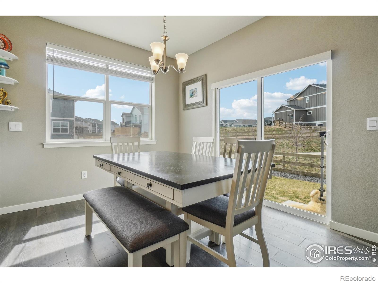 Welcome to this beautiful home in the desirable North Ridge Estates community of Greeley, perfectly situated on a prime lot bordered by HOA greenbelt to the south and behind the property, giving you easy access to walking trails! Enjoy your morning coffee on the charming covered front porch, soaking in the peaceful surroundings. Inside, natural light fills the front formal dining room or office space, offering a versatile area to suit your needs. The open-concept main living area seamlessly connects the kitchen, dining area, and living room, creating the perfect space for entertaining. The kitchen features quartz countertops, stainless steel appliances, a pantry, and an island with sink and seating, while the eat-in area opens to the backyard through sliding glass doors. The main floor also includes a bedroom and full bath, plus access to the attached two-car garage. Upstairs, a bonus loft space provides endless possibilities-use it as a playroom, office, or second living area. The spacious primary suite includes a private en-suite bath, while three additional bedrooms share a full bath with dual sinks, ensuring plenty of space for all. A convenient upstairs laundry room adds to the home's thoughtful layout. Custom top-down, bottom-up blackout shades in all bedrooms offer privacy and comfort. Step outside to the fenced backyard, featuring a storage shed, lawn space, and direct access to the greenbelt. With another common green space just across the street, this home feels extra private and open, providing a true sense of tranquility. Don't miss this incredible opportunity to enjoy peaceful living with easy access to outdoor recreation, schools, and everyday conveniences!