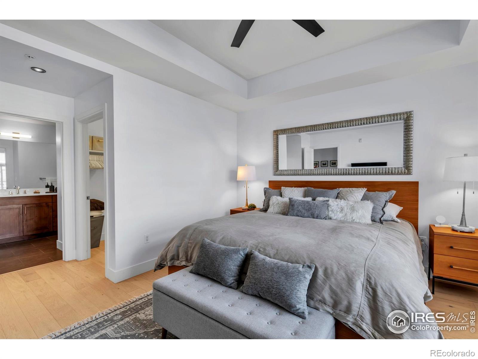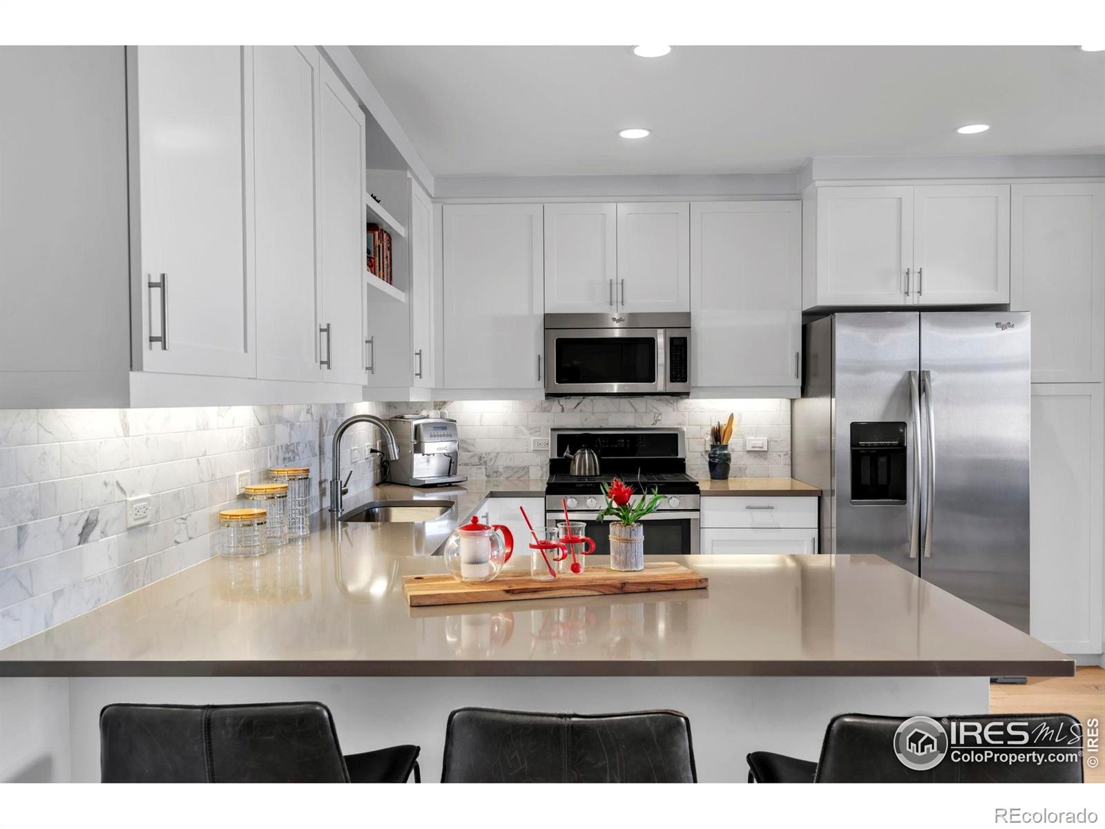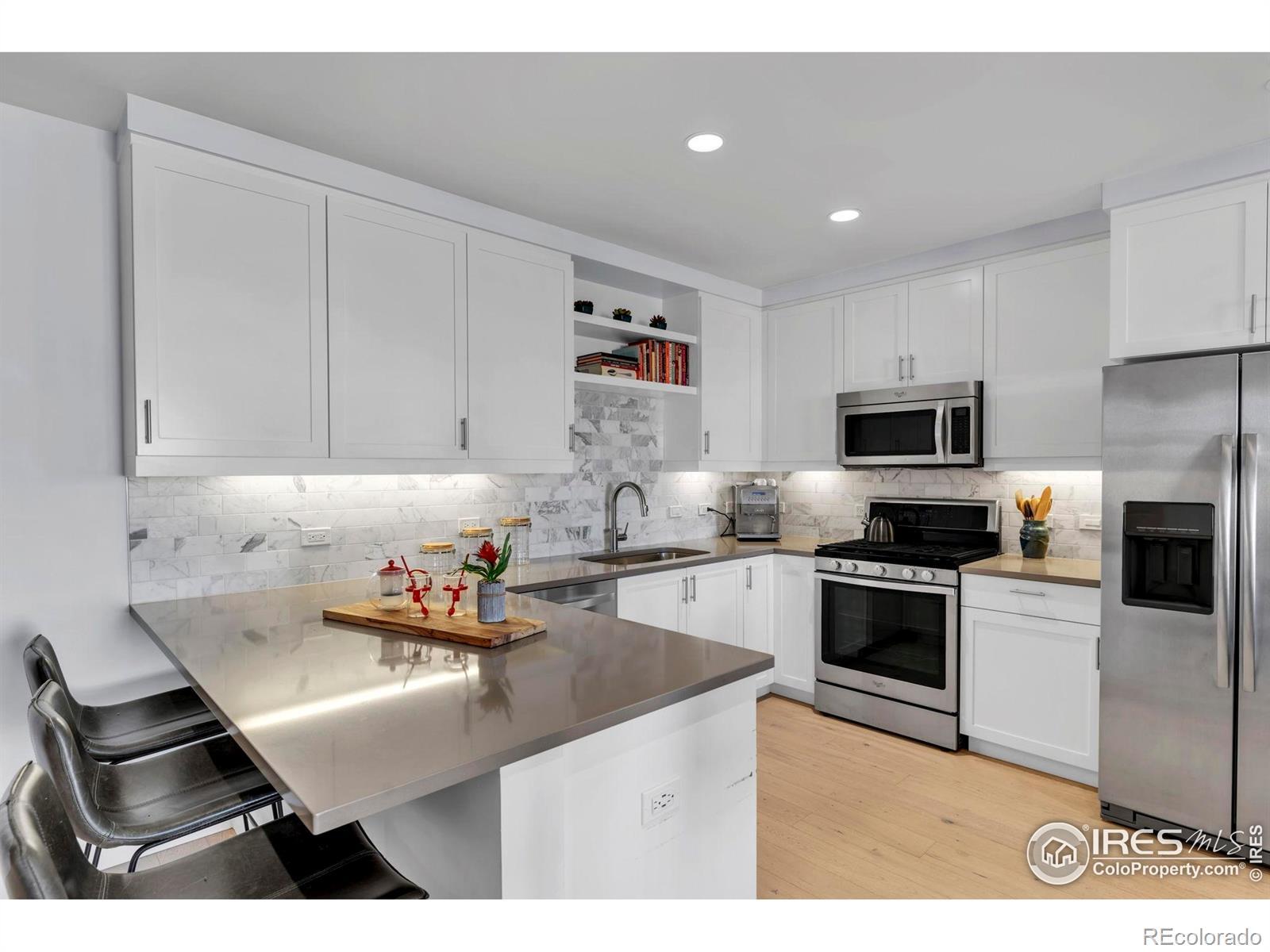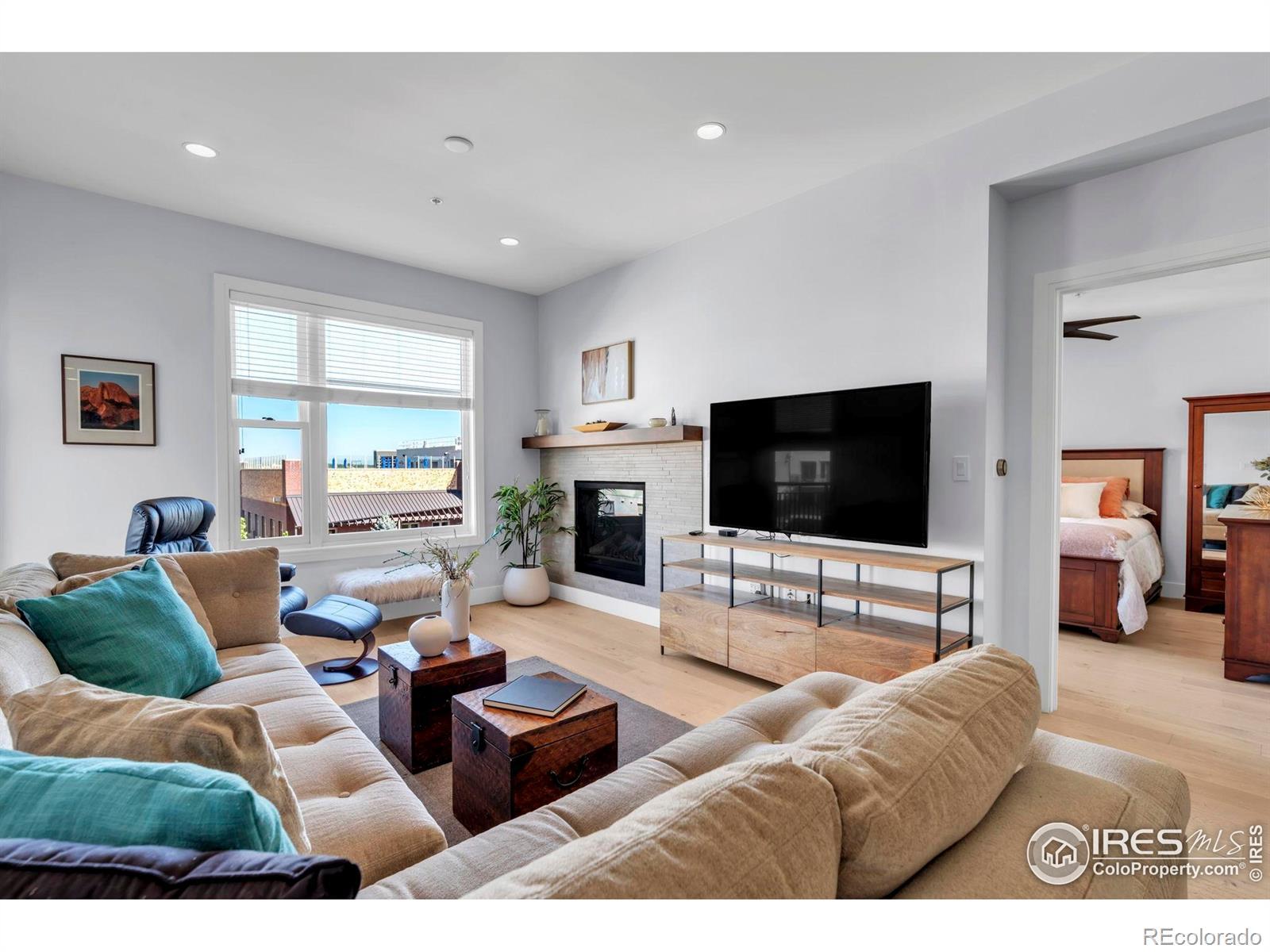Situated above a Quiet Courtyard in the desirable Peloton Community, this 4th-Floor Condo offers 2 Bedrooms, 2 Bathrooms, and a Bright, Open Layout built for Modern Living. Large Windows bring in plenty of Natural Light, while Wood Floors and Quality Finishes add Comfort and Style.The Kitchen is equipped with Quartz Countertops, Stainless Steel Appliances, White Cabinetry, and a Custom Tile Backsplash-great for Everyday Use or Entertaining. The Living Room features a Gas Fireplace and access to a Private Balcony, perfect for Morning Coffee or Evening Sunsets. The Primary Suite includes an Ensuite Bathroom and generous Closet Space. The Second Bedroom works well for Guests, a Home Office, or a Fitness Area. The Oversized Walk-In Laundry Room provides extra Storage for Bikes, Luggage, or Seasonal Items. Two Reserved Garage Parking Spaces (574 & 575) add Convenience. The Peloton's Amenities are a highlight, with a Rooftop Deck, Year-Round Heated Pool and Hot Tubs, Mountain Views, a Private Movie Theater, and a full Fitness Center. Located in Central Boulder, you'll be close to 29th Street Mall, Google, Foothills Hospital, CU Boulder, and Local Favorites like Whole Foods, Trader Joe's, Basta, Dry Storage, and Naked Lunch. Storage Unit 127 (Largest Available Size) is available separately for $25,000. All Furniture is available for $12,000. HOA dues cover: Water, Sewer, Trash, Ext Maintenance, Ext Hazard Insurance, Covered Parking, Management, Common Utilities, High End Amenities.