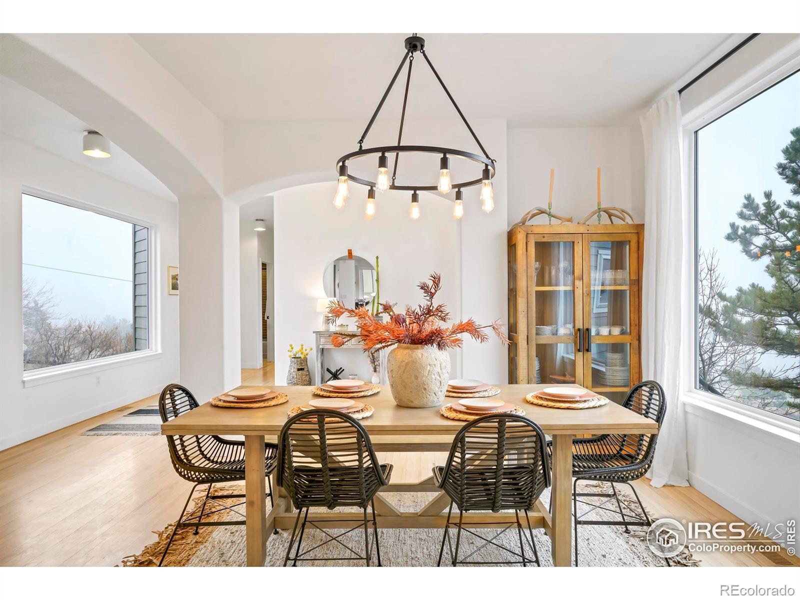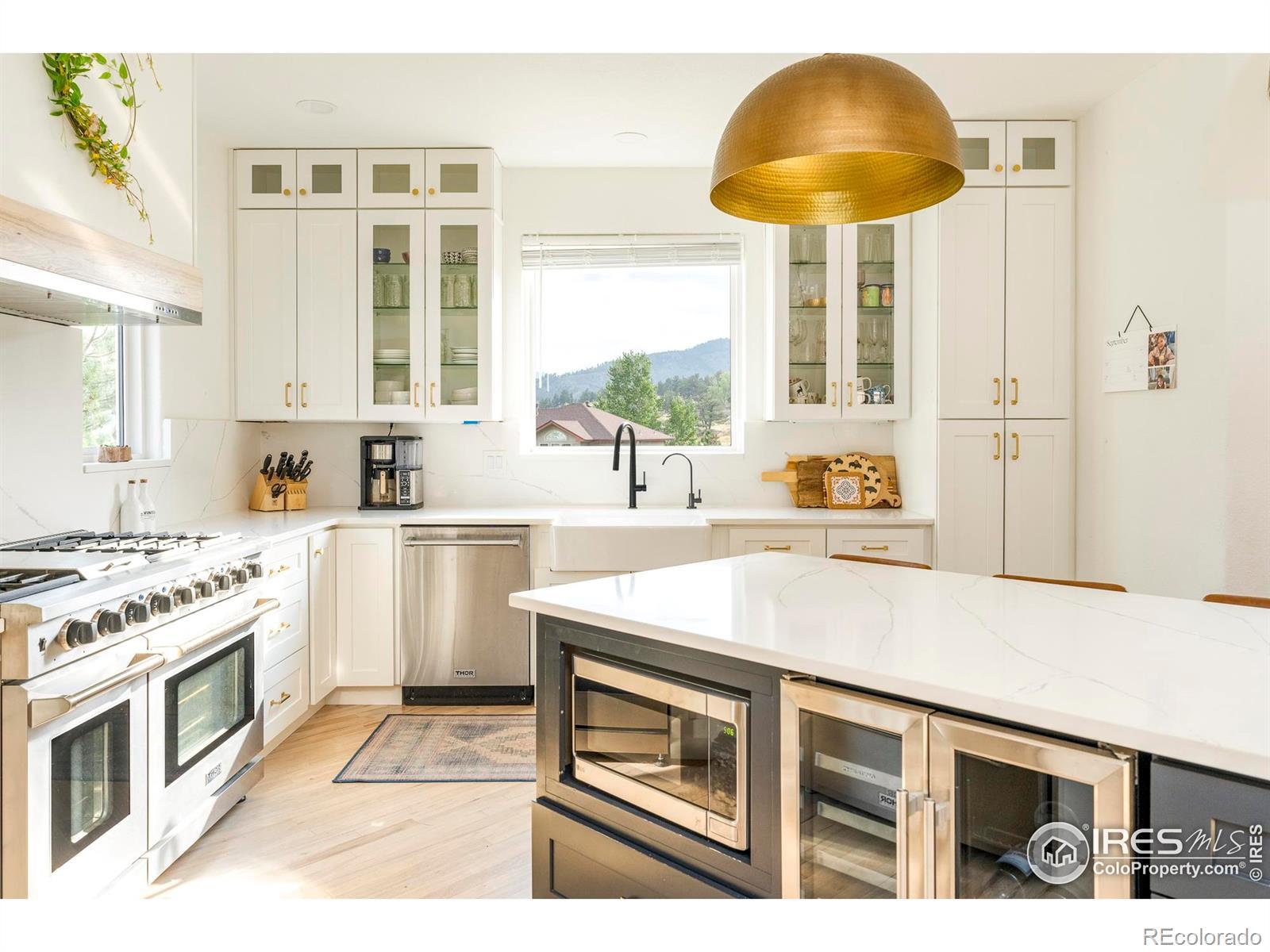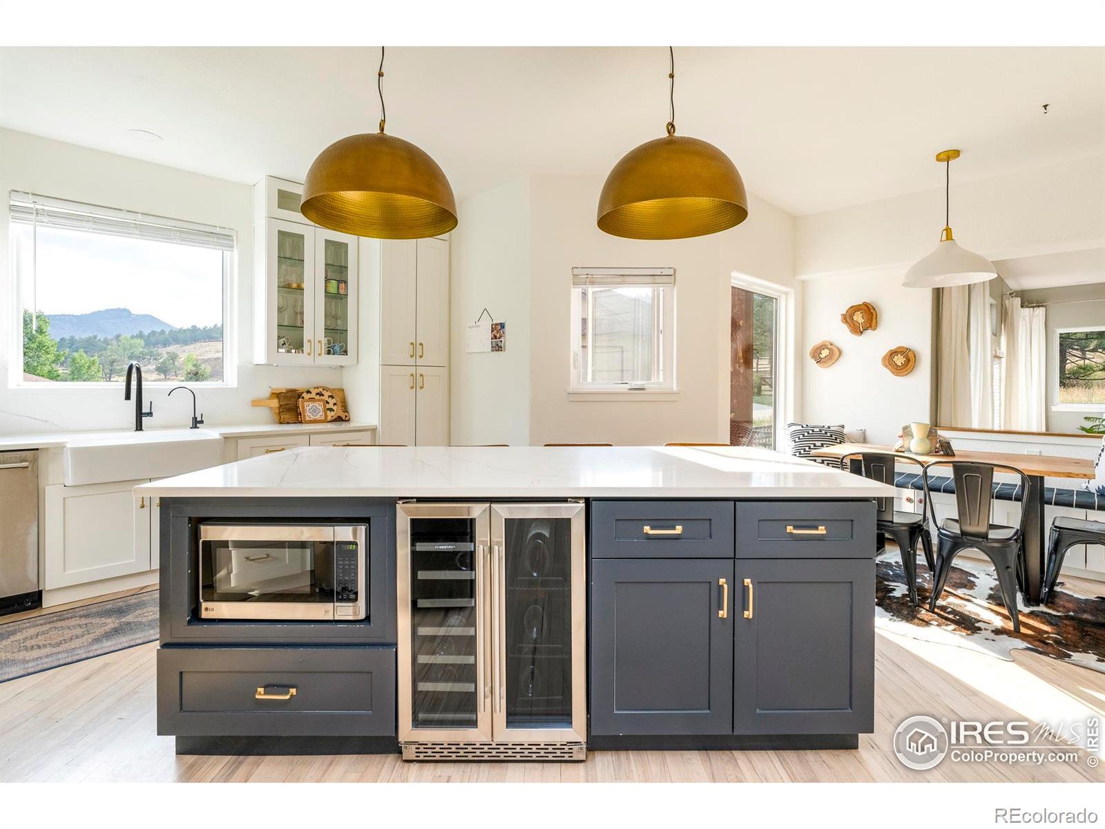 A Crown Jewel of Steamboat Valley, this carefully crafted estate is coming to market after extensive designer driven renovations, making it a truly unique + rare offering for the Lyons market. Unparalleled views, luxe amenities and unmistakable character come together to reset the standard for Colorado living, all situated on nearly a 1/2 acre lot. A bright, open-concept flow characterizes an entertainer's layout where endless panoramas are captured through wide expanses of strategically placed windows. Host with ease in a kitchen built for home chefs with a double oven, island with seating and a built-in corner dining nook. Surrounded by windows on three sides and anchored by a fireplace, the living room provides a cozy retreat with easy access to the deck. The fenced-in backyard is a private oasis, bordered by pasture land where the only neighbor in sight may be the occasional visiting horse, or wildlife passing through. Among the home's well-appointed bedrooms is a primary suite tucked beneath vaulted ceilings and equipped with a private deck. The en-suite bathroom showcases spa-like rejuvenation with a soaking tub and spacious walk-in closet. Additionally, two upper-level bedrooms offer the convenience of en-suite bathrooms, and welcomed separation from the primary suite. Accessible via staircase or a custom slide, the lower level affords additional space to entertain with a mini bar, a guest bedroom, office, and designer bathroom. The versatile walk-out basement is also a turn-key opportunity for multigenerational living, or AirBnB/rentable space (buyer to do their own diligence) with it's own private entrance. This home offers all of the conveniences of close proximity to Lyons (even via golf cart) while excelling in the wonder of Rocky Mountain living through expansive mountain + valley views, indoor/outdoor living, and a carefully curated interior.