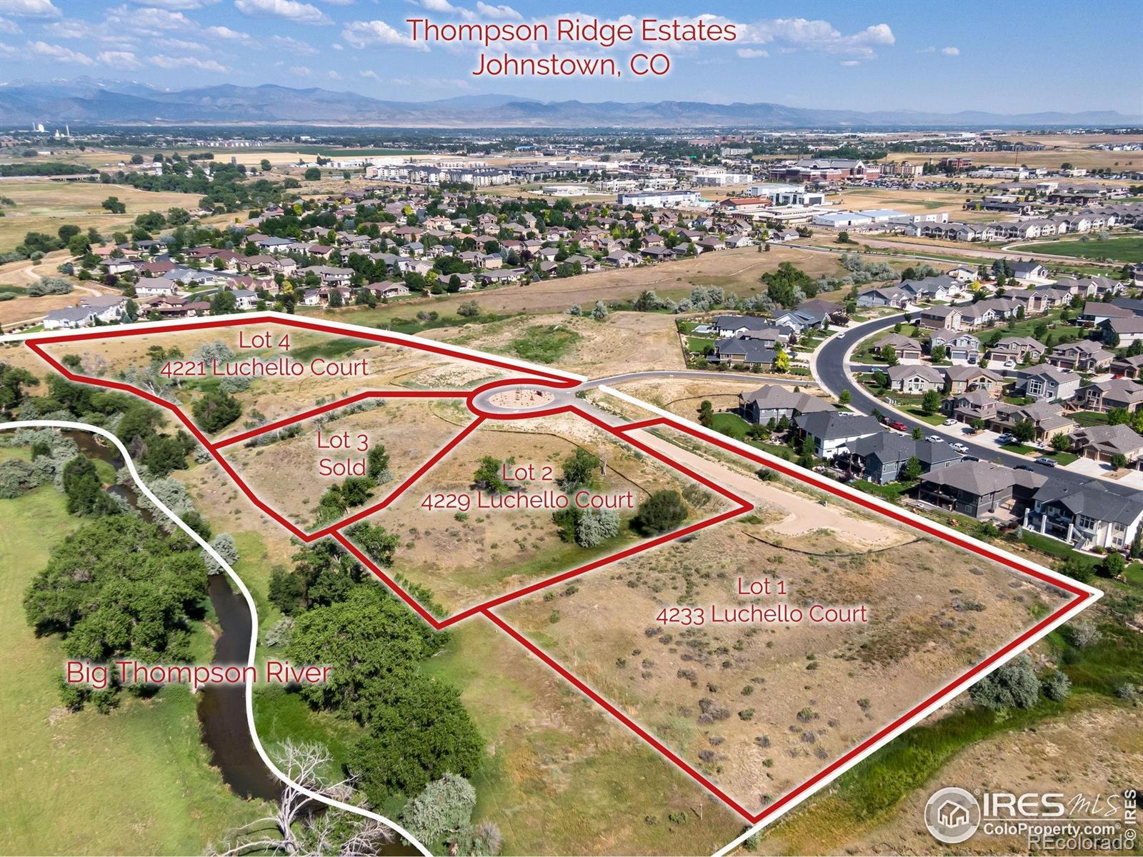 Welcome to Thompson Ridge Estates, a river front, 20-acre residential haven in Johnstown Colorado, boasting nearly 9 acres of preserved natural grasslands and native landscape. This premier and exclusive community, set along the Big Thompson River, offers just four developed lots, each with a distinct character, panoramic views of the Rocky Mountains/Big Thompson River, and abundant wildlife, including wild turkeys, birds, and white-tailed deer. The lots are not just a plot of land, they are a canvas to creative architecture design set to accommodate custom homes tailored to personal tastes, with options for full walk-out basements and large additional outbuilding. Situated on a ridge above the river, the properties promise a peaceful and desirable lifestyle with easy access to I-25. This central location is a short drive to Fort Collins, Loveland, Windsor and commutable to Boulder and the Denver metro area. Local amenities, such as shopping, schools, and dining, add convenience to the secluded charm of the Estates. With its rarity and natural beauty, Thompson Ridge Estates offers a unique opportunity to create a personalized retreat to enjoy for years to come. Custom design/build services can be offered with developers preferred builders. Raw water dedication to be purchased through Developer at time of closing. Water and Sewer tap fees, Contact the Town of Johnstown for a fee schedule. Contact Agent for further details and lot tours.
