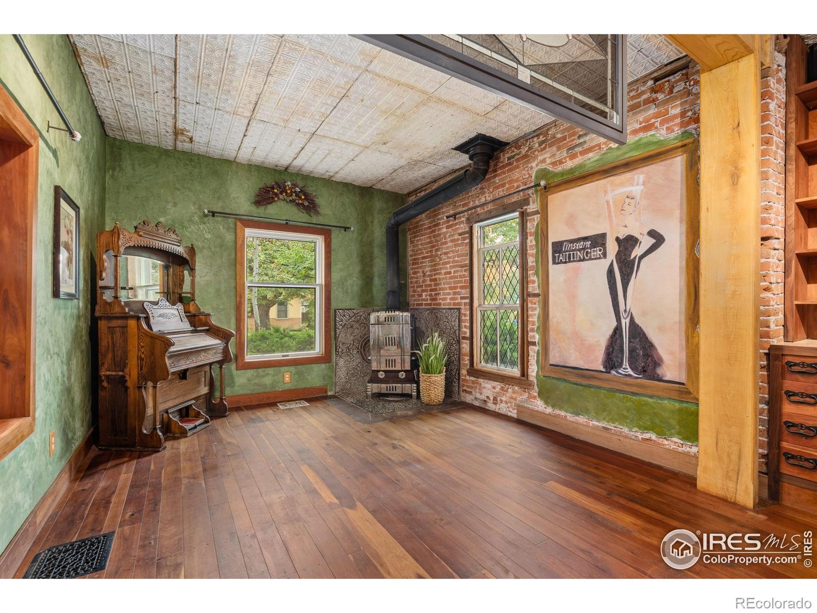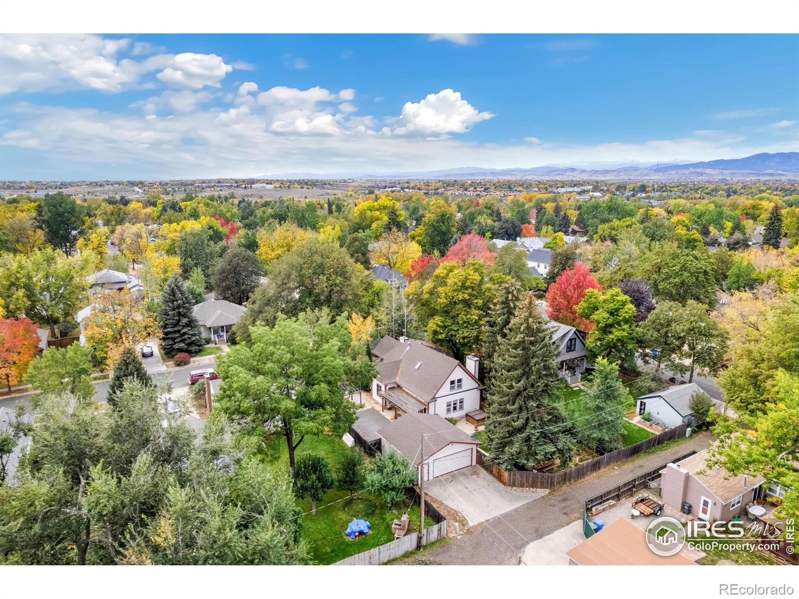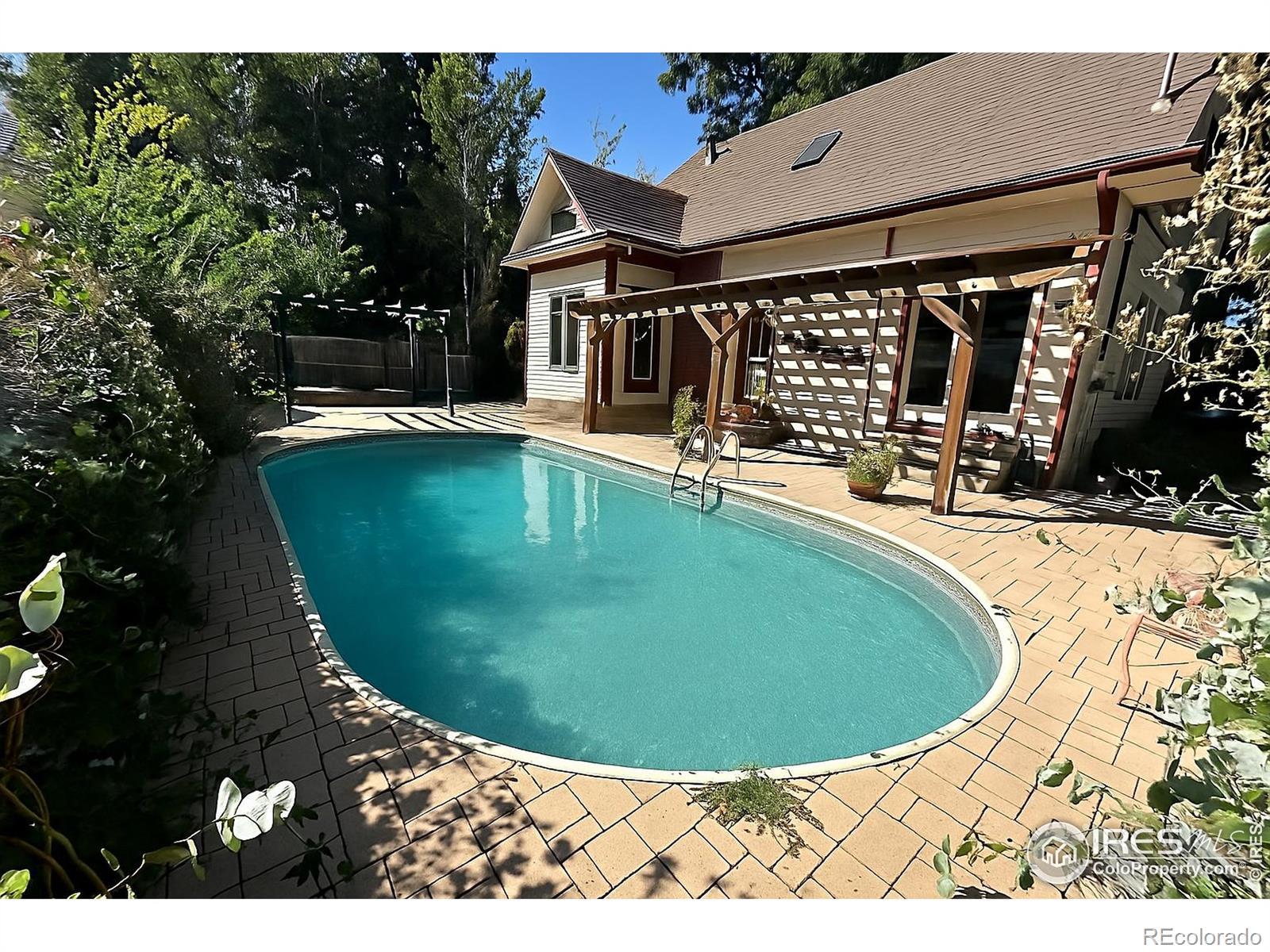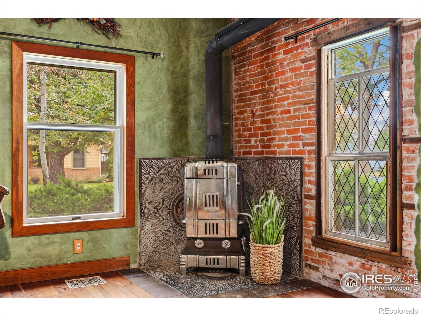 Charming and timeless 1945 brick 2-Story in the heart of Loveland! This inviting home blends vintage craftsmanship with thoughtful updates and warm, welcoming spaces. Check out 3D virtual tour! Beautiful wood floors and high ceilings flow through much of the main level, complementing the natural light. Enjoy your morning coffee in the charming sunroom (in mls as rec room), overlooking the swimming pool and pergola with peaceful views that make every day feel like a retreat. Inside, the front living room features a pressed tin ceiling, elegant wood stove, and the original organ with ornate woodwork and mirrored top-an heirloom piece that stays with the home. A vintage L'Instant Taittinger poster featuring Grace Kelly adds a touch of Hollywood glamour to the space. The kitchen combines old-world charm with modern convenience: built-in refrigerator, gas range, microwave, and pantry, butler serving area plus a sink and dishwasher area along the sunroom wall. Plenty of space to spread out while cooking and entertaining. A main-floor bedroom, and bath with clawfoot tub, pull-chain toilet, add to the home's authentic vintage character. The family room with a cozy fireplace offers easy access to the backyard, where you'll find a hot tub and raised garden beds ready for your green thumb. Upstairs, a bonus room makes a perfect playroom, yoga space, or studio. The primary bedroom boasts cedar-lined closets and an adjoining room ideal for an office, art space, or reading nook or close the wall and make another bedroom. Full bath with shower and shared hall sink offers practicality and charm. Oversized two-car garage with alley access and front parking completes this rare find. A truly unique Loveland classic-filled with history, warmth, and personality.