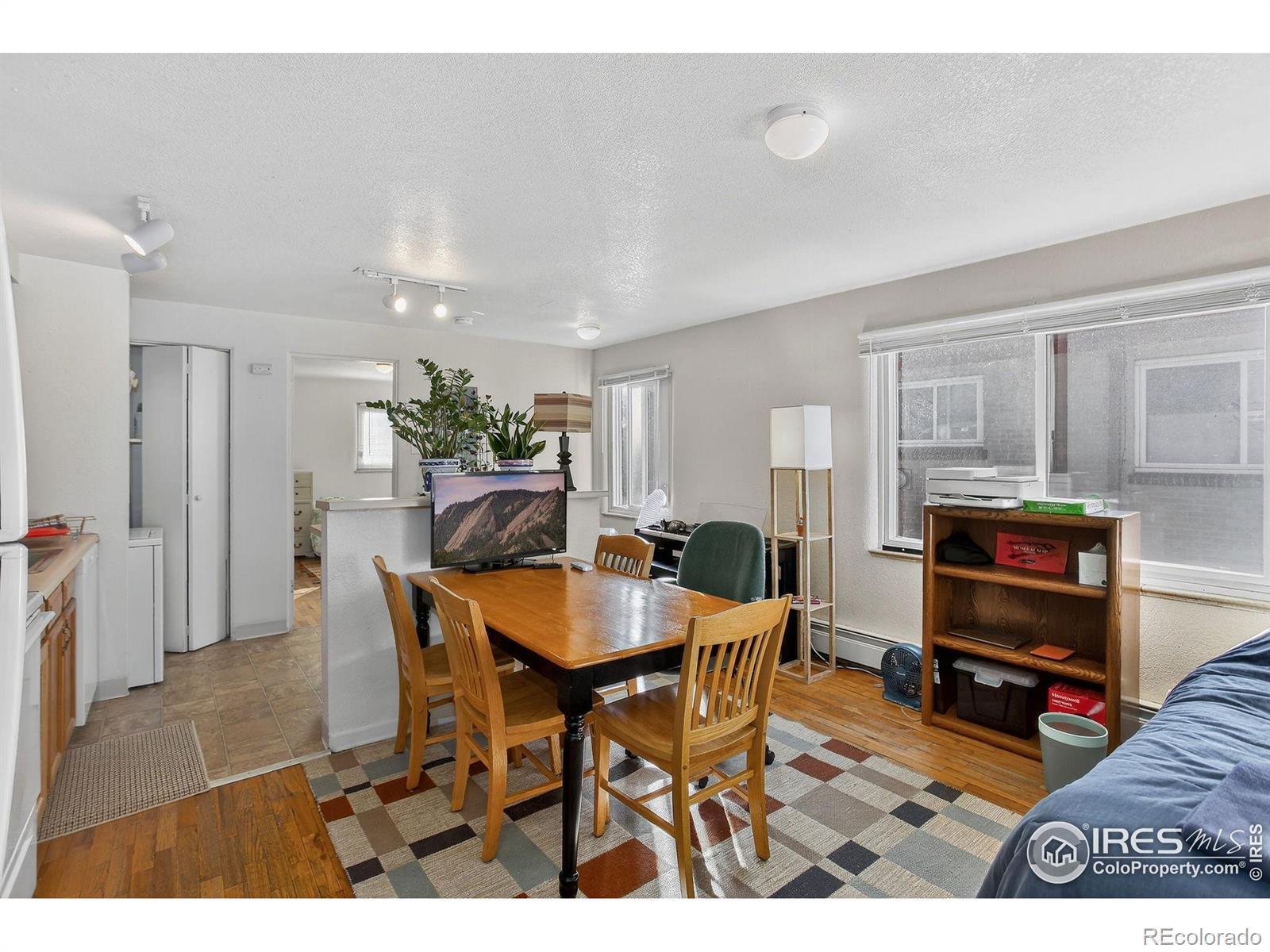 Unbeatable location just steps from the University of Colorado Boulder! This bright and efficient one-bedroom, one-bath condo offers the perfect blend of comfort, convenience, and value. Situated in a small, well-maintained building with secure entry, this 464 sq ft unit is ideal for students, investors, or anyone seeking a low-maintenance home in the heart of Boulder.The open-concept layout feels spacious and inviting, with natural light streaming through multiple windows. The kitchen offers generous cabinet space, full-size appliances, and an eat-in dining area that connects seamlessly to the living space. Durable flooring throughout makes upkeep simple and practical.In 2024, the bathroom was updated with a brand-new bathtub and surround-providing a clean, refreshed feel. The bedroom comfortably fits a full furniture set and has convenient access to the ensuite bath. A stackable washer and dryer are tucked neatly within the unit for ultimate convenience.Residents enjoy a shared outdoor patio area perfect for studying, relaxing, or grilling under Boulder's blue skies. Off-street parking behind the building is available on a first-come, first-served basis, eliminating parking hassles.With CU Boulder directly across the street, as well as easy access to shops, coffee houses, and public transportation, this condo offers an exceptional investment opportunity and a rare chance to live in one of Boulder's most sought-after locations.