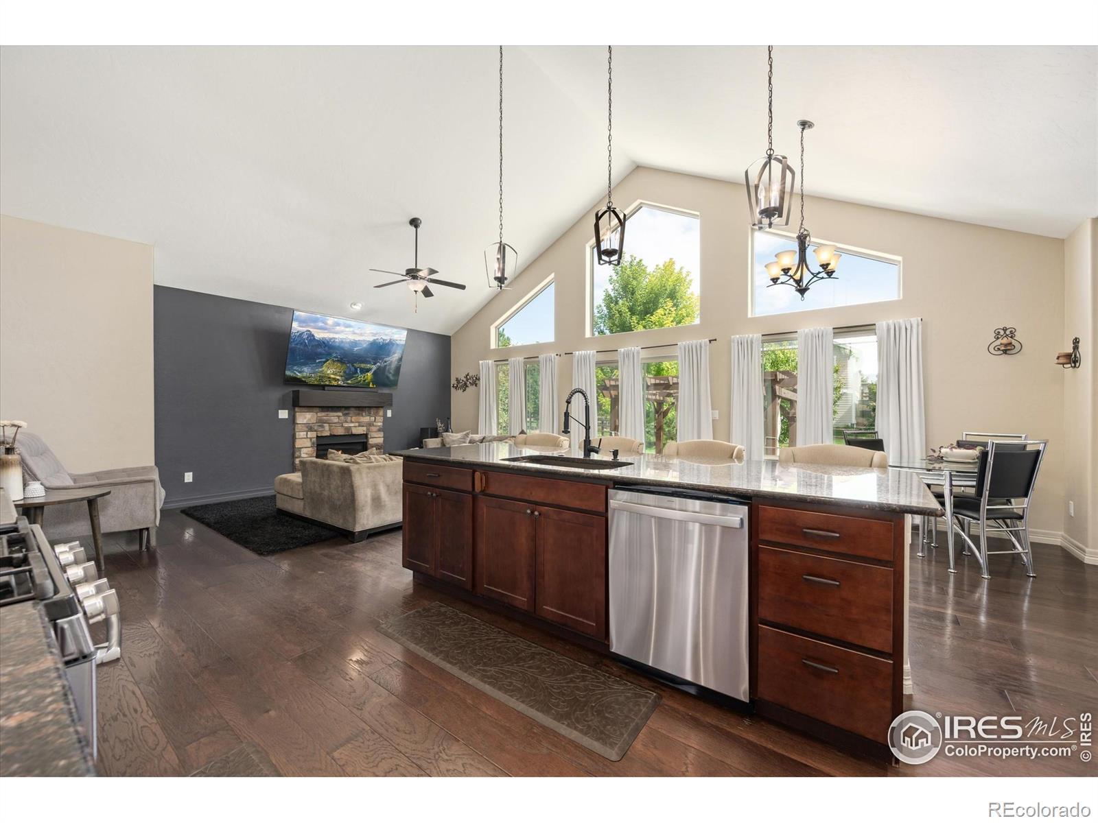 Fall in love w/ this stunning ranch home that checks every box! Step inside to find gorgeous wood flooring throughout much of the main floor, vaulted ceilings, abundant natural light, custom light fixtures & a spacious layout designed for everyday living & entertaining. The chef's kitchen is a showstopper w/ stainless steel appliances, gas range, dual ovens, microwave/convection oven, brand new dishwasher, oversized granite island, pendant lighting & plenty of storage. Enjoy meals in the connecting dining space! The large family room w/ a gas stone fireplace is the heart of the home while the tiled laundry room w/ sink & cabinetry makes chores a breeze! The luxurious primary retreat features coffered ceiling, a spacious walk in closet & a en-suite spa-like bathroom w/ dual granite vanities, a deep soaking tub & spectacular floor-to-ceiling tiled custom shower-your private sanctuary for relaxation! Two additional bedrooms w/ oversized closets & another full bath w/ dual vanities round out the main floor. Downstairs, the finished basement wows w/ high ceilings, a massive rec room space w/ electric fireplace & an entertainer's wet bar w/ granite counters, walnut colored cabinetry, sink & beverage fridge. Two spacious bedrooms (one w/ en suite full bath) plus tons of storage make the basement as functional as it is beautiful! Step outside to your backyard oasis! Gather around the built-in gas fireplace-complete w/ gas line & framed by dramatic limestone boulders. Relax under the cedar pergola w/ cafe lighting & curtains & enjoy privacy w/ mature trees backing to manicured greenbelt space. Enjoy a beautifully designed & low maintenance garden setup w/ raised planter boxes perfect for growing vegetables in a elevated layout. To complement the planters, the yard is equipped w/ a comprehensive drip irrigation system for low maintenance living! A spacious 3-car garage, NO Metro District/LOW HOA FEE add extra value! Close to parks, shopping & restaurants! This home is luxury!