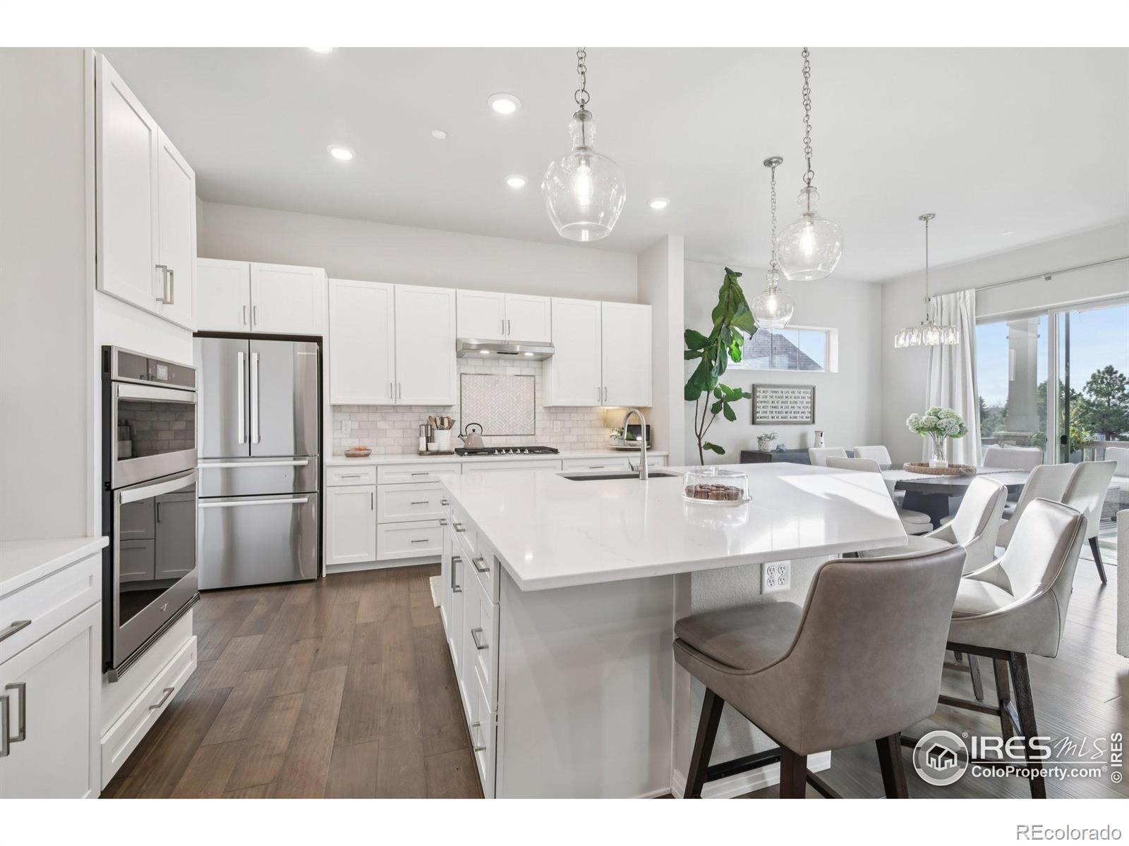 Looking for a newer, low-maintenance patio home in Superior, CO with mountain views, backs to open space and has solar power? Welcome to 1370 Lanterns Lane in the Lanterns at Rock Creek community, offering the perfect blend of luxury, convenience, lock-and-leave living, ideal for anyone seeking effortless Colorado comfort near Boulder and Denver. This 3 bedroom, 3 bath + office paired patio home welcomes you with bright, open spaces, 10' ceilings, & refined upgrades throughout. The main level features engineered hardwood floors, quartz countertops, & a custom Carrara marble backsplash hand-selected for timeless elegance. Pottery Barn pendant lighting elevates the design, while the dining area opens to a partially covered deck with Bear Peak mountain views, the perfect spot for morning coffee or sunset gatherings. The main-level primary suite feels like a spa retreat, featuring a Closets by Design walk-in closet & luxury bath finishes. A private office with glass-pane French doors provides a quiet workspace. Designer details: 3" baseboards, wood window sills, Pottery Barn curtains add a polished finish. The garden-level basement expands your living space with south-facing windows that flood the area with natural light. It's plumbed for a future wet bar & ideal for guests, hobbies, or multi-generational living. This home is built for modern sustainability with owned Tesla solar panels, a Tesla charger & low electric bills. The oversized 2-car garage includes overhead storage racks for maximum organization. Enjoy true lock-and-leave living with an HOA that covers all exterior maintenance: roof, siding, paint, landscaping, watering & snow removal. Located minutes from Downtown Superior, Flatiron Crossing & Boulder's best trails, this home combines energy efficiency, style, & convenience. For buyers searching for Superior CO patio homes for sale, energy-efficient homes near Boulder or low-maintenance Colorado homes with solar, this home stands out as a rare opportunity.