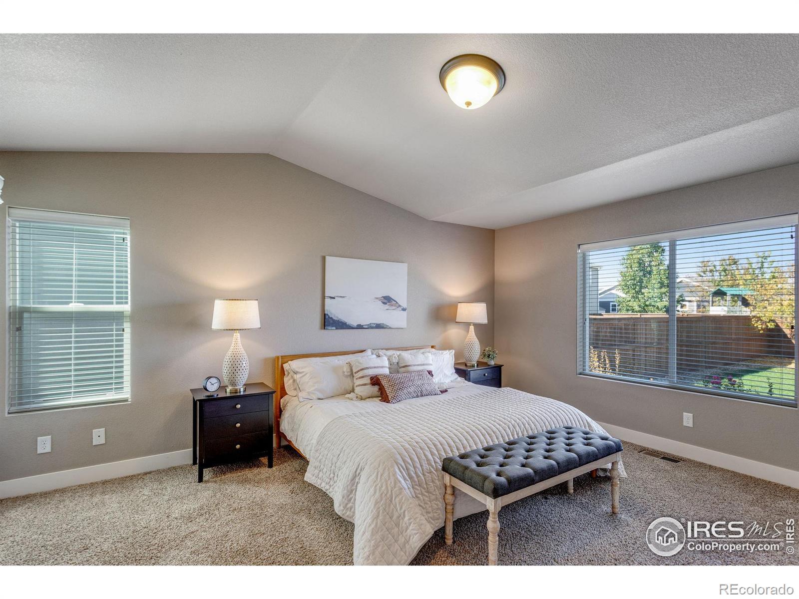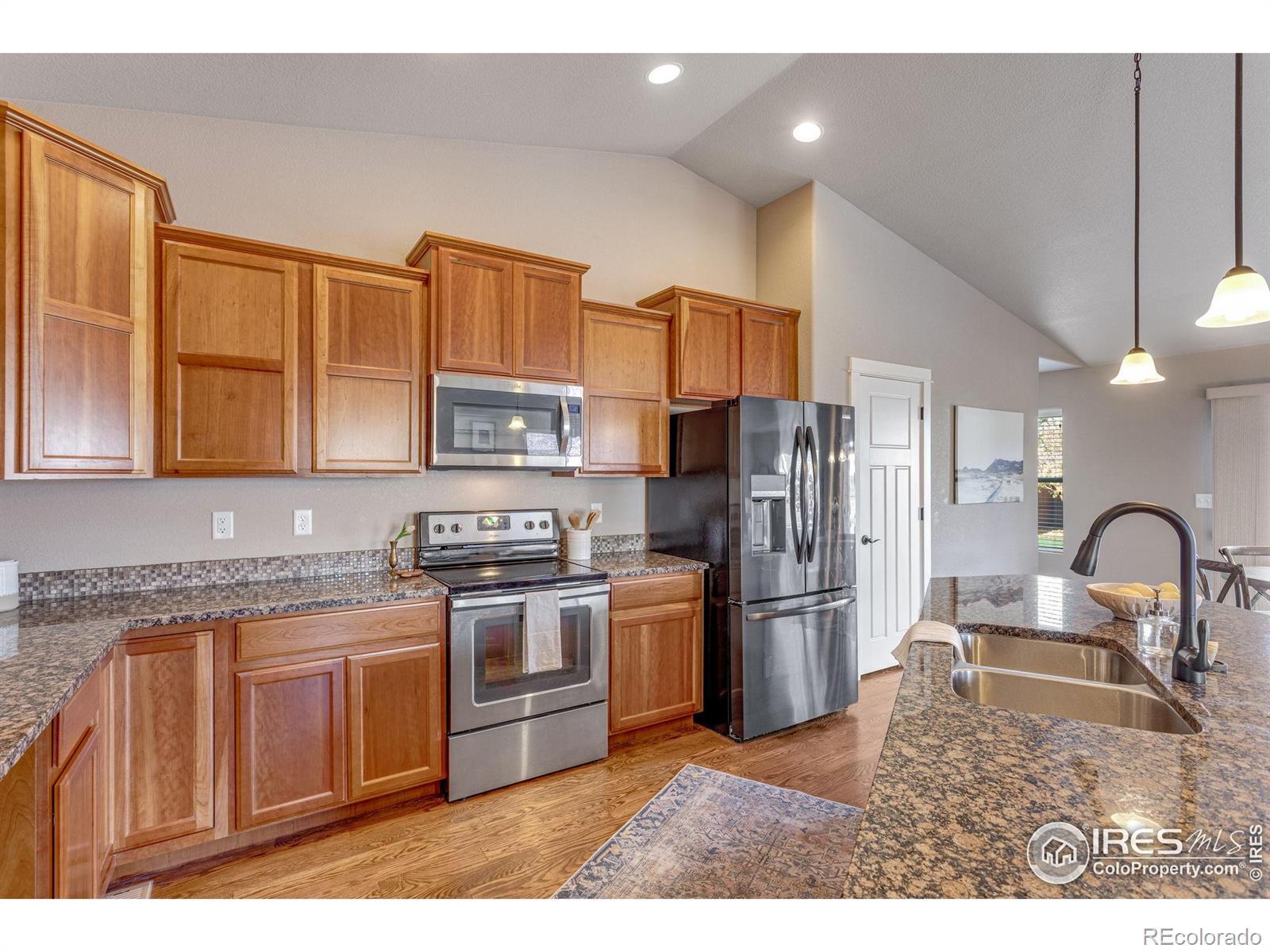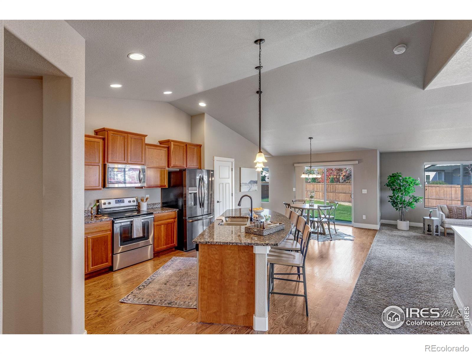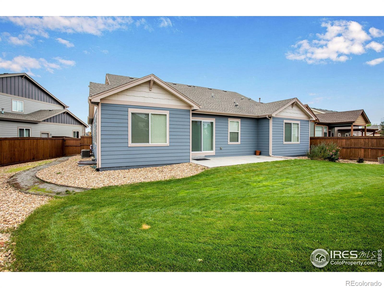 This spacious ranch-style home offers a thoughtful layout and modern upgrades. Relax on the front porch with views of lush greenery thanks to the park right across the street. Inside, the open-concept great room flows into the kitchen featuring a large island, sleek black stainless-steel refrigerator, pantry, and cabinetry with pullouts. Each bed has its own bath, offering ideal separation and comfort. The primary retreat is tucked away for ultimate privacy, complete with a generous walk-in closet that connects directly to the laundry room for added convenience. The finished basement is a standout feature, boasting a gigantic rec room, bed/bath, and massive storage room. Outside, enjoy a beautifully landscaped and fully fenced backyard featuring vibrant rose bushes and a raised garden box, both on a convenient drip irrigation system. Low HOA includes access to neighborhood pool, parks, and walking paths-perfect for outdoor enthusiasts and families alike.