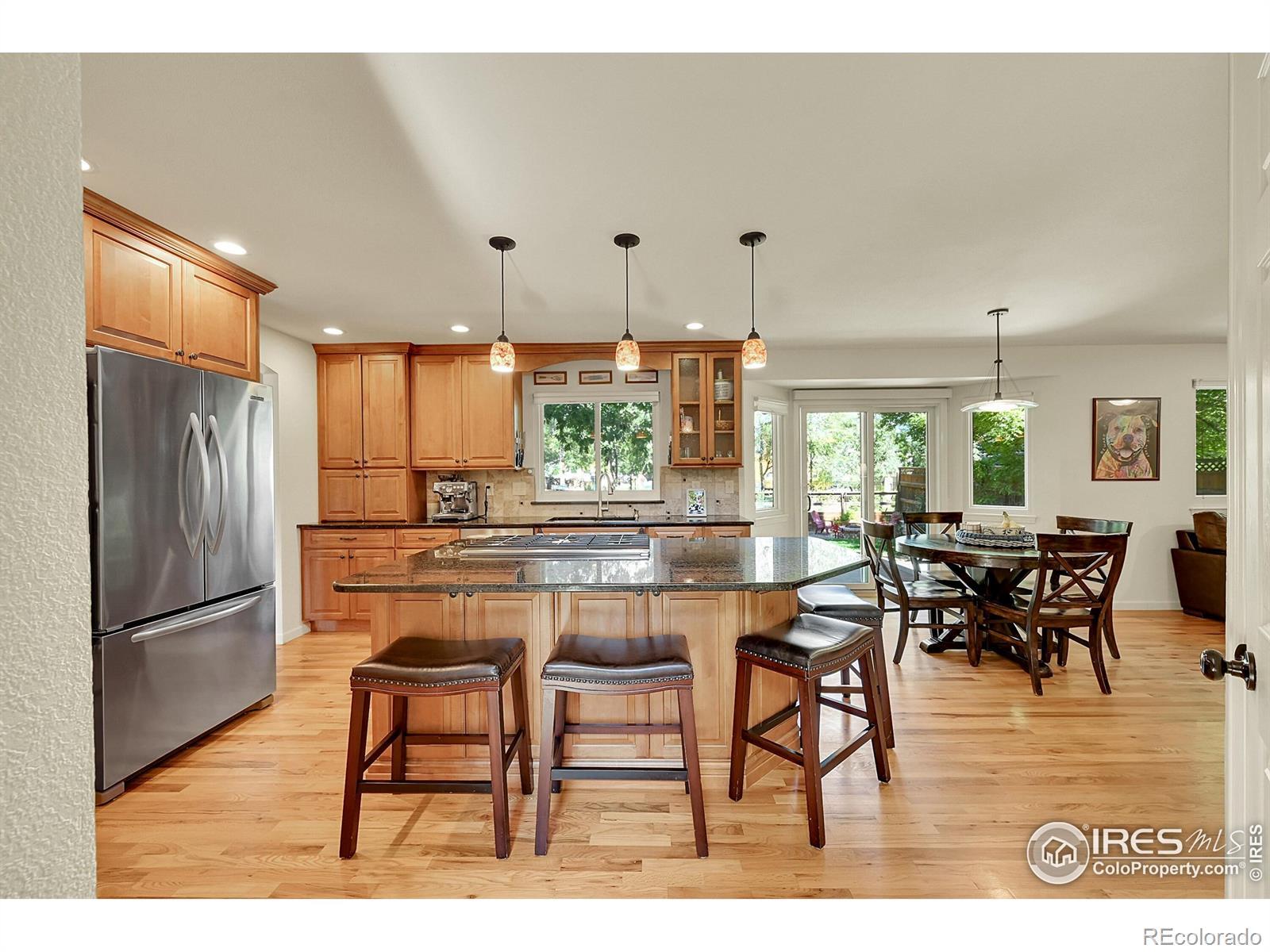 Beautifully Remodeled Home Near McIntosh Lake! Tucked away on a quiet cul-de-sac just a short distance from McIntosh Lake, this stunning 5-bedroom, 4-bath home shines with natural light and thoughtful updates throughout. The remodeled eat-in kitchen features granite countertops, maple cabinetry, a center island, gas cooktop, and stainless-steel appliances-ideal for any home chef. The inviting family/great room offers a cozy gas fireplace and built-in bar with beverage fridge, perfect for entertaining. Upstairs, the spacious primary suite boasts vaulted ceilings, a large walk-in shower, and a generous closet. Enjoy updates including Andersen windows, interior doors and trim, hardwood flooring throughout the main level, newer furnace, A/C, new hot water heater, and a composite deck. The private, fenced backyard is a true retreat with an expansive stone patio, raised garden beds, and plenty of space for gatherings or quiet relaxation. Just minutes from parks, trails, and the 3.5-mile McIntosh Lake loop for paddle boarding, canoeing, and outdoor adventures-this home offers the perfect blend of comfort, style, and Colorado living.