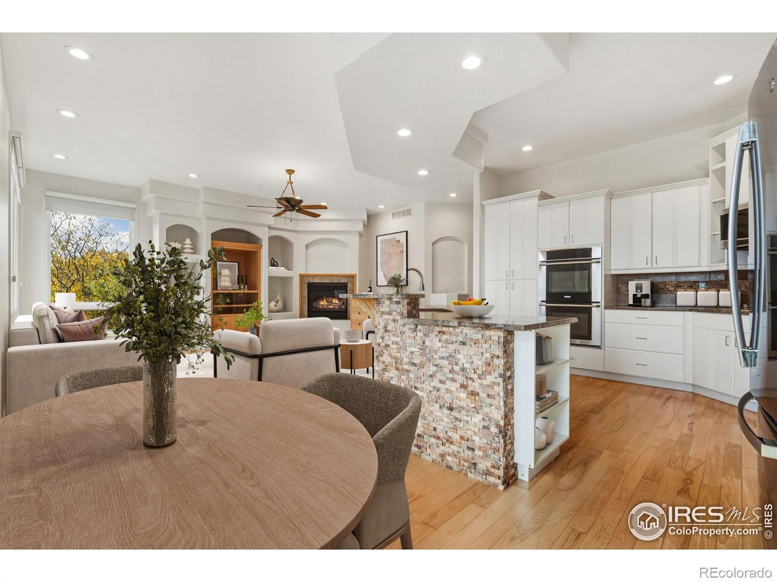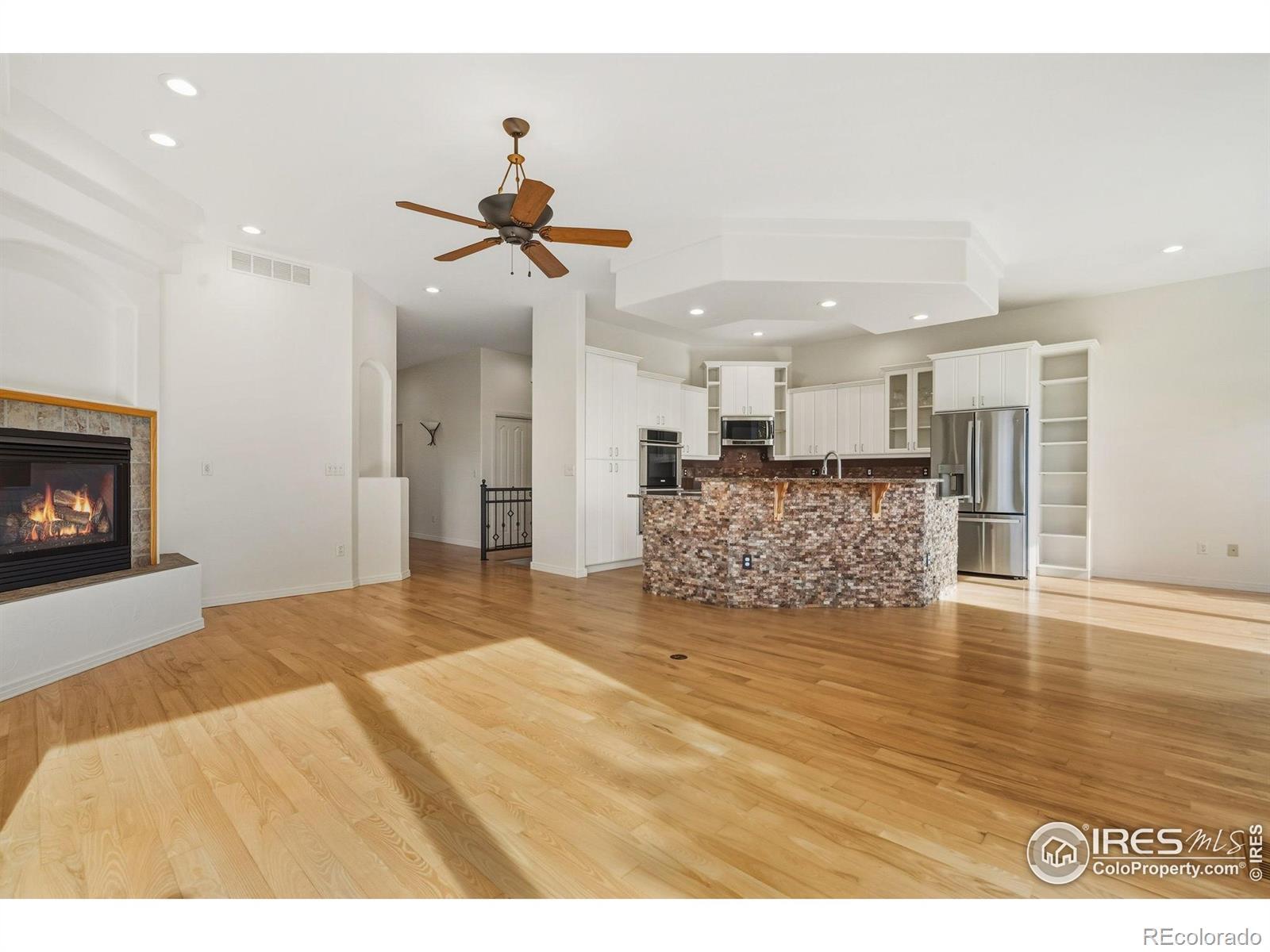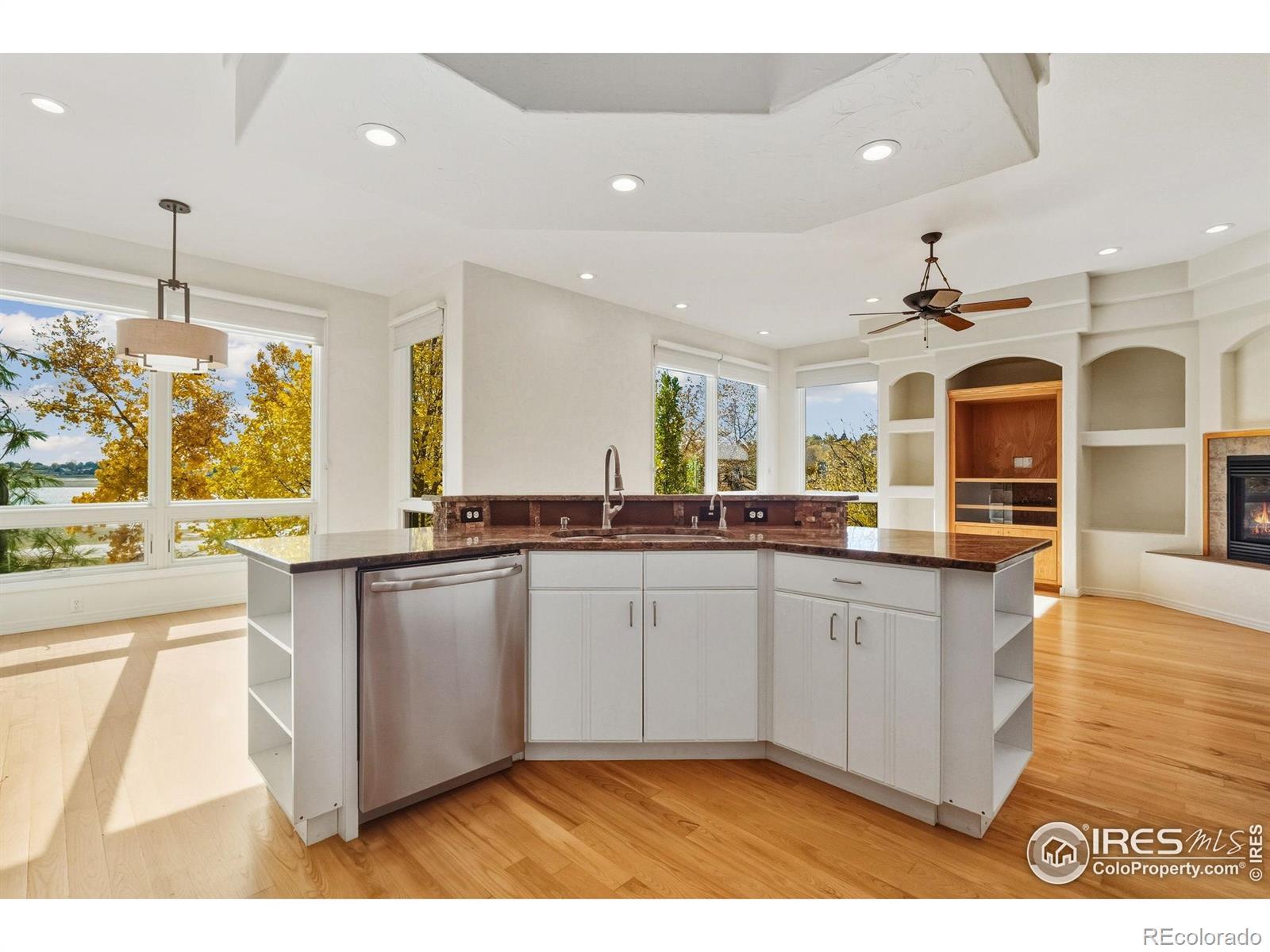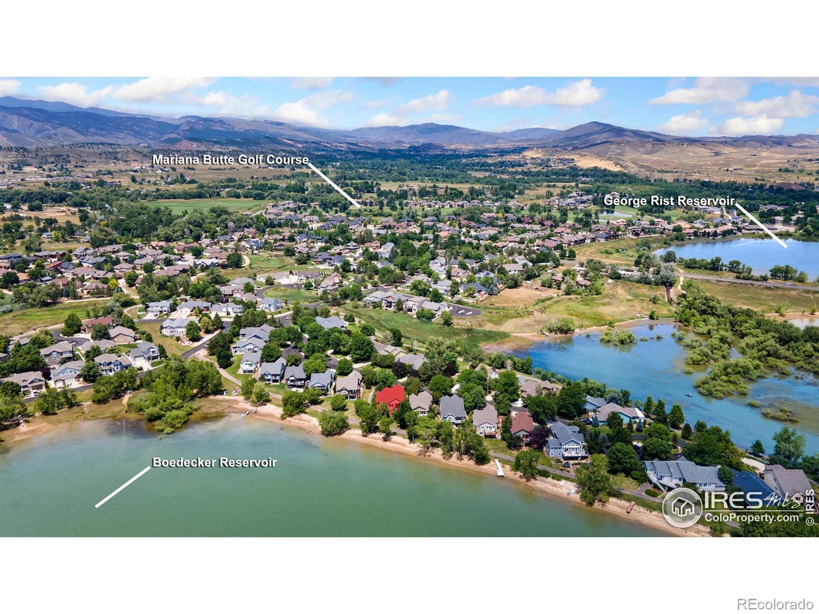 The seller shares: "Oh how we loved our lakefront home. Casual dining on the deck, enjoying peaceful water views, watching wildlife cross the lake, and hosting memorable holiday gatherings made this a special place to live. The builder, who originally planned the home for personal use, selected this lot for its exceptional views within the development." Welcome to this exceptional custom built ranch-style patio home perfectly situated on the shores of Boedecker Reservoir in the highly sought-after Mariana Cove neighborhood. This spacious and beautifully maintained home has been freshly painted throughout and features brand new carpet, gleaming hardwood floors and a whole house vacuum system offering a move-in ready opportunity. The beautiful custom kitchen includes a large center island, copious amounts of cabinetry, and high-end SS appliances-all set up for the gourmet chef! The kitchen effortlessly connects to the dining and living areas, highlighted by custom built-ins and a welcoming fireplace framed by expansive windows showcasing the amazing lake views. The dining area opens to a large composite deck overlooking the water. The main level also includes a generous primary suite with a luxurious five-piece bathroom and a spacious double walk-in closet, along with a flex room that can be used as a formal dining room or a study, laundry room, and another bed and full bath. The finished walk-out basement offers more space featuring a large rec room with built in office area, a wet bar, 2 bedrooms, a 3/4 bath, a wine cellar, and a large storage area. From this level, you can enjoy easy access to the beautifully landscaped backyard and the reservoir. This home offers direct access to nearby walking trails and is just minutes from the Mariana Butte Golf Course. The Loveland bike path, with its 26 miles of connected trails, is also close. Combining relaxed lakeside living with thoughtful design and a prime location, this property captures the best of Colorado living.
