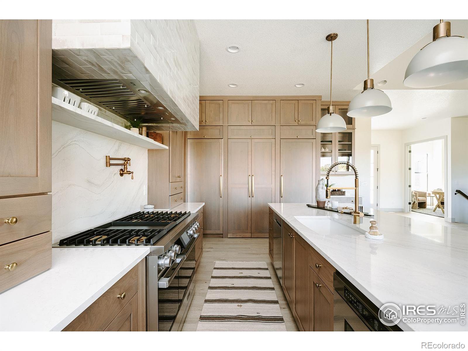 This thoughtfully designed ranch-style home sits on a premium 11,805 sq ft south-facing garden-level lot with no rear neighbors in the desirable Greenspire at Windsor Lake community. Enjoy privacy, space, and walkable access to downtown Windsor, Windsor Lake, and nearby trails.Step through double front doors into a bright, open layout with vaulted ceilings, exposed beams, and large windows that fill the home with natural light. The main level includes a private study and three bedrooms-ideal for family, guests, or a home office. The great room feels warm and inviting with a stone fireplace and built-in shelving that make it easy to gather and relax.The kitchen blends beauty and function with soft greige cabinetry, a contrasting brown island, quartz countertops, gold hardware, paneled appliances, and a 48-inch range with a custom hood. A hidden butler's pantry adds storage, counter space, and a beverage fridge-perfect for entertaining. Step outside to a spacious covered patio overlooking the private backyard, ideal for dining or simply enjoying Colorado's weather year-round.Off the garage, the mudroom and laundry area include cabinetry, cubbies, and a built-in dog wash for everyday convenience. The primary suite feels like a retreat with dual vanities, a freestanding tub, a walk-in steam shower, and direct patio access for morning coffee or an evening glass of wine.The finished garden-level basement offers a large rec room, wet bar, two bedrooms, a full bath, and a theater room ready for movie nights or game days. A three-car garage provides generous space for tools and gear. Landscaping and fencing are included, making this home move-in ready. Schedule your private showing today and experience Greenspire at Windsor Lake living at its finest.