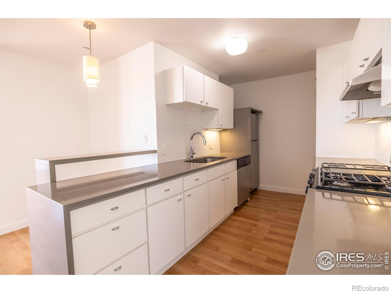Welcome to this beautifully appointed 2-bedroom, 2-bath condo in the highly sought-after Prospect New Town community of Longmont. This stylish residence offers modern finishes, abundant natural light, and a spacious open layout designed for comfort and convenience. Enjoy hardwood floors throughout, a gourmet kitchen with stainless-steel appliances, quartz countertops, and a generous island perfect for entertaining. The primary suite features a walk-in closet and private bath with dual vanities and tile finishes. A second bedroom and full bath provide the perfect setup for guests, a home office, or roommates. Step onto your private balcony to enjoy scenic views of the neighborhood and Front Range. Additional highlights include elevator access, secure indoor parking available for a fee, and in-unit laundry. Located in one of Longmont's most vibrant and walkable neighborhoods, you're just steps from local favorites; restaurants, coffee shops, boutiques, and parks, all within the unique mixed-use community of Prospect. Easy access to Hwy 119 and I-25 makes commuting to Boulder or Denver a breeze. Experience low-maintenance living with a modern edge in one of Longmont's most desirable settings.