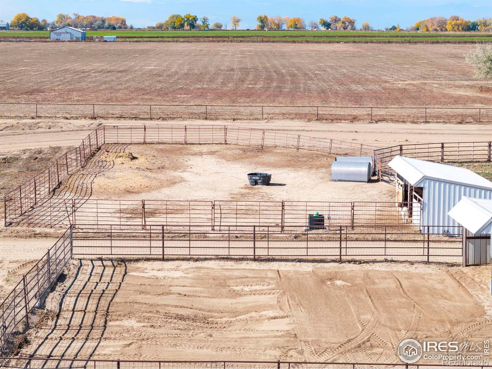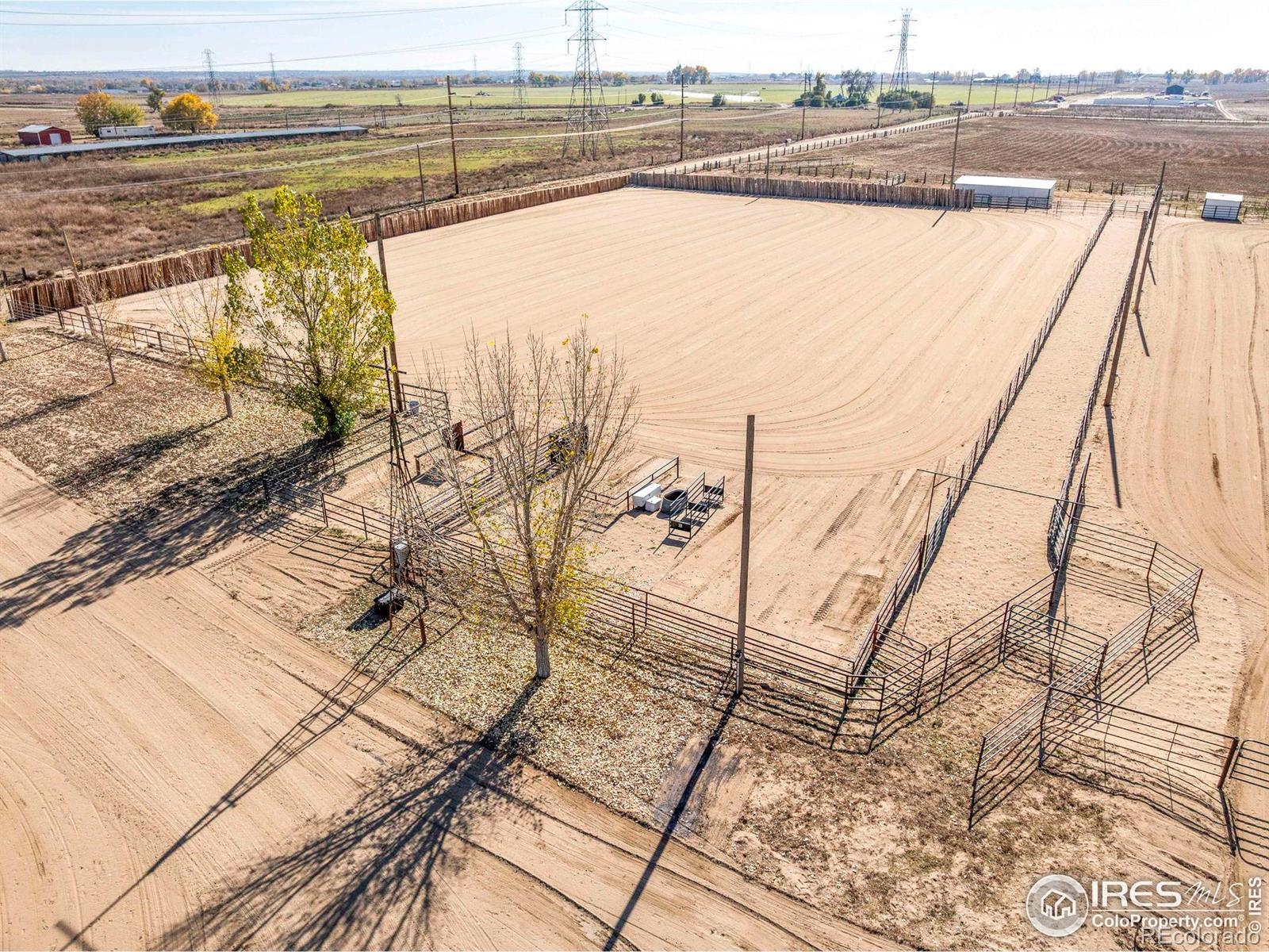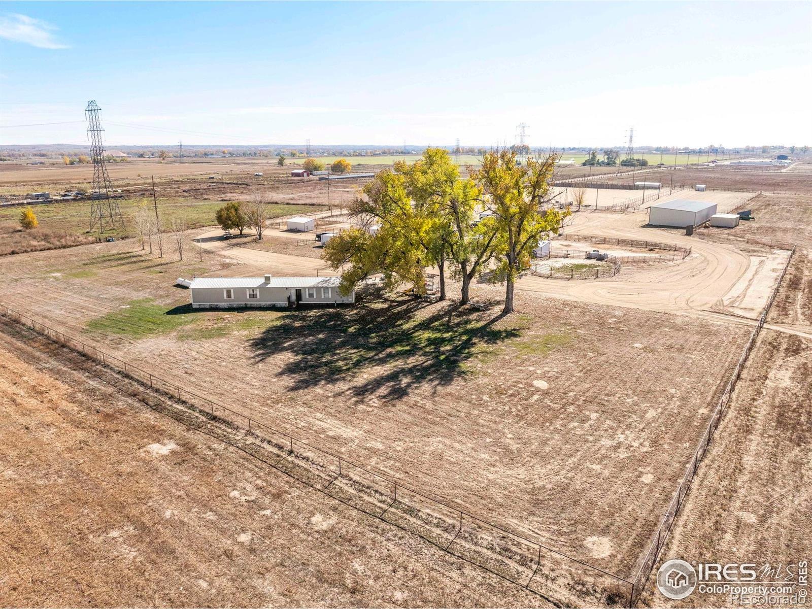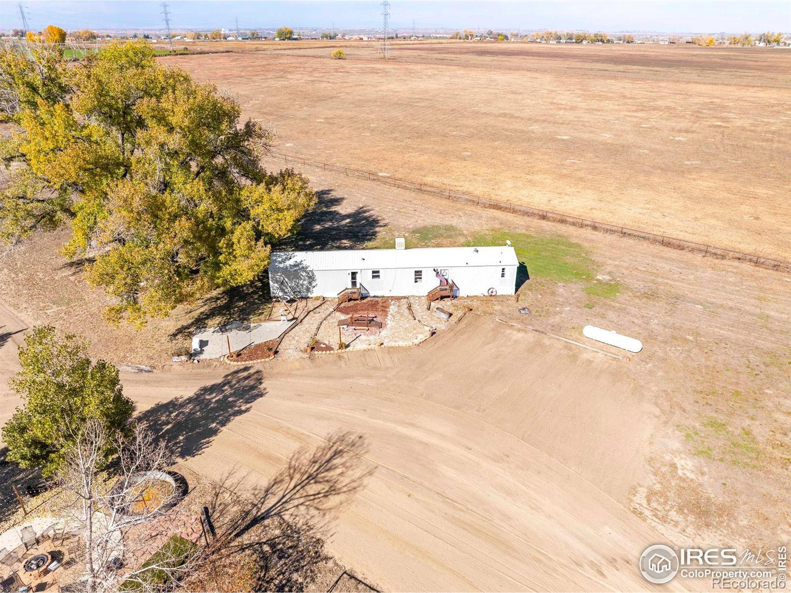 Horse-ready 78 acres just minutes East of Del Camino off paved road with sweeping mountain views! Features a 200'x300' sandy roping arena perfect for those hard rains, 40x100x16 outbuilding with 5' overhang, for abundance of hay & RV storage, 6 loafing sheds, 2001 3-bed, 2-bath nicely remodeled manufactured home. Two Central Weld water taps, ag zoning, no HOA or metro district. 60-acre solar lease in place for long-term passive income. Prime location near Hwy 85 & I-25 with development potential. Ideally situated between Denver, Boulder, and Fort Collins, this property captures the essence of western lifestyle with open space, functionality, and future opportunity. The approximate 60' diameter round pen and arena's deep, sandy footing drains fast-ideal for roping, training, or leisure riding year-round. The 40x100x16 open-faced outbuilding includes a 5' overhang which easily accommodates hay storage, long LQ trailers, RVs, or large equipment, while six well-built loafing sheds offer excellent shelter for horses and livestock with 5 automatic waters. The 2001 Lancaster 3-bedroom, 2-bath home has been tastefully remodeled to balance comfort and practicality, featuring open living spaces and mountain views with a massive 9'x5' granite center island as the focal point. Two Central Weld water taps are installed, ensuring flexibility for expansion or future development. A 60-acre solar lease is secured and set to produce long-term passive income, blending agricultural heritage with renewable potential. The land is ag-zoned with no HOA, covenants, or metro districts, providing freedom to grow or develop as desired. With quick access to Highway 85 and I-25, the location offers both rural tranquility and modern convenience-minutes from Firestone, Fort Lupton, and Longmont. Whether you're building a horse operation, seeking sustainable income, or exploring Weld County's strong development corridor, this property stands ready for your vision under Colorado's open western skies
