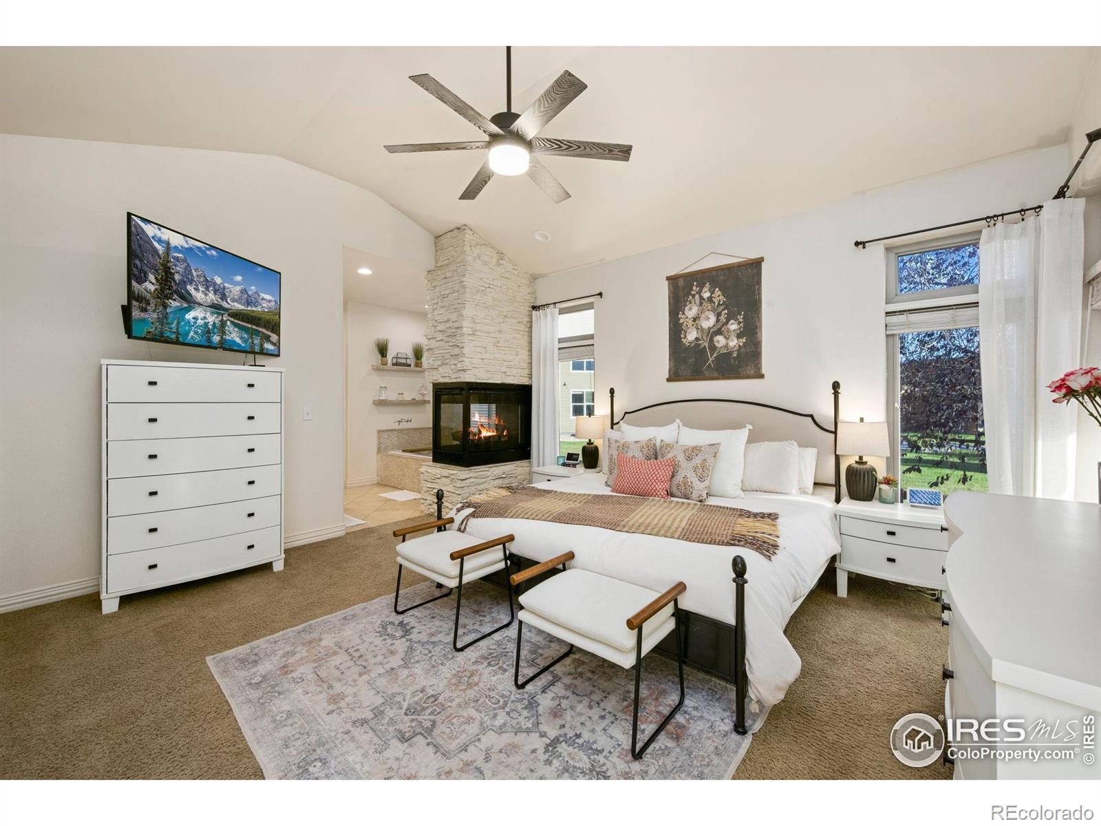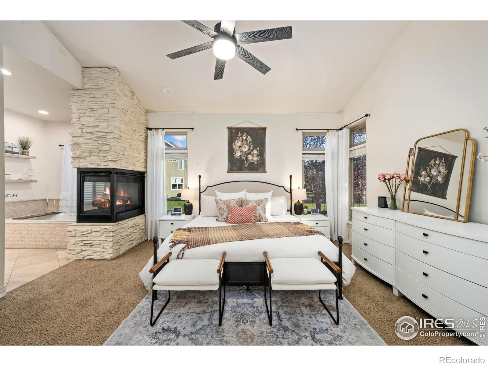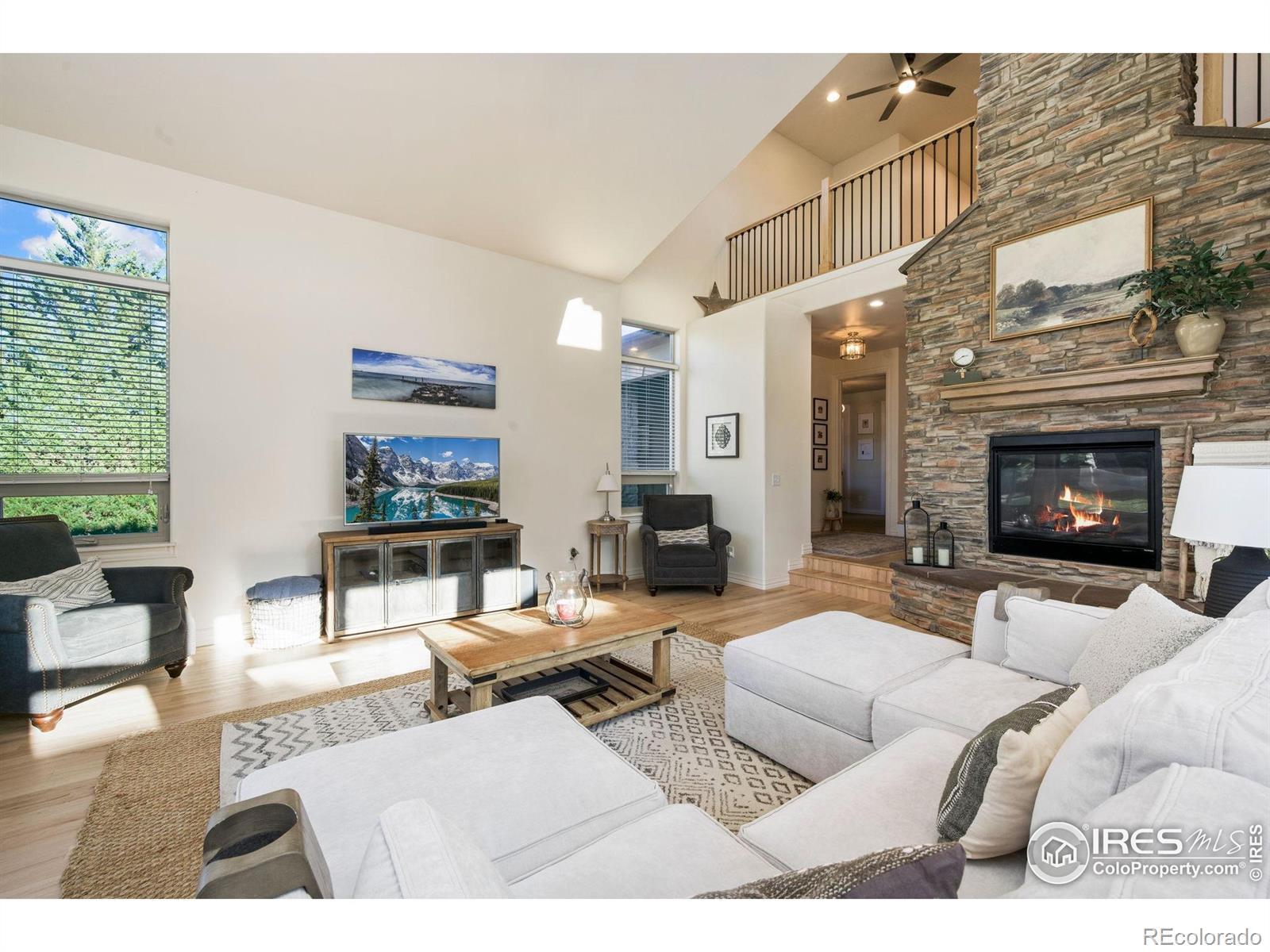 Showstopping 1 1/2-Story Gem in Water Valley! This stunning home with a main-floor primary suite is a true standout in the prestigious Water Valley community-just minutes from Pelican Lakes Golf Course & Eagle Lake. Surrounded by scenic water views and endless recreation, it's the perfect blend of luxury & lifestyle. A fully refreshed exterior gives this home unbeatable curb appeal, while inside, vaulted ceilings, refinished hardwood floors, & walls of windows fill the open living space with natural light. At the center, a floor-to-ceiling multi-sided stone fireplace brings warmth, texture, & Colorado charm. The kitchen is a dream for both chefs & entertainers, featuring stainless steel appliances, granite countertops, a center island, & pantry. The main-floor primary suite offers a private retreat with a dual-sided fireplace, spa-like bath, walk-in closet, & direct access to the covered patio. A second main-floor bedroom (or office) adds versatility & convenience. Upstairs, a charming loft overlooks the main living area, accompanied by two generous ensuite bedrooms. The finished basement is built for entertaining, complete with a theater room, game area with wet bar, & guest suite. Enjoy two outdoor patios for relaxing or grilling, & take advantage of resort-style amenities including lakes, beaches, trails, & optional golf or pool memberships at Pelican Lakes and Raindance River Resort. Recent updates: new banisters, HVAC, roof, stone, & stucco.