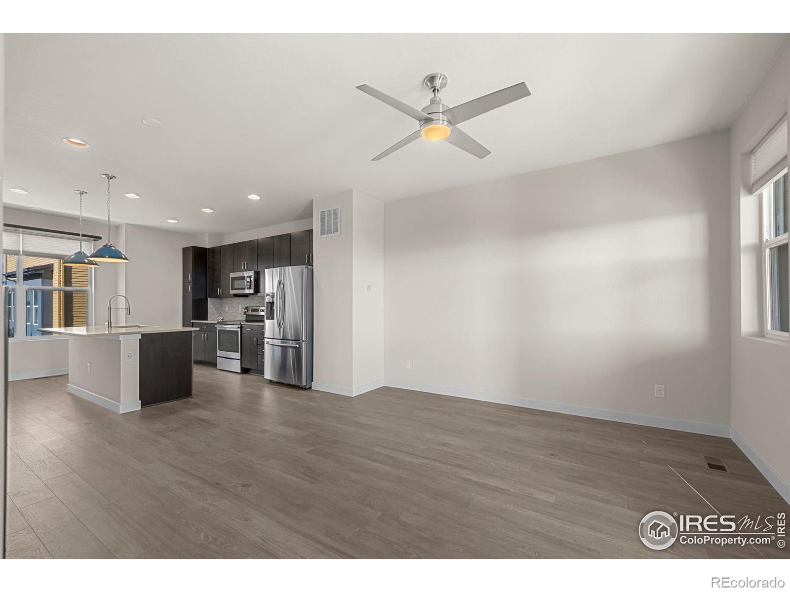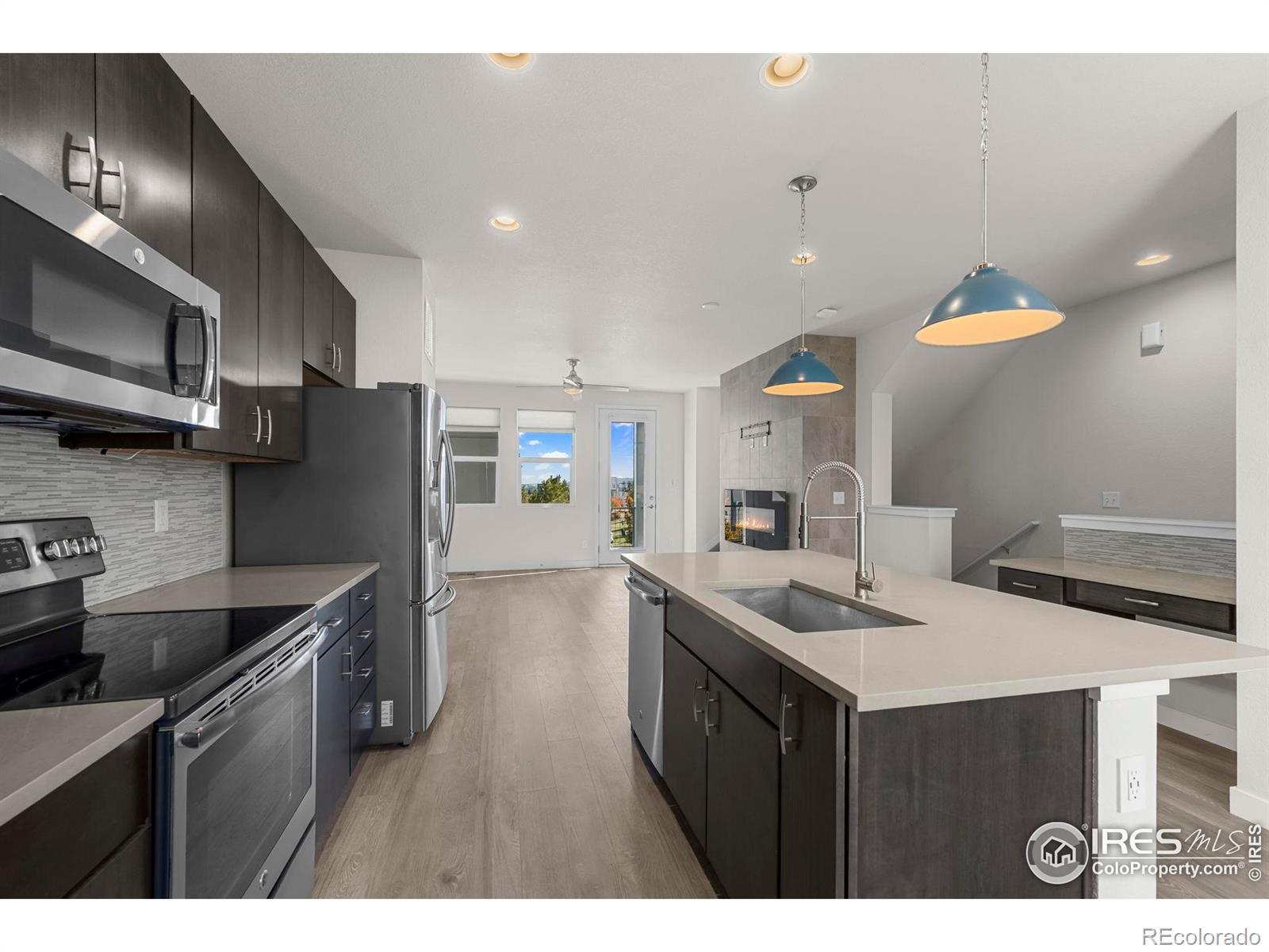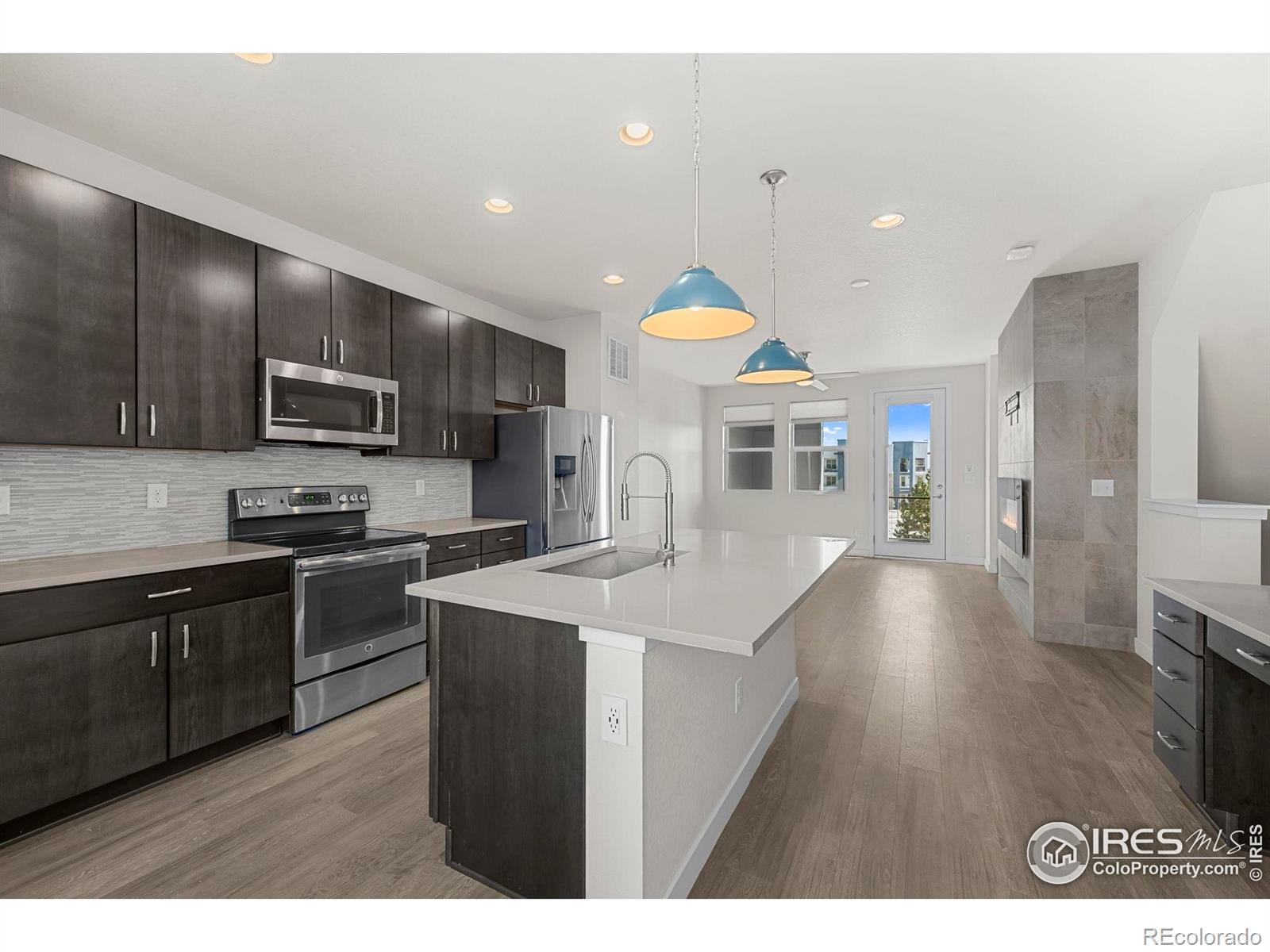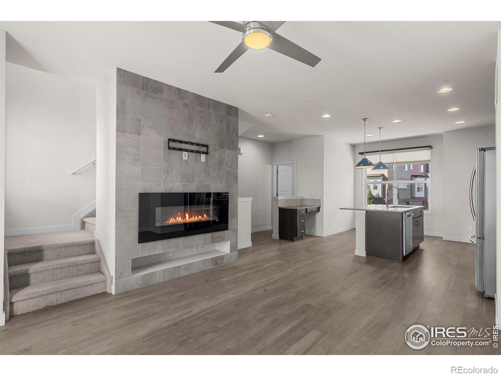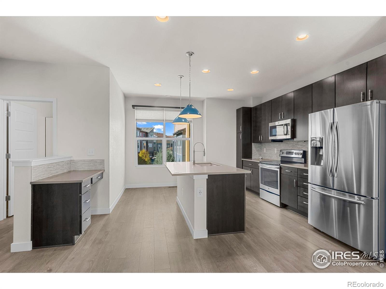 Discover effortless, modern living in this stylish and contemporary townhome nestled in the vibrant and sought-after Arista community in Broomfield. Ideally located just a short walk to Redpoint Community Park, and neighborhood dining, coffee spots, local brewery, and the transit at Arista Town Center, offering unparalleled convenience to both Boulder & Denver. Designed for comfort and ease, this beautifully maintained home perfectly blends low-maintenance living with sophisticated finishes and a convenient 2-car attached garage. Step inside to find an open-concept main-level living space with wide-plank grey-tone LVP flooring and abundant natural light. The inviting living room centers around a sleek, modern electric fireplace creating the perfect atmosphere for relaxing or entertaining. The adjoining kitchen showcases espresso cabinetry, quartz counters, stainless appliances, and an under mount sink. A large center island provides ample seating space, while a built-in desk nook offers a convenient area for work or study. A stylish powder bath completes the main floor. Upstairs, the spacious primary suite features a walk-in closet and private ensuite bath. The second bedroom is equally comfortable and sits adjacent to a full bathroom and laundry space with included stackable washer & dryer. Additional highlights include a covered balcony off the main-level living space, perfect for morning coffee or evening happy hours, and a covered front patio offers extra outdoor enjoyment. Enjoy a true "lock-and-leave" lifestyle and LOW HOA FEES in this desirable community with a dynamic mix of restaurants, shops, entertainment, and parks, all within walking distance. Easy access to Hwy 36 makes commuting to either Denver or Boulder effortless, from this low-maintenance, move-in ready home in a thriving community.