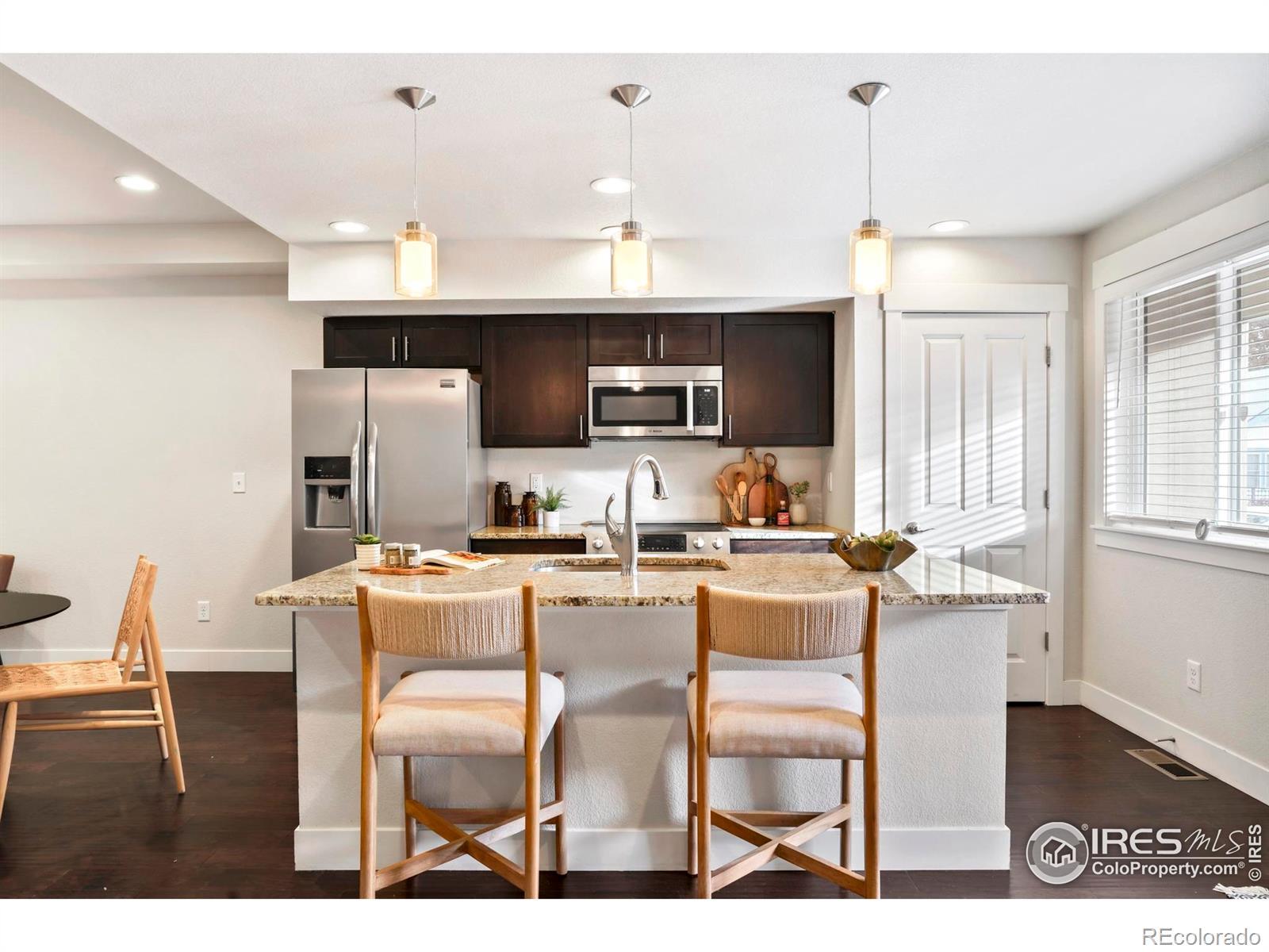 Urban sophistication meets small-town charm in this beautifully appointed brownstone-style townhome in the heart of Old Town Longmont. Just two blocks from Main Street and moments from local shops, beloved eateries, parks and breweries, this residence blends effortless convenience with elevated design. Hardwood floors, lofty ceilings and expansive windows fill the main level with natural light, complementing a spacious living area and a gourmet kitchen featuring granite countertops, stainless steel appliances and a center island. The generous primary suite impresses with a walk-in closet, en-suite bath and a private outdoor balcony, while additional bedrooms offer versatility for guests or a home office. A finished lower level expands the living space, connecting to private outdoor areas ideal for relaxation or entertaining. With 2 reserved off-street parking spots and a move-in ready interior, this refined retreat delivers timeless brownstone appeal in one of Longmont's most vibrant neighborhoods.