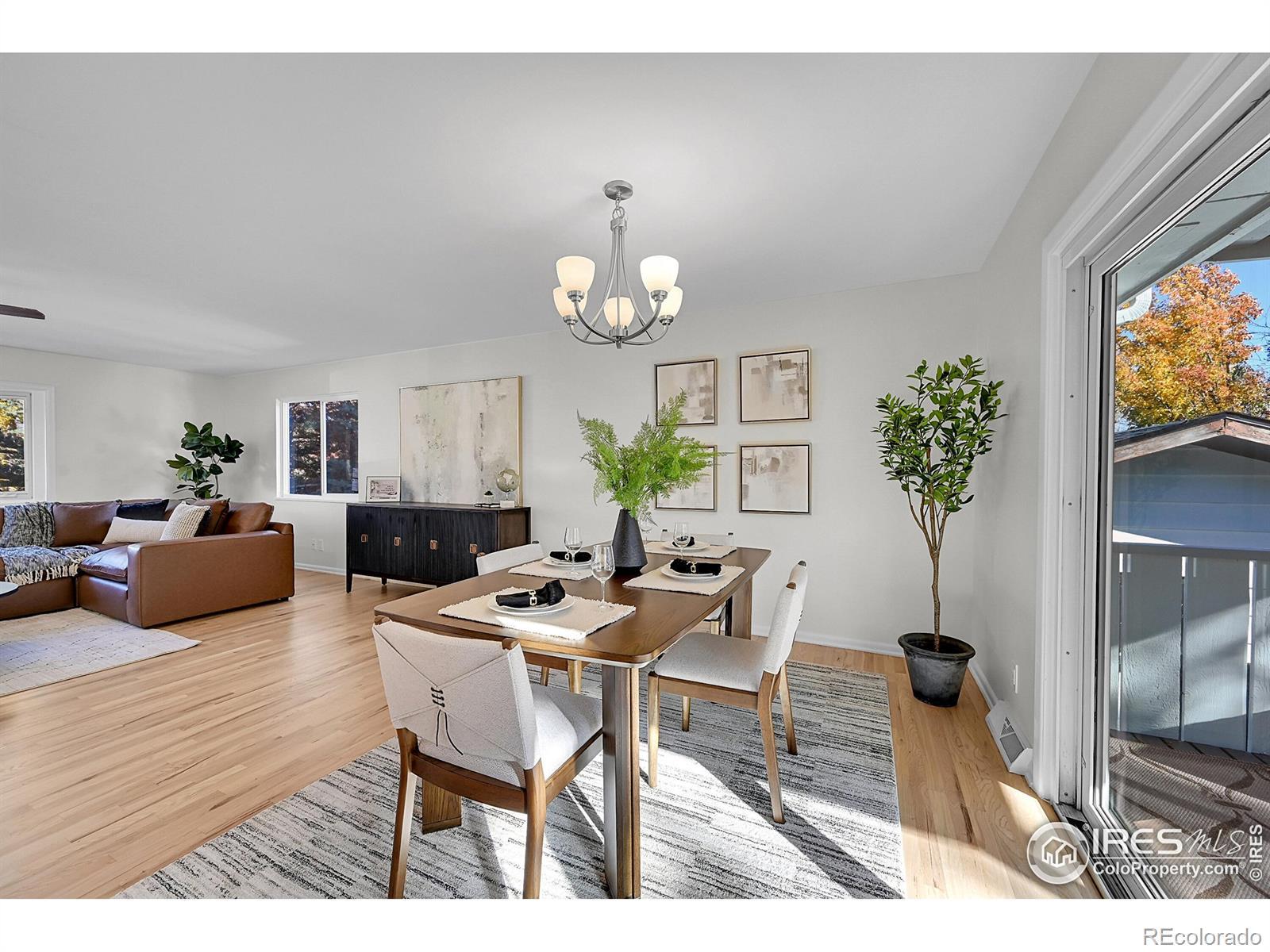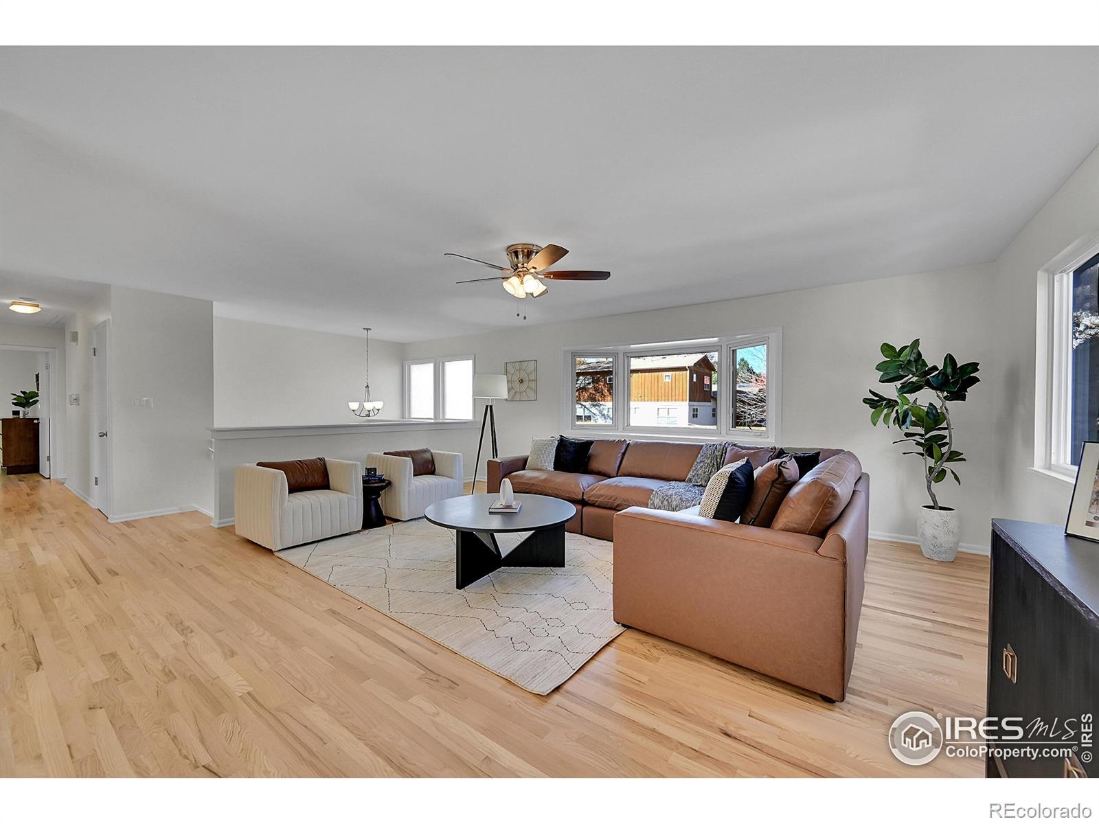 Exceptional South Boulder Home. This beautifully updated property captures the essence of comfort, connection, and effortless living in an unbeatable location. The open floor plan blends the living, dining, and kitchen areas into one inviting space filled with great natural light and warmth from the rich flooring. A charming bay window frames serene views, while the kitchen, featuring quartz countertops and stainless-steel appliances, flows to a covered deck overlooking the expansive backyard with mature trees and mountain views. All new windows and professional landscaping with lush sod create instant curb appeal. Upstairs offers three spacious bedrooms and a full bath. The bi-level floor plan creates an abundance of natural light in the lower level that provides a versatile rec room with a wood-burning fireplace, a fourth bedroom, full bath, laundry, and storage. The 2 car garage adds flexible space for a workshop, hobbies or gear. You will love the large walk-through attic for additional storage. Enjoy quiet surroundings with a strong sense of safety, easy access to the rec center, park, hiking trails, schools, shopping, and convenient highway access. This thoughtfully refreshed residence delivers the Boulder lifestyle you've been waiting for.