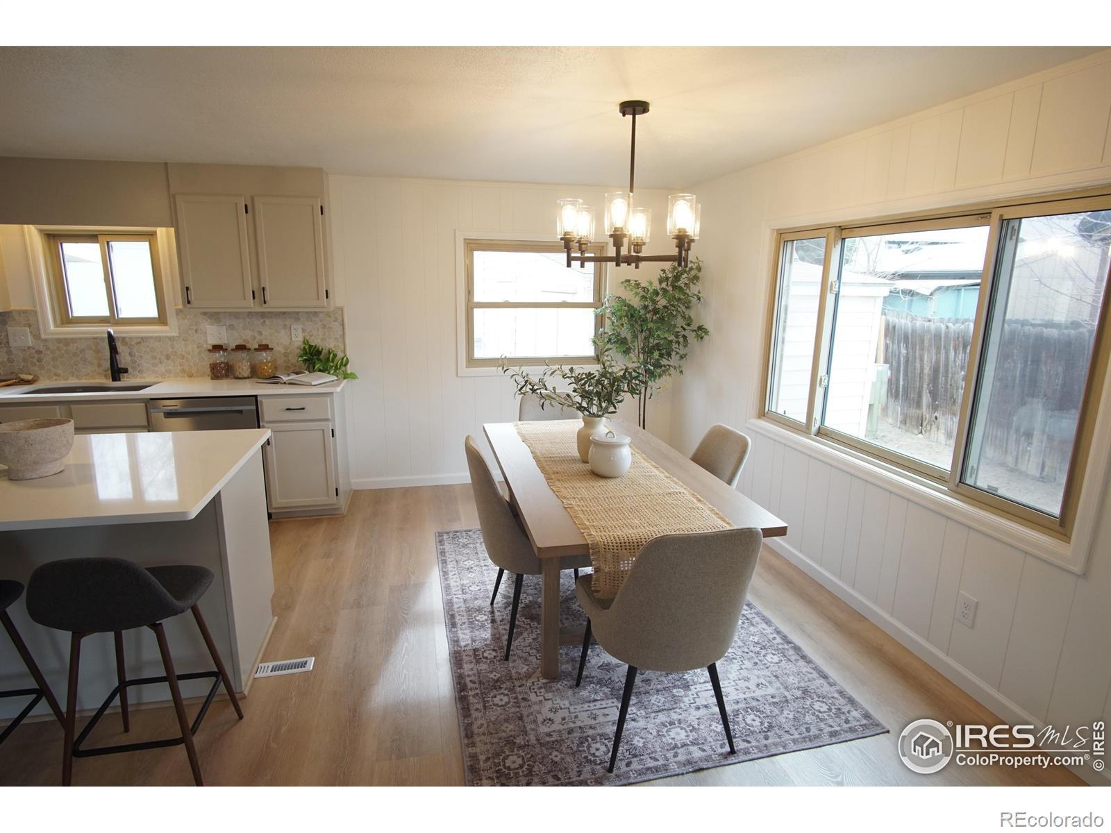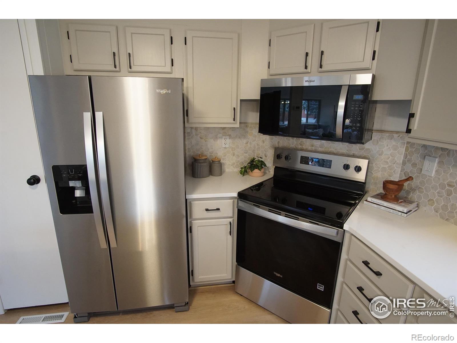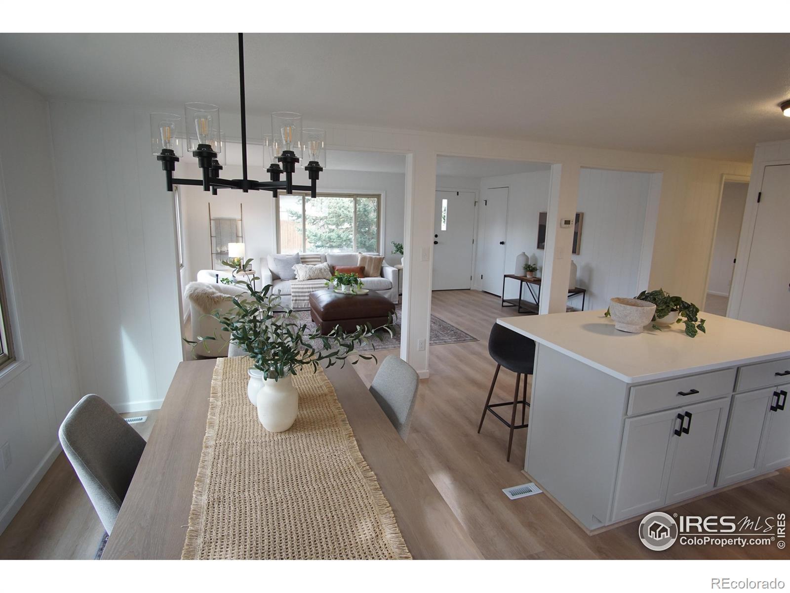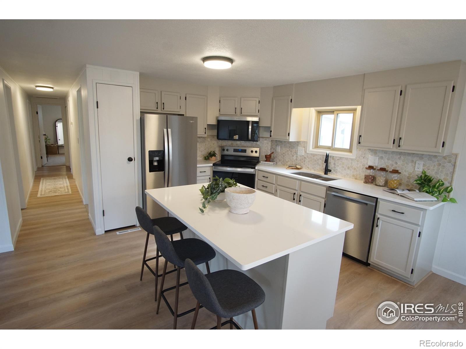 Beautifully remodeled and move-in ready! This 3-bedroom, 2-bath ranch-style home offers a fresh, modern feel throughout. Step inside to find new luxury vinyl plank flooring in the main living areas and new carpet in the bedrooms. The open-concept floor plan connects the living, dining, and kitchen spaces-perfect for entertaining and everyday living. The remodeled kitchen features a new island, quartz countertops, composite sink, tile backsplash, and stainless-steel appliances. Both bathrooms have been tastefully updated with quality finishes. You'll love the three spacious bedrooms, each with abundant closet space. Enjoy an oversized one-car garage that includes a workshop area-ideal for hobbies, projects, or extra storage. An additional extra-large shed provides even more space. HOA amenities include a community pool, playground, tennis and basketball courts, and trash pickup, with RV storage available for a fee. Located in Mountain Range Shadows with easy access to I-25, this home offers strong investment potential near the new Amazon facility, boosting both area growth and rental demand.