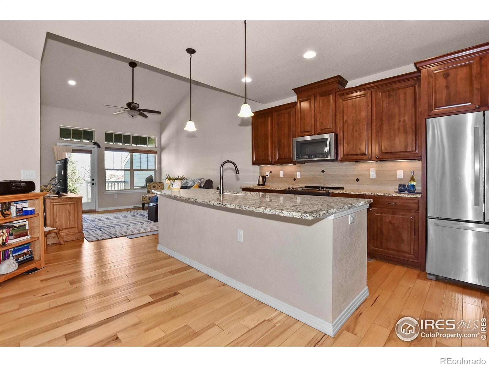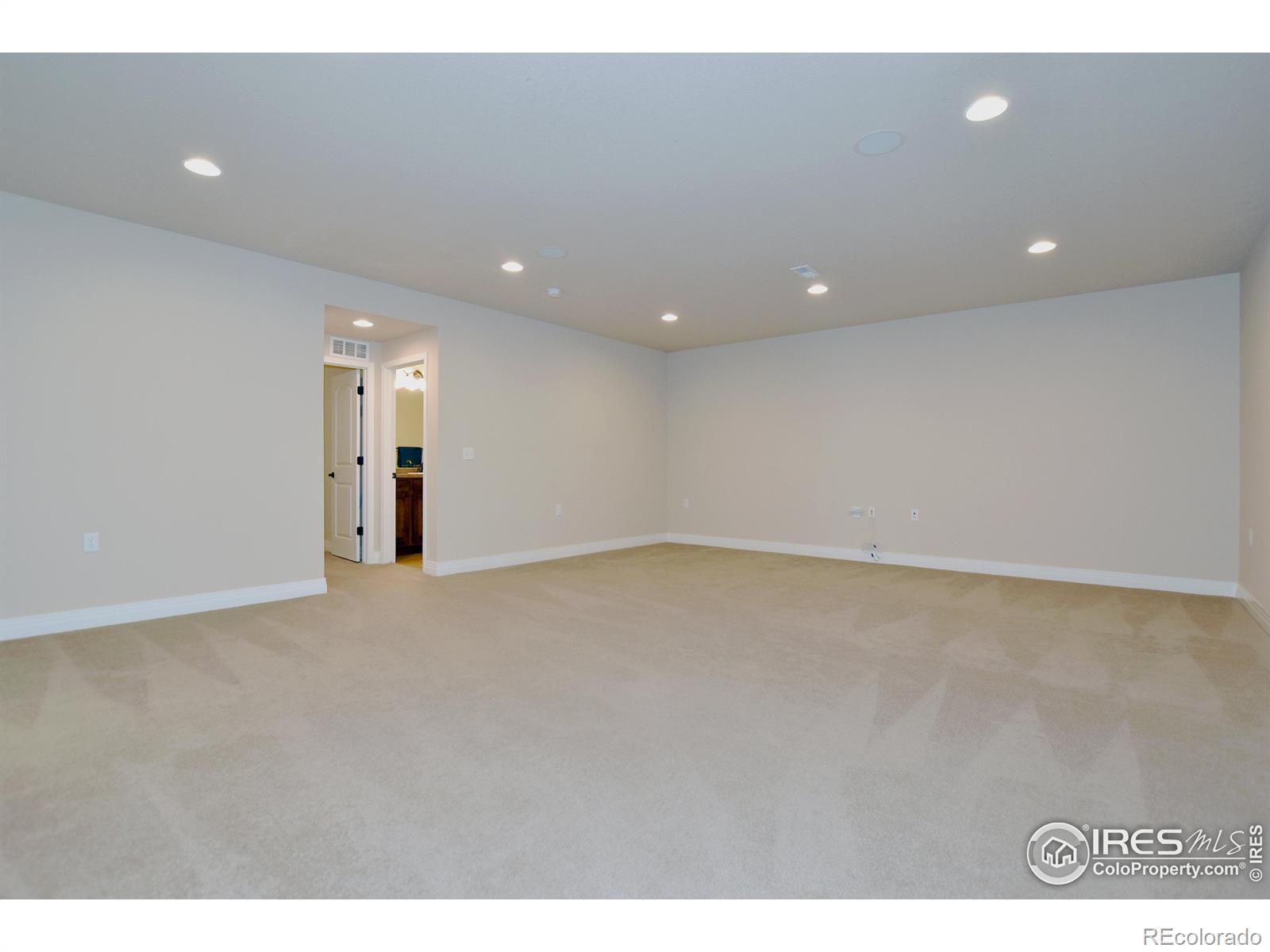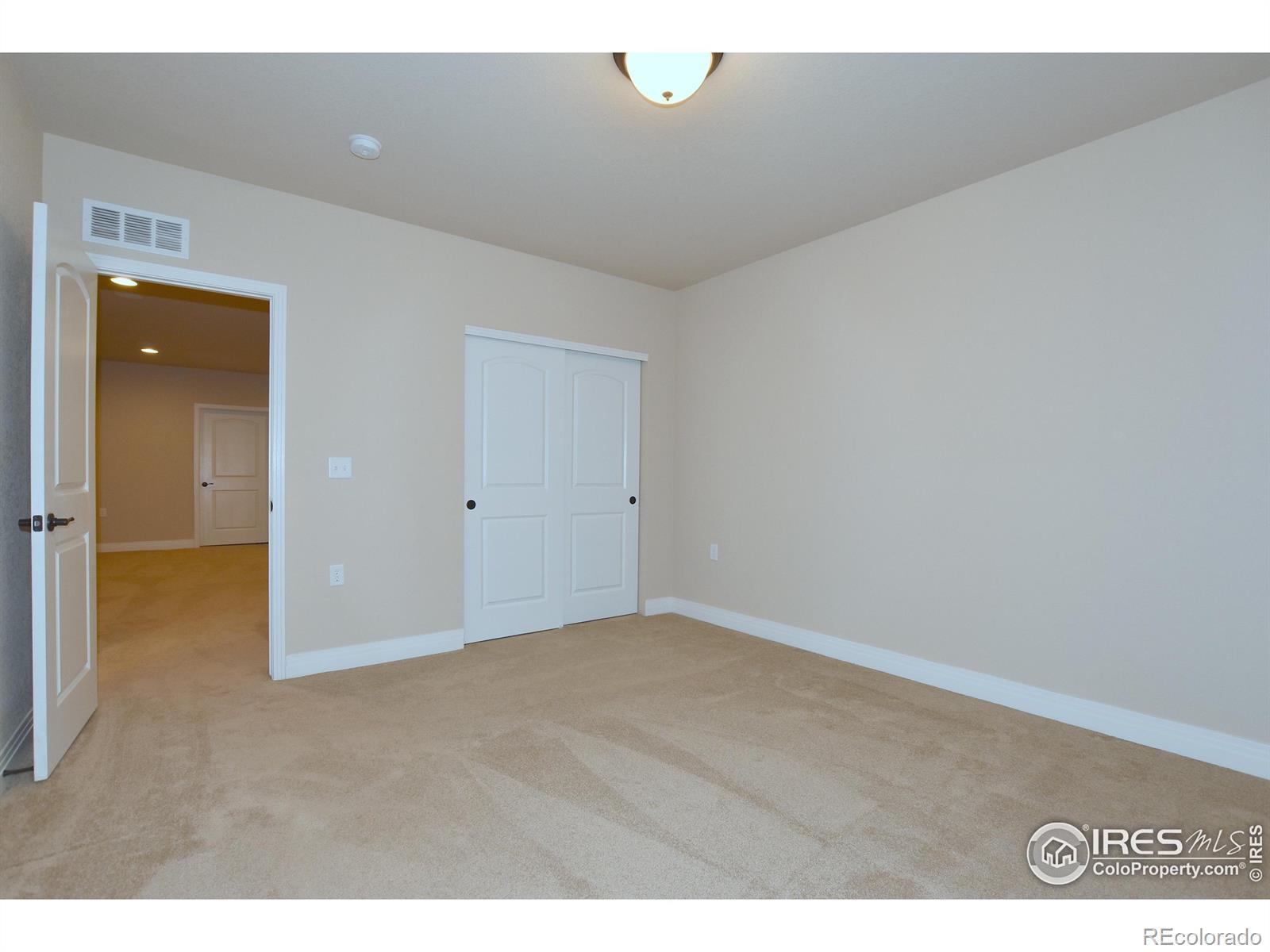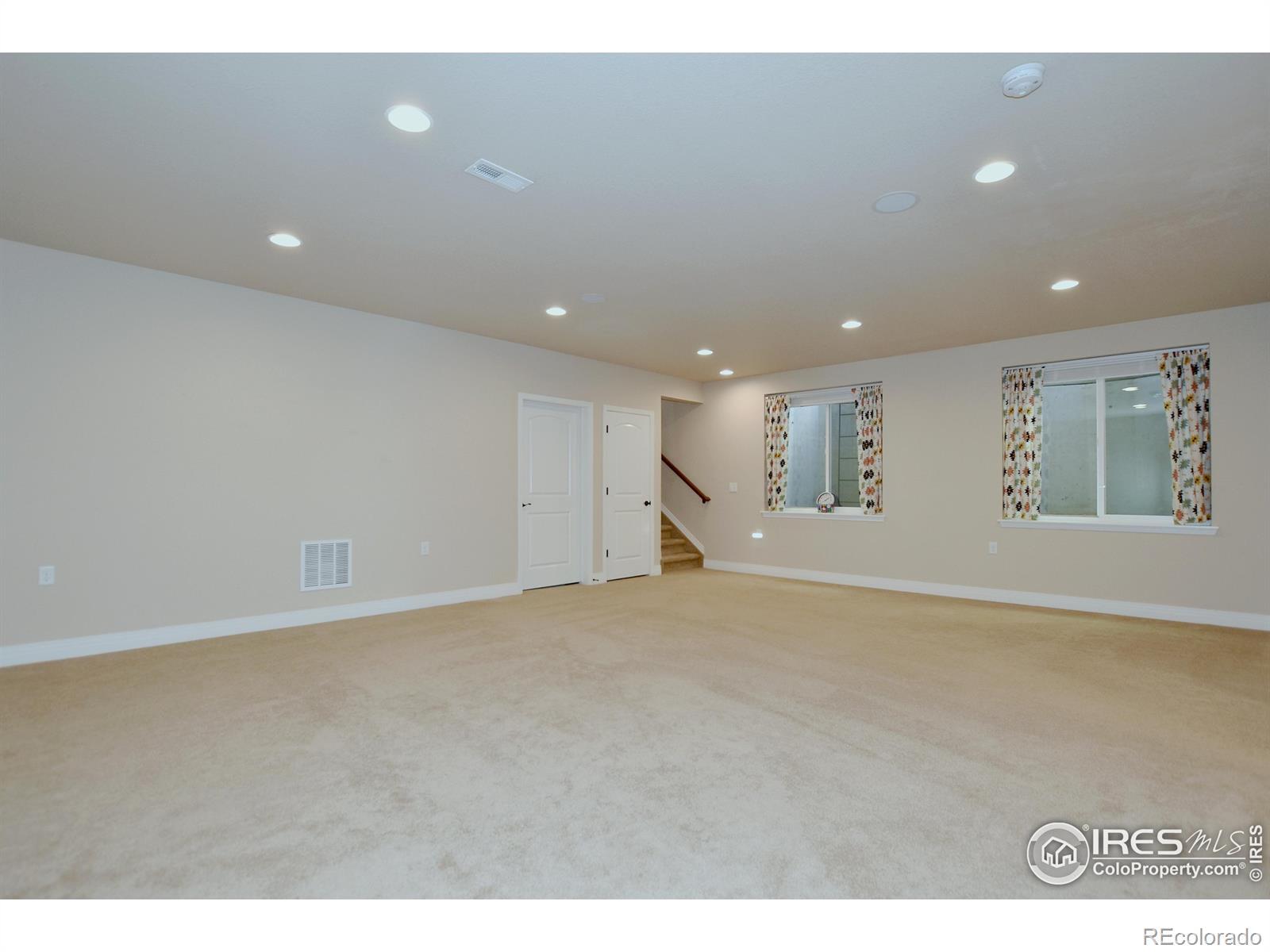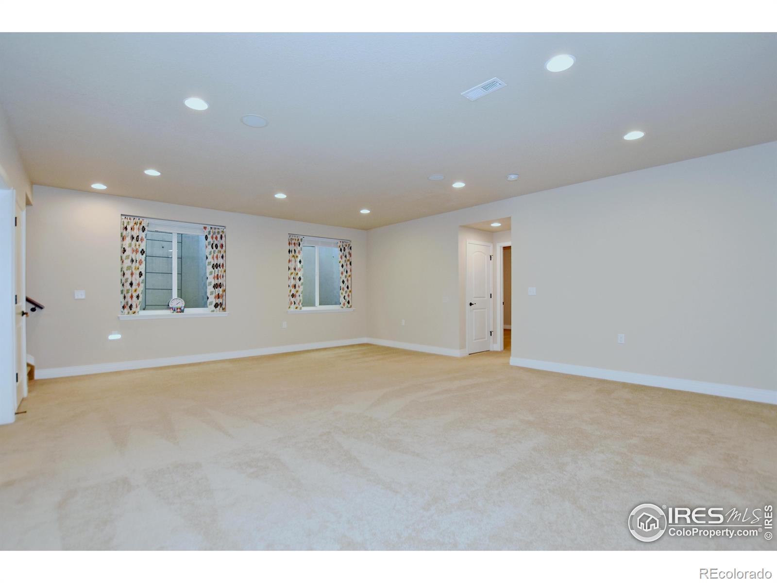 This stunning, impeccably maintained home backing to Ute Creek Golf Course is sure to impress! From the moment you step onto the inviting front covered patio & through the grand eight-foot entry door, you'll be captivated by the quality and thoughtful upgrades throughout. Beautiful hickory-engineered hardwood flooring spans much of the main level, where you'll find a striking staircase to one side and a bright home office to the other. The gourmet kitchen is a true showpiece, featuring granite countertops, a spacious center island, and premium Gold Series stainless steel appliances. Additional highlights include under-cabinet lighting, abundant cabinetry w/soft-close drawers, & generous double-door pantry. The open-concept layout seamlessly connects the kitchen to the living room, making it easy to cook and entertain at the same time. The living area features vaulted ceilings, large east-facing windows, ceiling fan, and pre-wiring for surround sound - perfect for relaxing or hosting guests. You'll appreciate thoughtful details: Hunter Douglas blinds, tiled flooring in all baths & laundry, brushed bronze fixtures and hardware. The primary suite is equally impressive, with vaulted ceilings, large windows, a ceiling fan, and a luxurious en suite bath complete with a granite dual-sink vanity, tile-surround shower with bench, and a spacious walk-in closet. A stylish half bath with granite vanity and the main-level laundry add convenience. Downstairs, the expansive lower level offers a large family room with recessed lighting, surround sound speakers, and concrete egress window wells. You'll also find a comfortable second bedroom, a beautifully finished three-quarter bath with tile surround, and a flexible storage or hobby space.