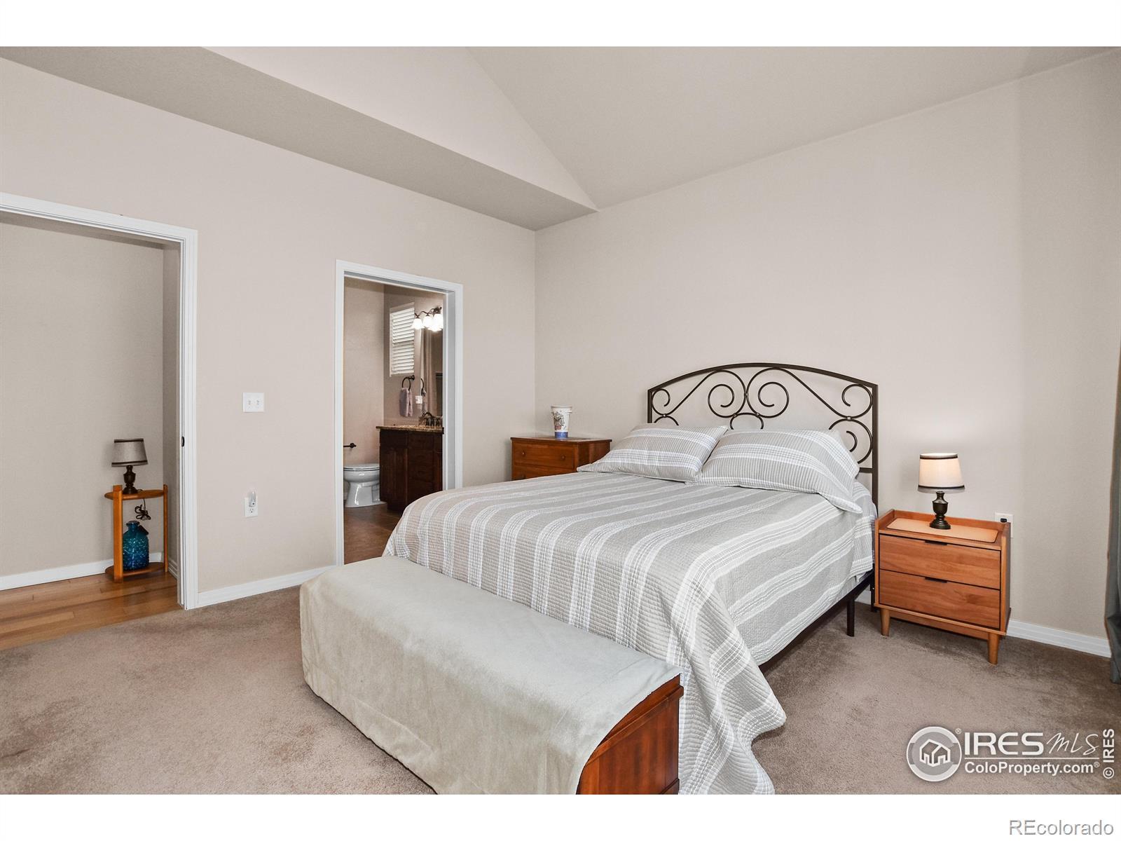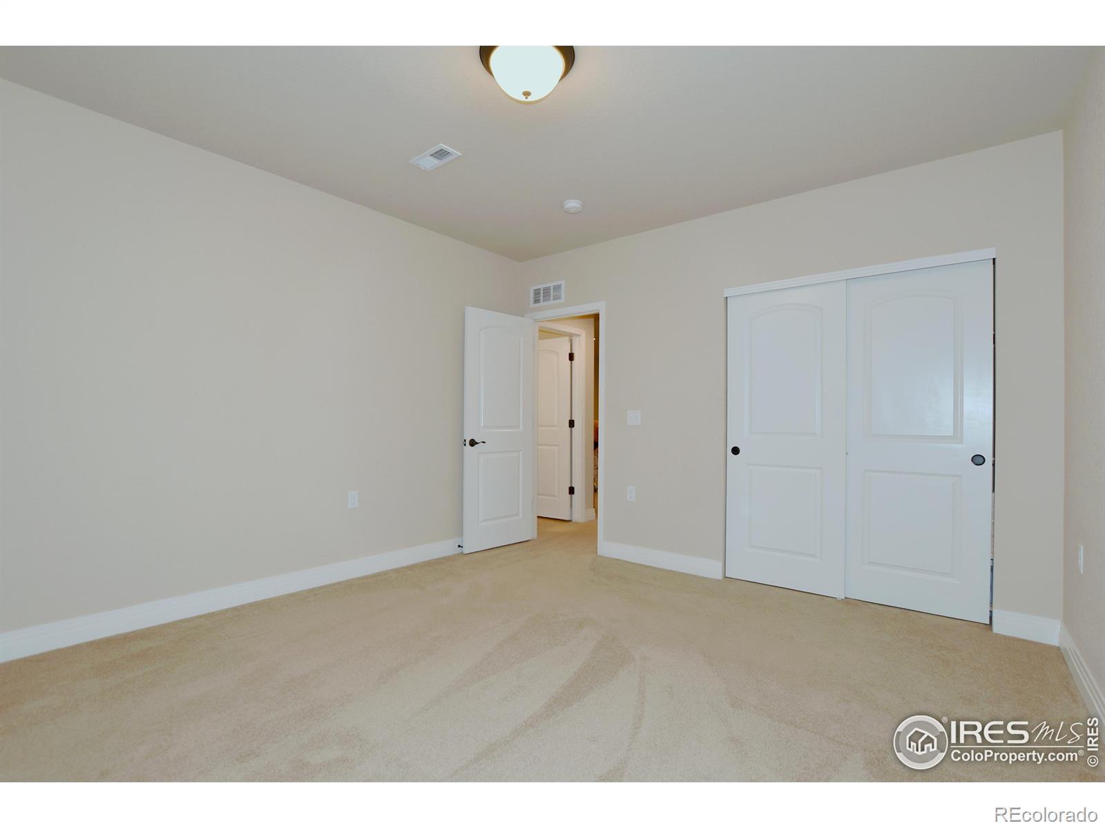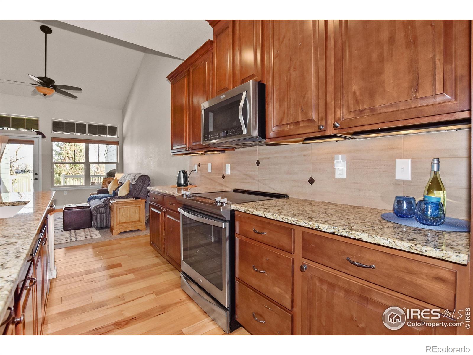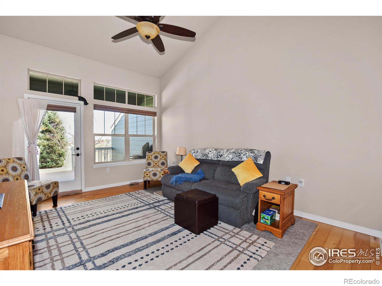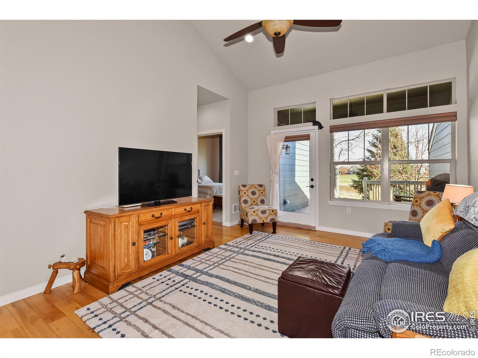 This stunning, impeccably maintained home backing to Ute Creek Golf Course is sure to impress! From the moment you step onto the inviting front covered patio & through the grand eight-foot entry door, you'll be captivated by the quality and thoughtful upgrades throughout. Beautiful hickory-engineered hardwood flooring spans much of the main level, where you'll find a striking staircase to one side and a bright home office to the other. The gourmet kitchen is a true showpiece, featuring granite countertops, a spacious center island, and premium Gold Series stainless steel appliances. Additional highlights include under-cabinet lighting, abundant cabinetry w/soft-close drawers, & generous double-door pantry. The open-concept layout seamlessly connects the kitchen to the living room, making it easy to cook and entertain at the same time. The living area features vaulted ceilings, large east-facing windows, ceiling fan, and pre-wiring for surround sound - perfect for relaxing or hosting guests. You'll appreciate thoughtful details: Hunter Douglas blinds, tiled flooring in all baths & laundry, brushed bronze fixtures and hardware. The primary suite is equally impressive, with vaulted ceilings, large windows, a ceiling fan, and a luxurious en suite bath complete with a granite dual-sink vanity, tile-surround shower with bench, and a spacious walk-in closet. A stylish half bath with granite vanity and the main-level laundry add convenience. Downstairs, the expansive lower level offers a large family room with recessed lighting, surround sound speakers, and concrete egress window wells. You'll also find a comfortable second bedroom, a beautifully finished three-quarter bath with tile surround, and a flexible storage or hobby space.