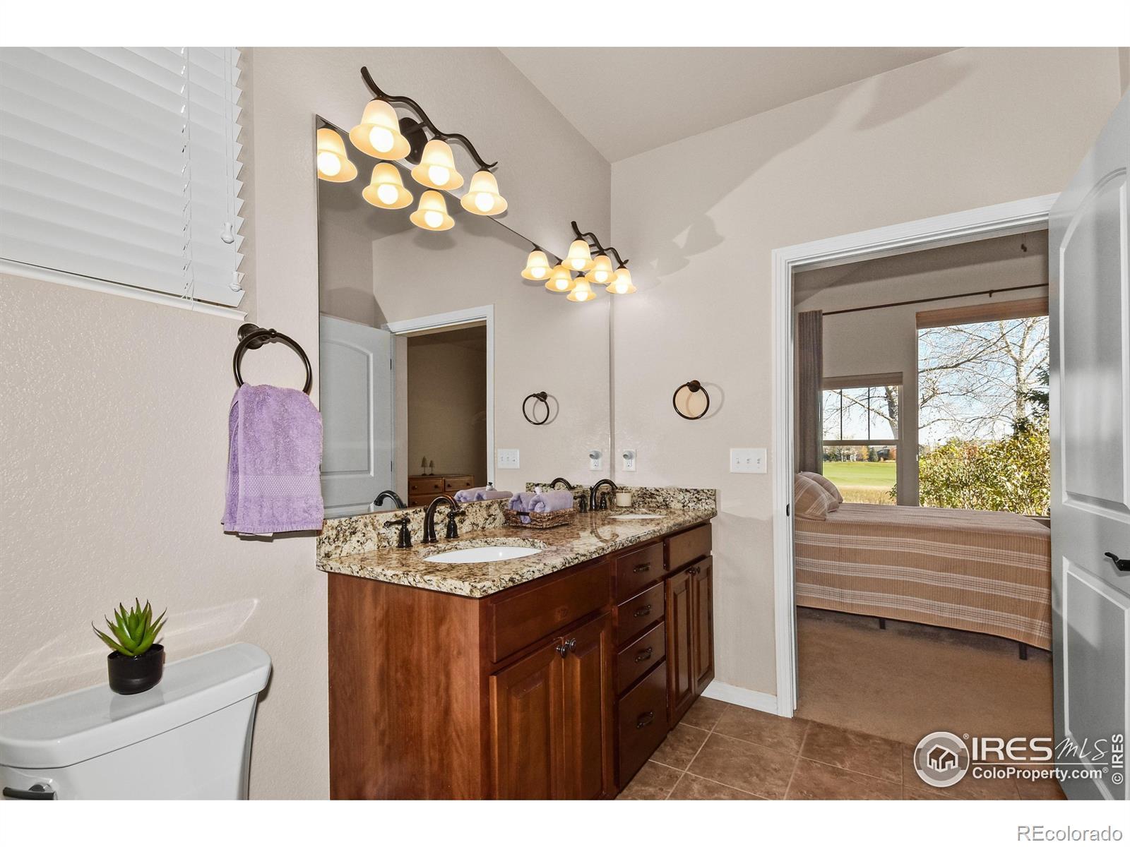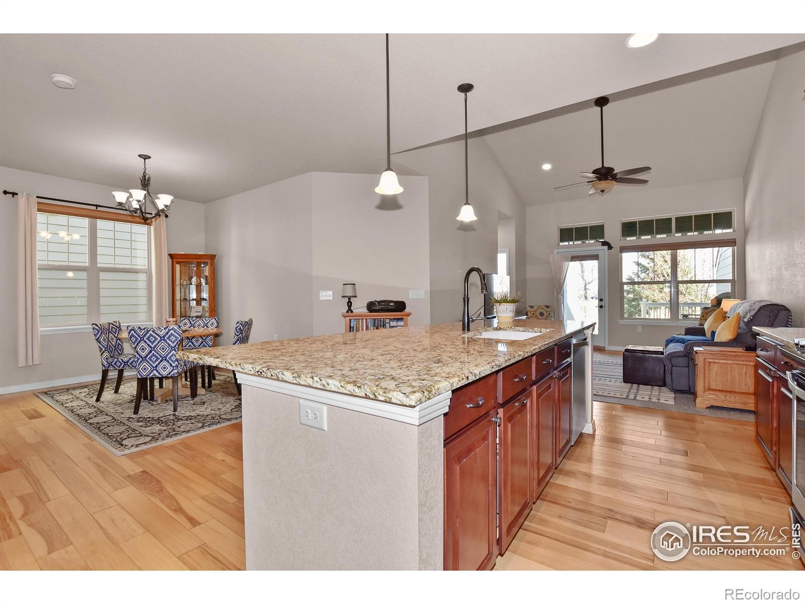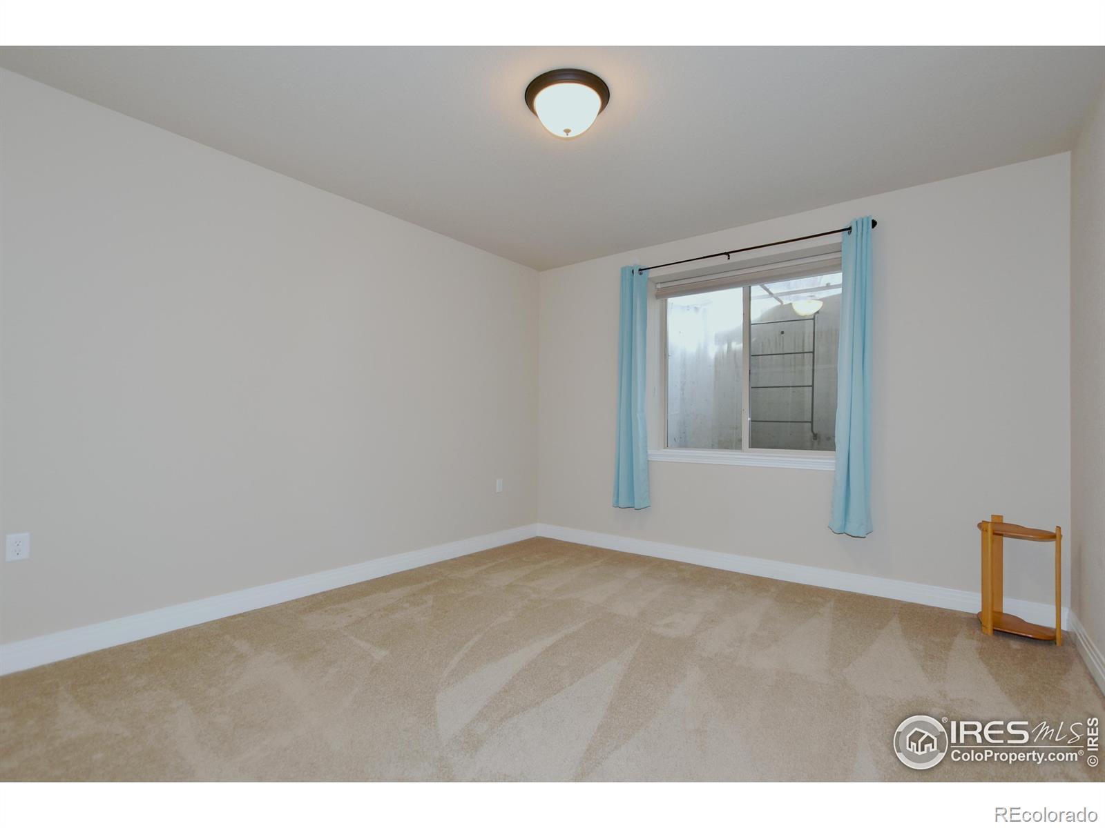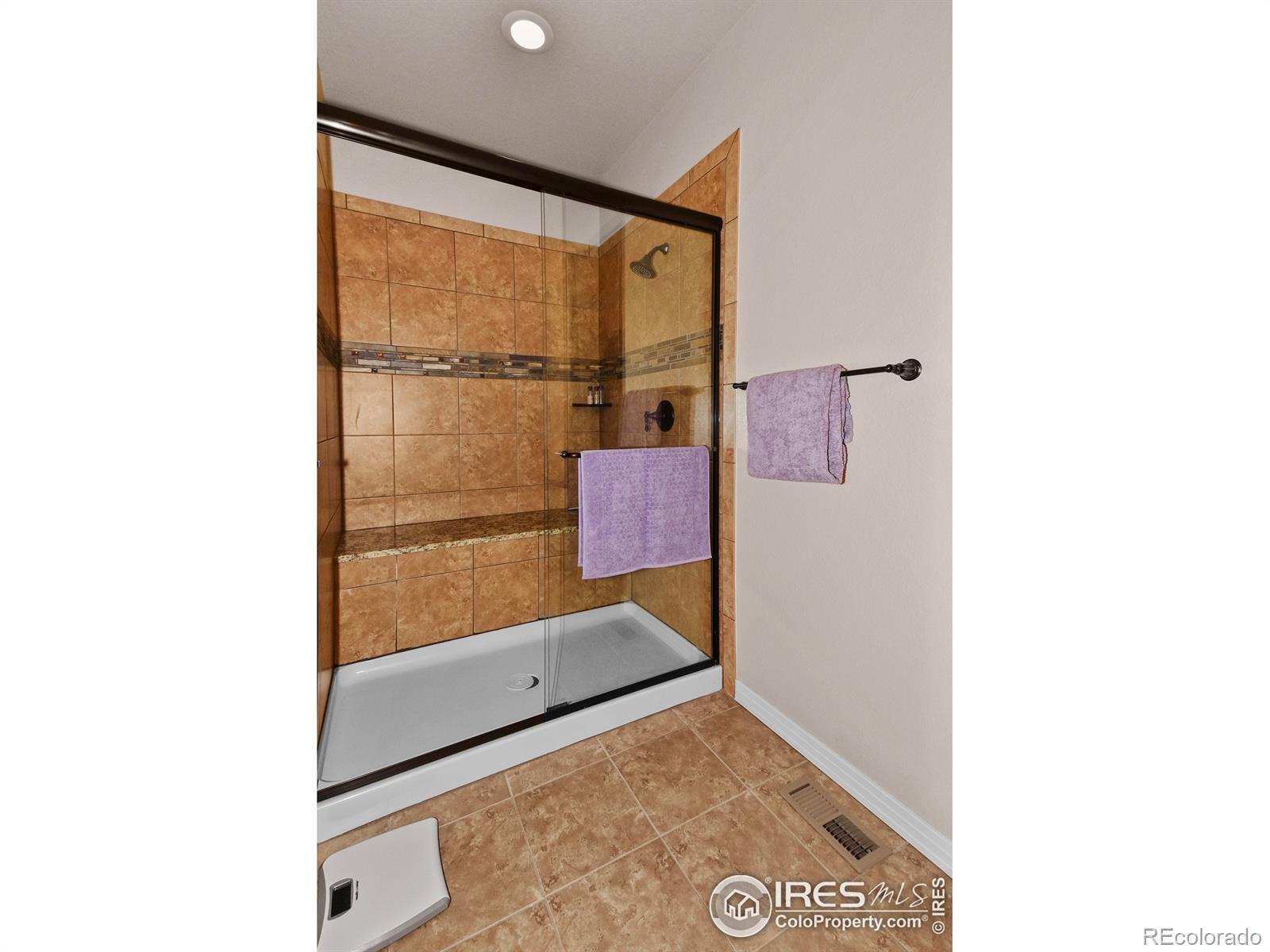 This stunning, impeccably maintained home backing to Ute Creek Golf Course is sure to impress! From the moment you step onto the inviting front covered patio & through the grand eight-foot entry door, you'll be captivated by the quality and thoughtful upgrades throughout. Beautiful hickory-engineered hardwood flooring spans much of the main level, where you'll find a striking staircase to one side and a bright home office to the other. The gourmet kitchen is a true showpiece, featuring granite countertops, a spacious center island, and premium Gold Series stainless steel appliances. Additional highlights include under-cabinet lighting, abundant cabinetry w/soft-close drawers, & generous double-door pantry. The open-concept layout seamlessly connects the kitchen to the living room, making it easy to cook and entertain at the same time. The living area features vaulted ceilings, large east-facing windows, ceiling fan, and pre-wiring for surround sound - perfect for relaxing or hosting guests. You'll appreciate thoughtful details: Hunter Douglas blinds, tiled flooring in all baths & laundry, brushed bronze fixtures and hardware. The primary suite is equally impressive, with vaulted ceilings, large windows, a ceiling fan, and a luxurious en suite bath complete with a granite dual-sink vanity, tile-surround shower with bench, and a spacious walk-in closet. A stylish half bath with granite vanity and the main-level laundry add convenience. Downstairs, the expansive lower level offers a large family room with recessed lighting, surround sound speakers, and concrete egress window wells. You'll also find a comfortable second bedroom, a beautifully finished three-quarter bath with tile surround, and a flexible storage or hobby space.