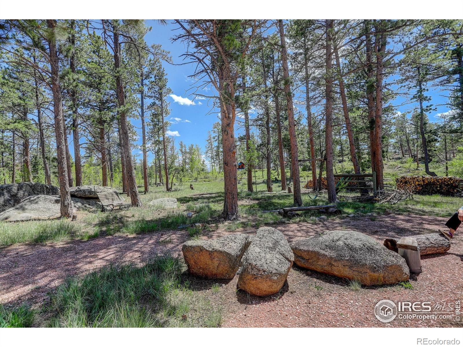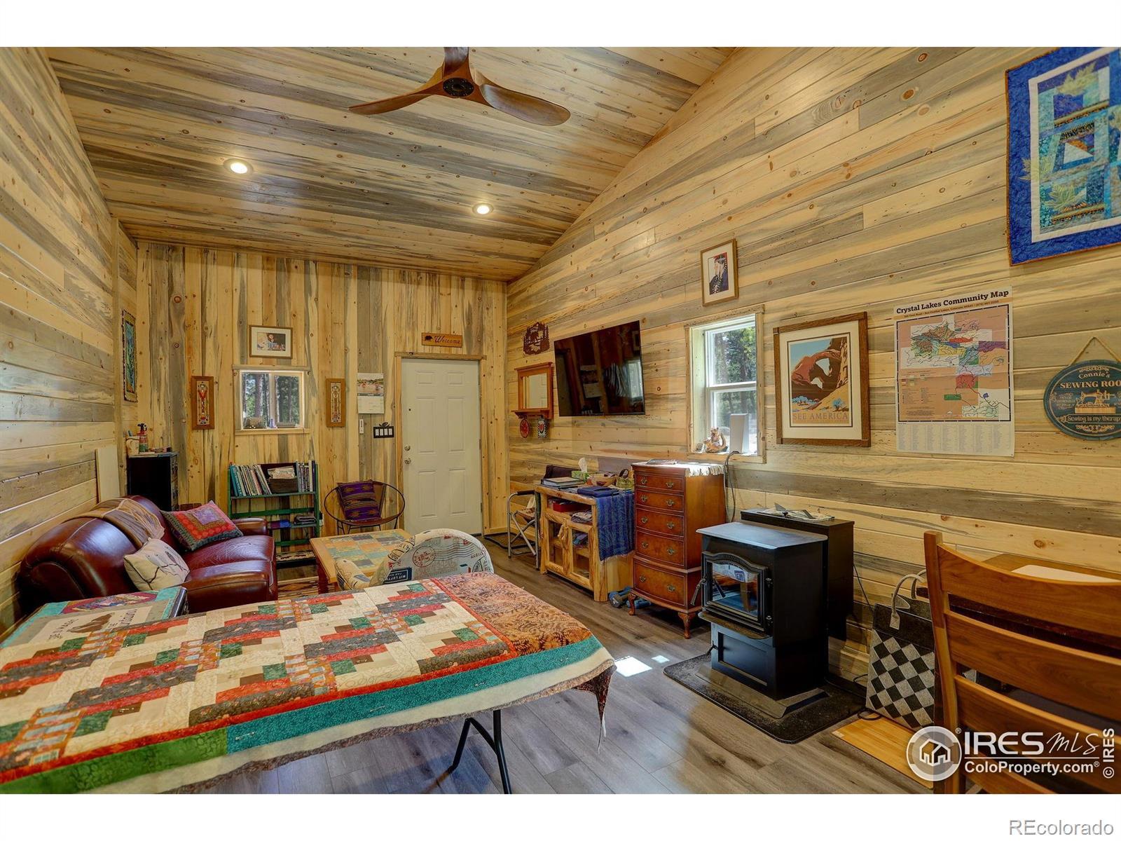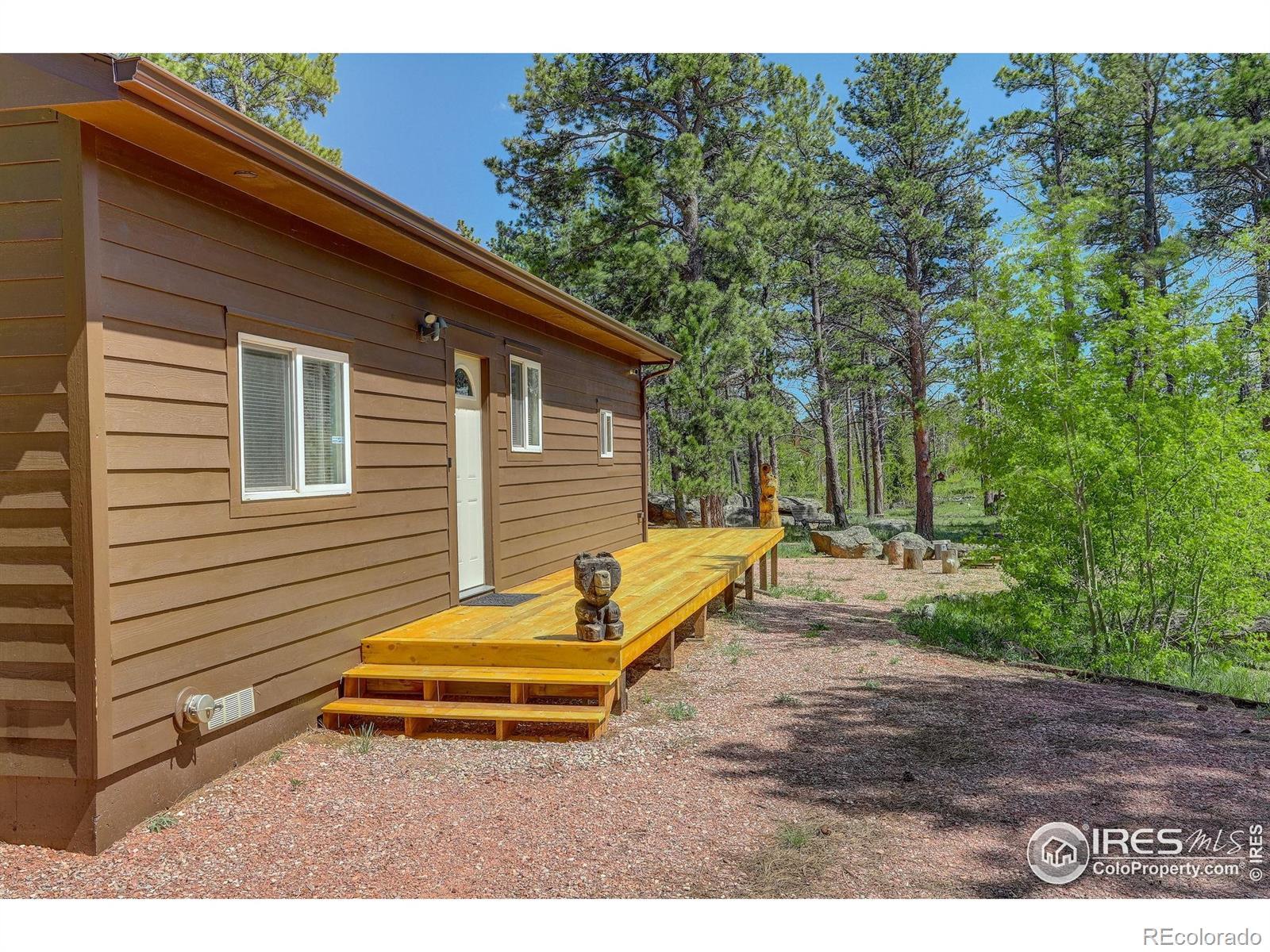 Beautiful 2 bedroom mountain cabin with large custom-built outbuilding, providing roughly 2,000 square feet of heated living and work areas. The property is conveniently located just inside of the Crystal Lakes Community, a private mountain subdivision located in Larimer County, Colorado... 5 minutes from Red Feather Lakes Village (Ace Hardware, liquor store, trading post, grocery store, Pot Belly Restaurant, Tavern at RFL, etc.), 23 miles West of Hwy 287 just North of Fort Collins. Situated on 3 flat tree filled acres, this property features Aspen groves, tall Pines, and gorgeous rock outcroppings. This home has been meticulously maintained and has custom finishes throughout, featuring an updated kitchen w/ gas stove/oven and Bamboo floors and Aspen trimmed kitchen window and doors. Newer propane furnace + electric baseboard heat, on-demand hot water, well and septic permitted for additional bed & bath. In the last couple of years, the outbuilding has been fully insulated and divided into a garage/shop area plus an office/hobby/TV room, beautifully finished in Colorado TnG beetle kill. Harman pellet stoves provide excellent heat sources for the shop and hobby room. Circle driveway in the front... separate entrance in rear with lots of parking for your trucks, rv's, trailers, etc. Internet and phone are excellent and reliable, provided through Starlink. HOA plows the roads during snow season.