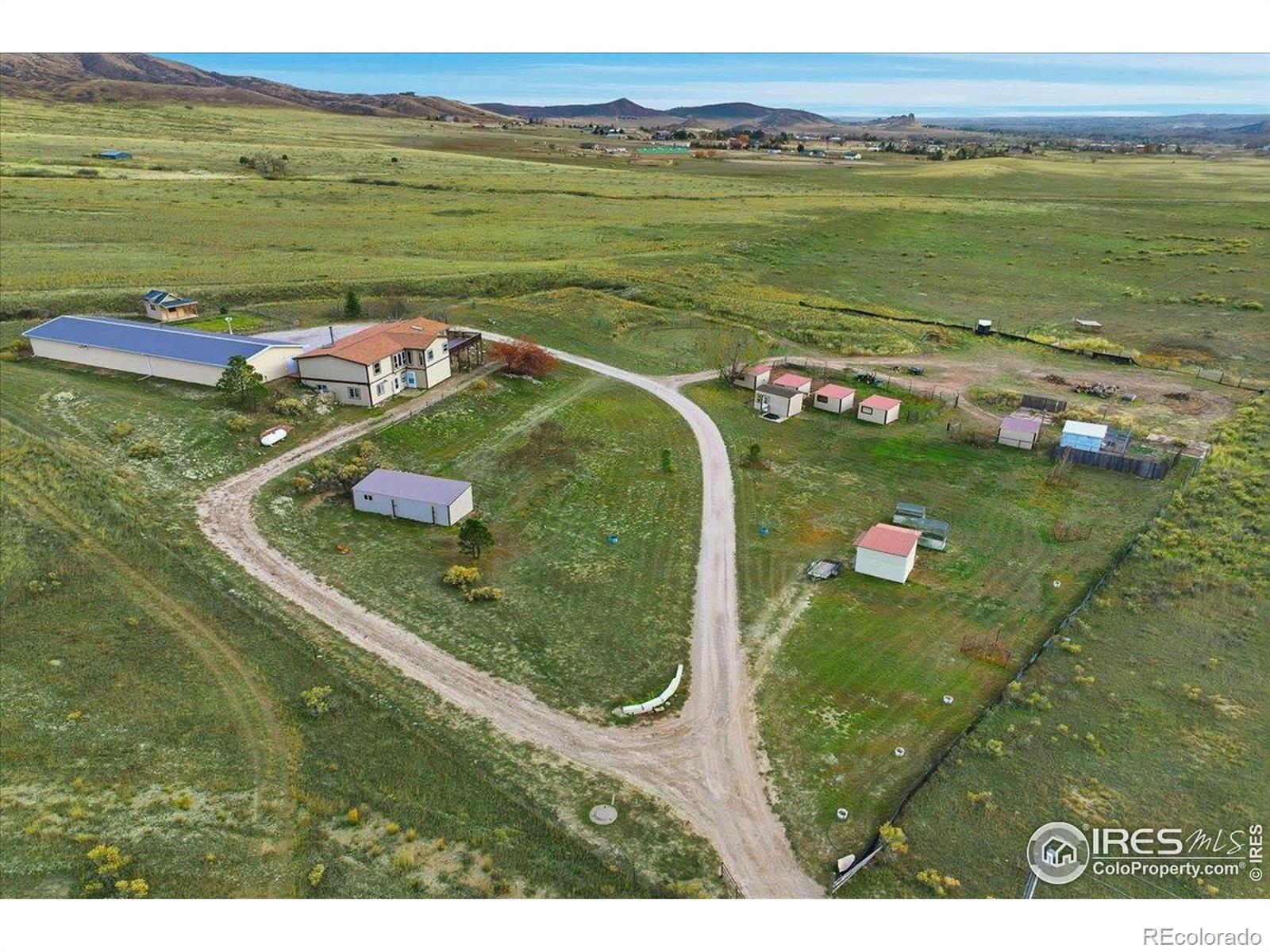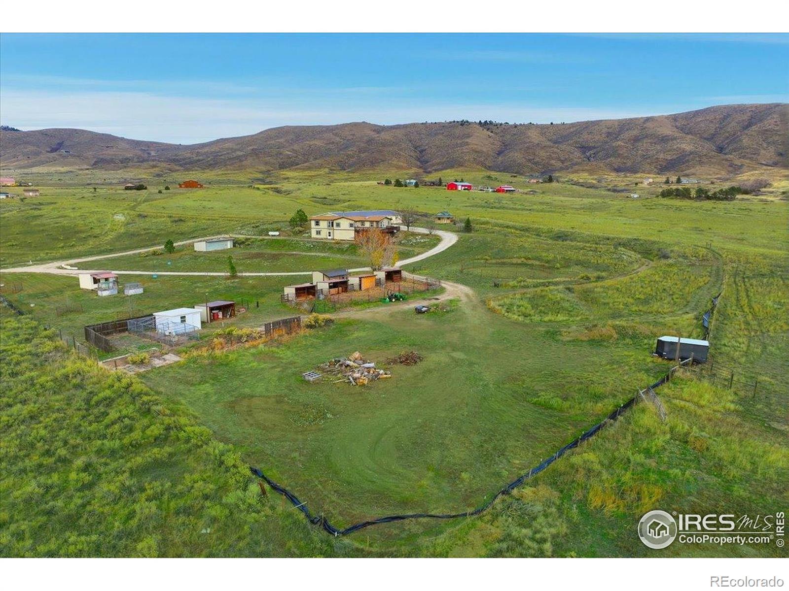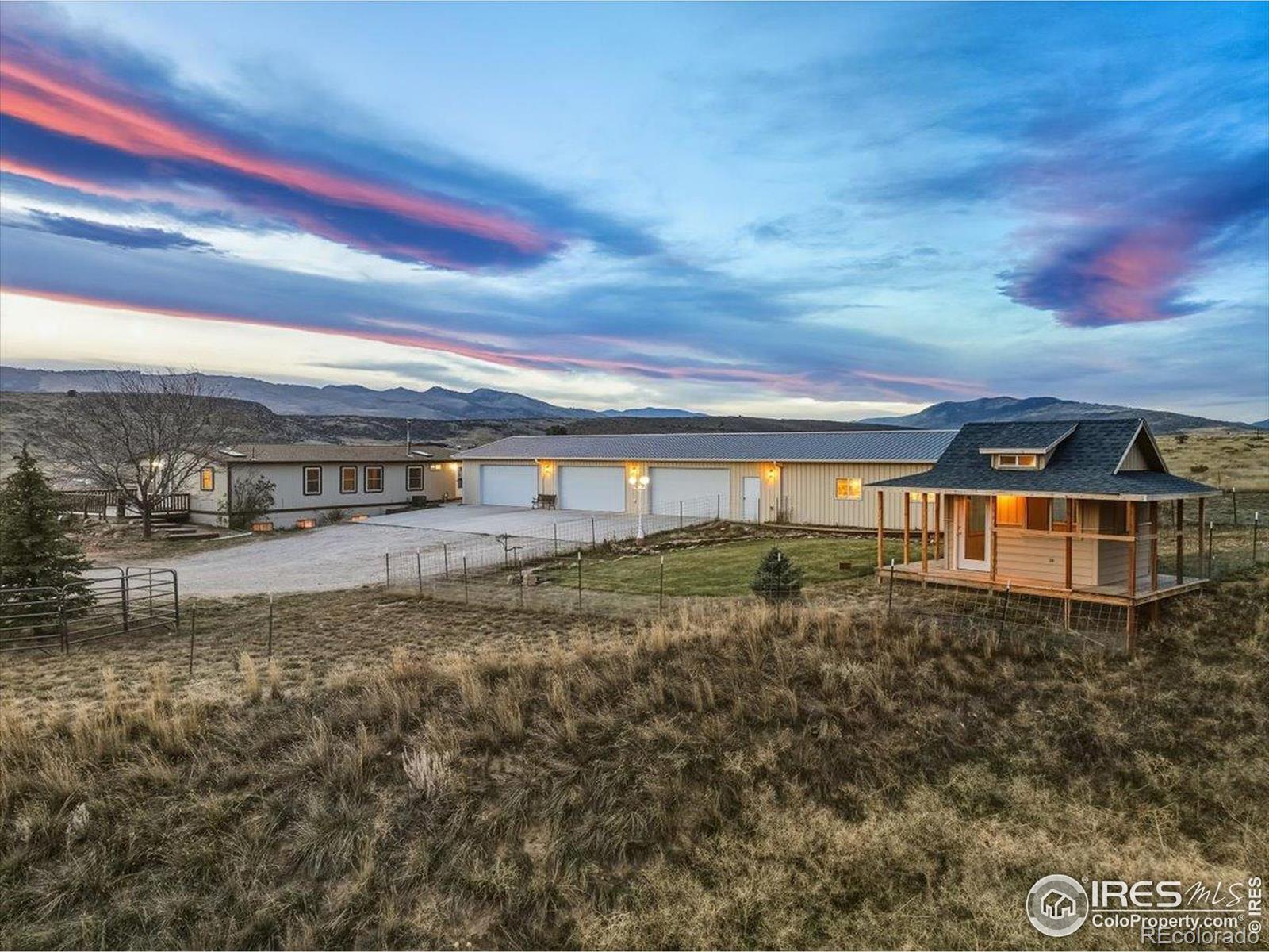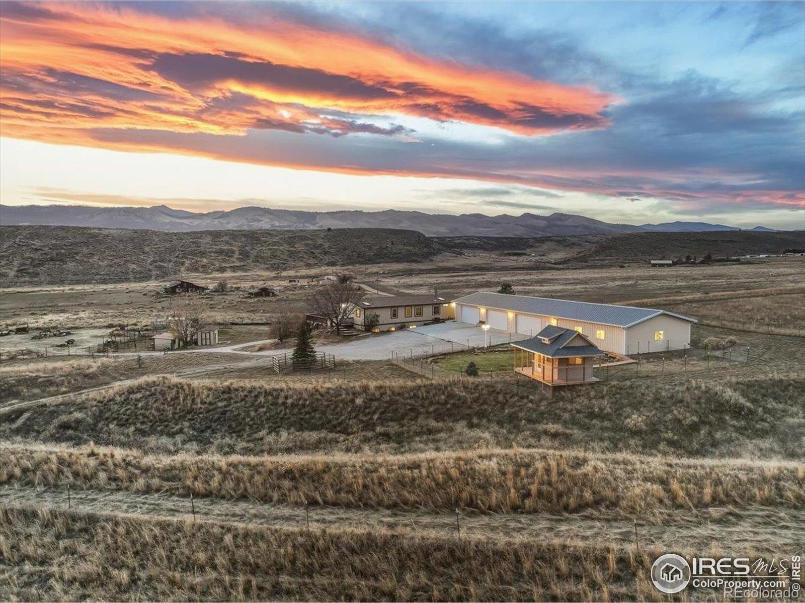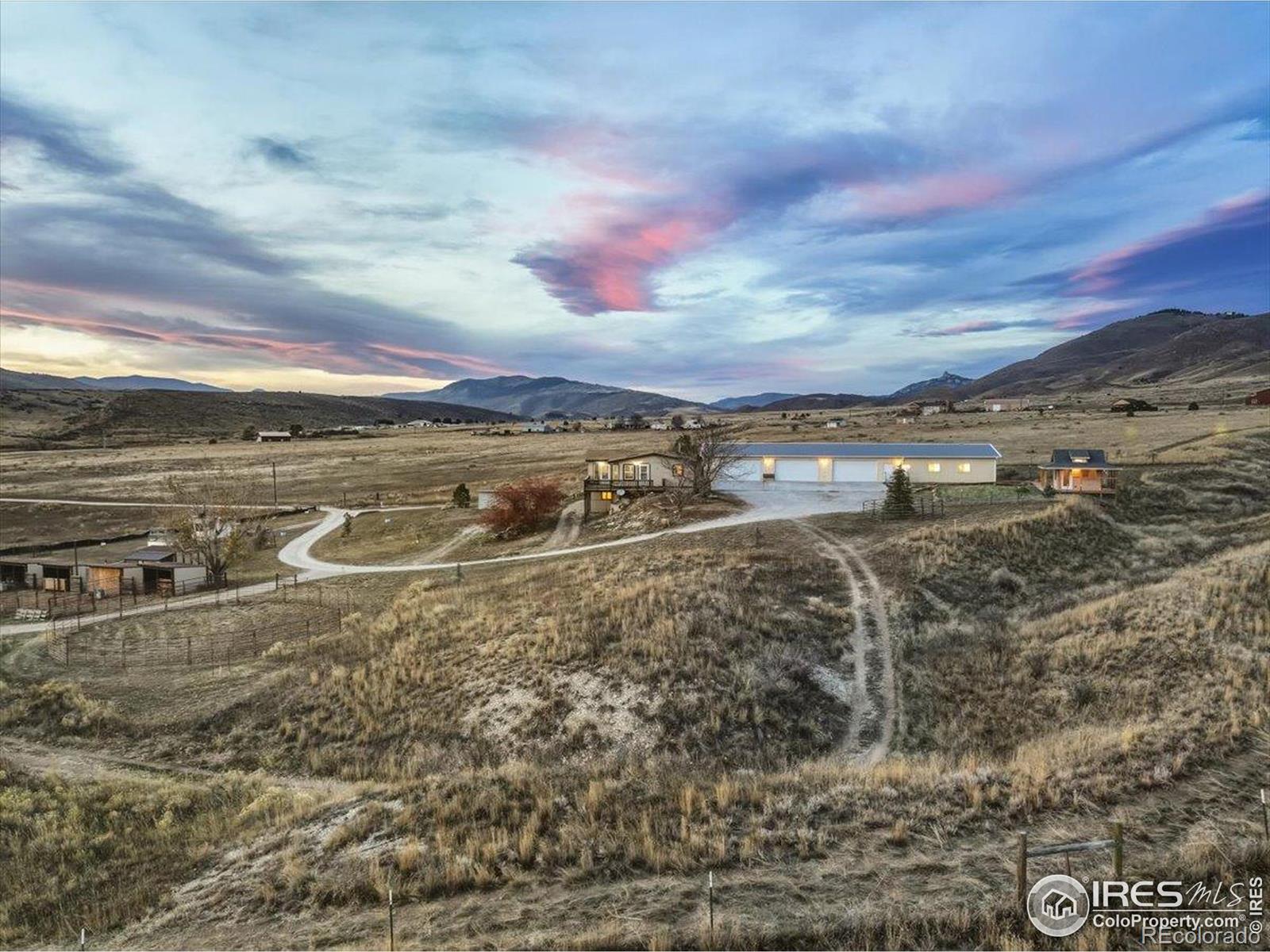 Discover the tranquility and freedom of true Colorado living at 7200 Hiding Elk Lane in Loveland. Set on 35 acres, this welcoming ranch home provides room to live, work, and enjoy the land-without the restrictions of an HOA. With views of the Devil's Backbone and mountains in every direction, this property offers a peaceful retreat while still providing convenient access to town amenities. Inside, the home features an updated kitchen, comfortable gathering areas, and practical main-floor living with a laundry room on both levels. The finished walk-out basement adds exceptional versatility, offering two separate exterior entrances-one into the main living area and one directly into the office. The layout and existing utility connections also allow for the potential to add a second kitchen, making it ideal for multi-generational living, guests, or expanded workspace options. The acreage is well-equipped for animals, recreation, and storage of equipment. A massive 104' x 30' detached 6-car garage with a heated shop provides extraordinary functionality. The property also includes loafing sheds with water, a tack shed, chicken coop, mower shed, sheep shed, and a brand new additional outbuilding with electricity-perfect as a personal retreat, studio, or hobby space. With open land, numerous outbuildings, and panoramic views, this is a rare opportunity to live the Colorado lifestyle.