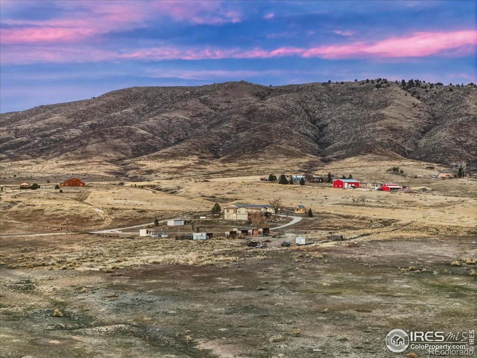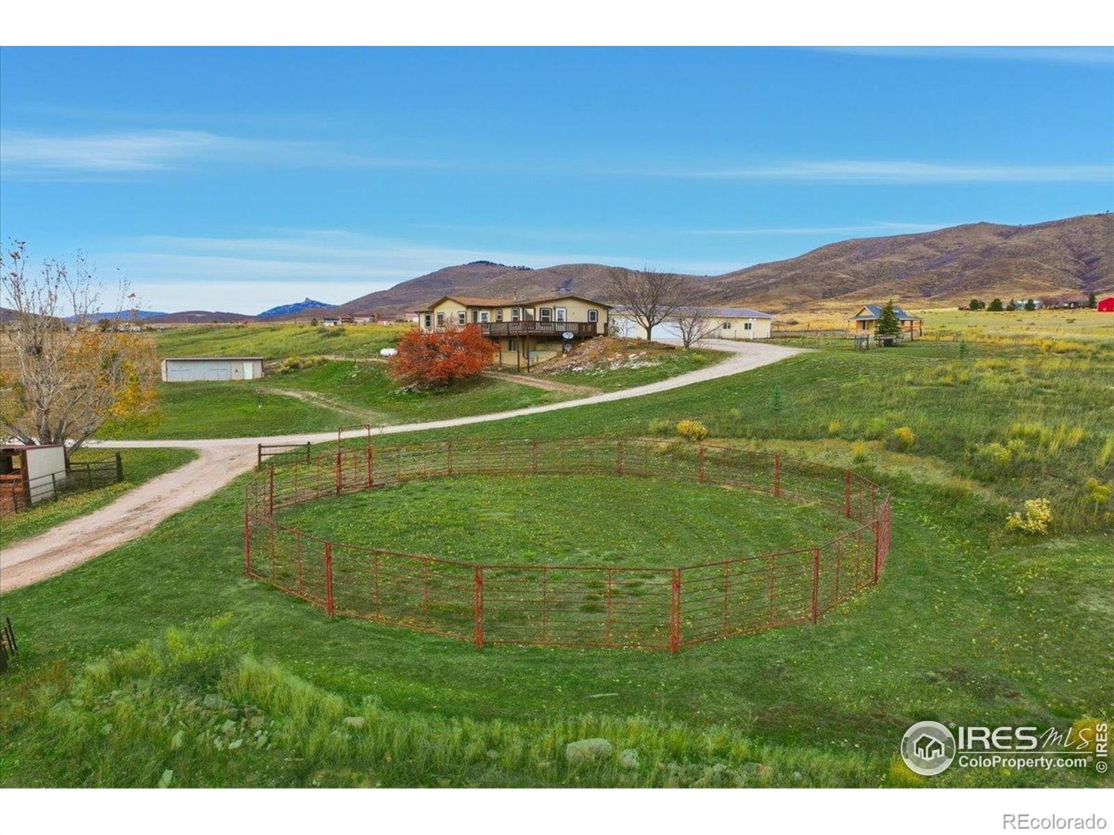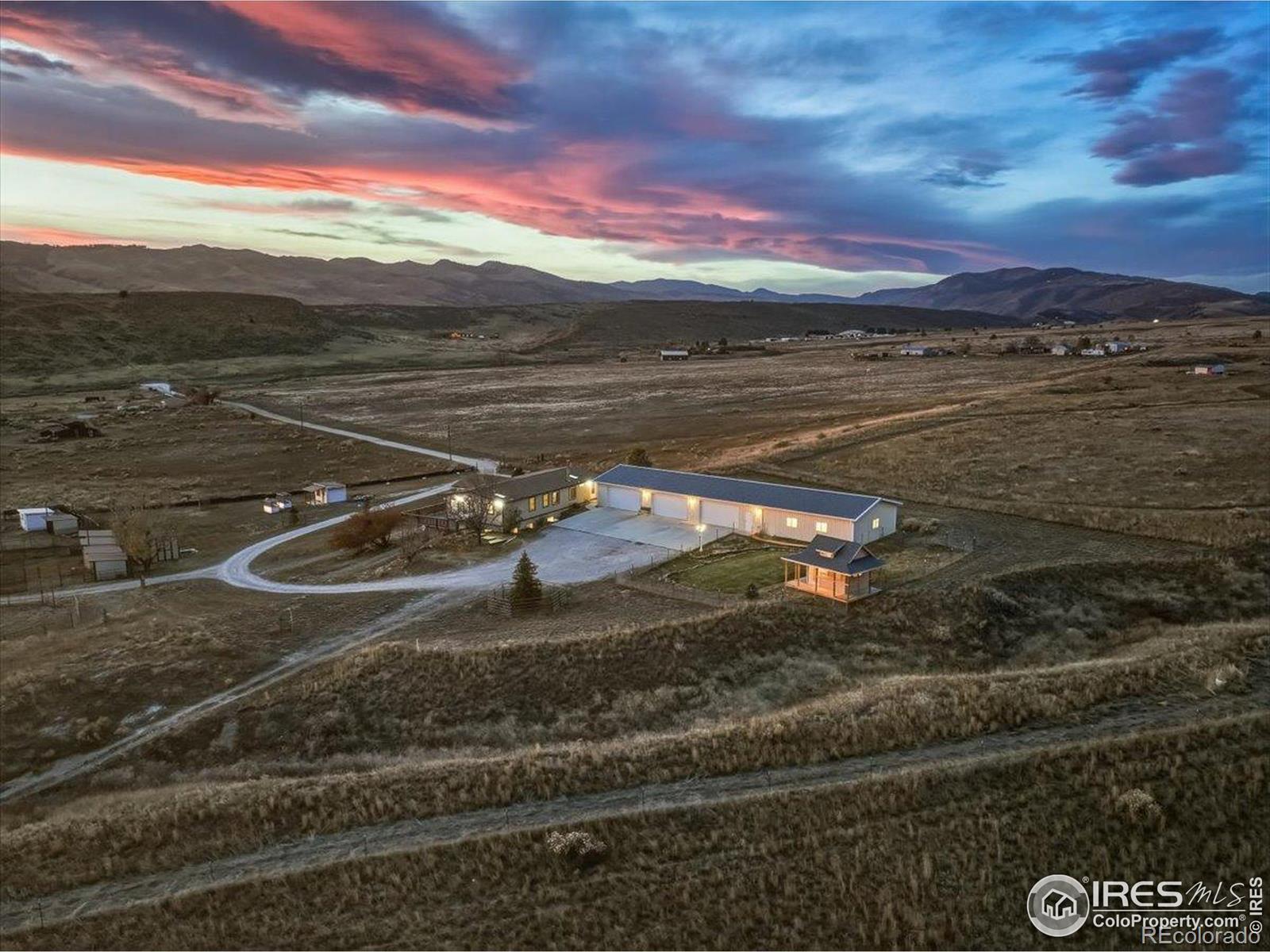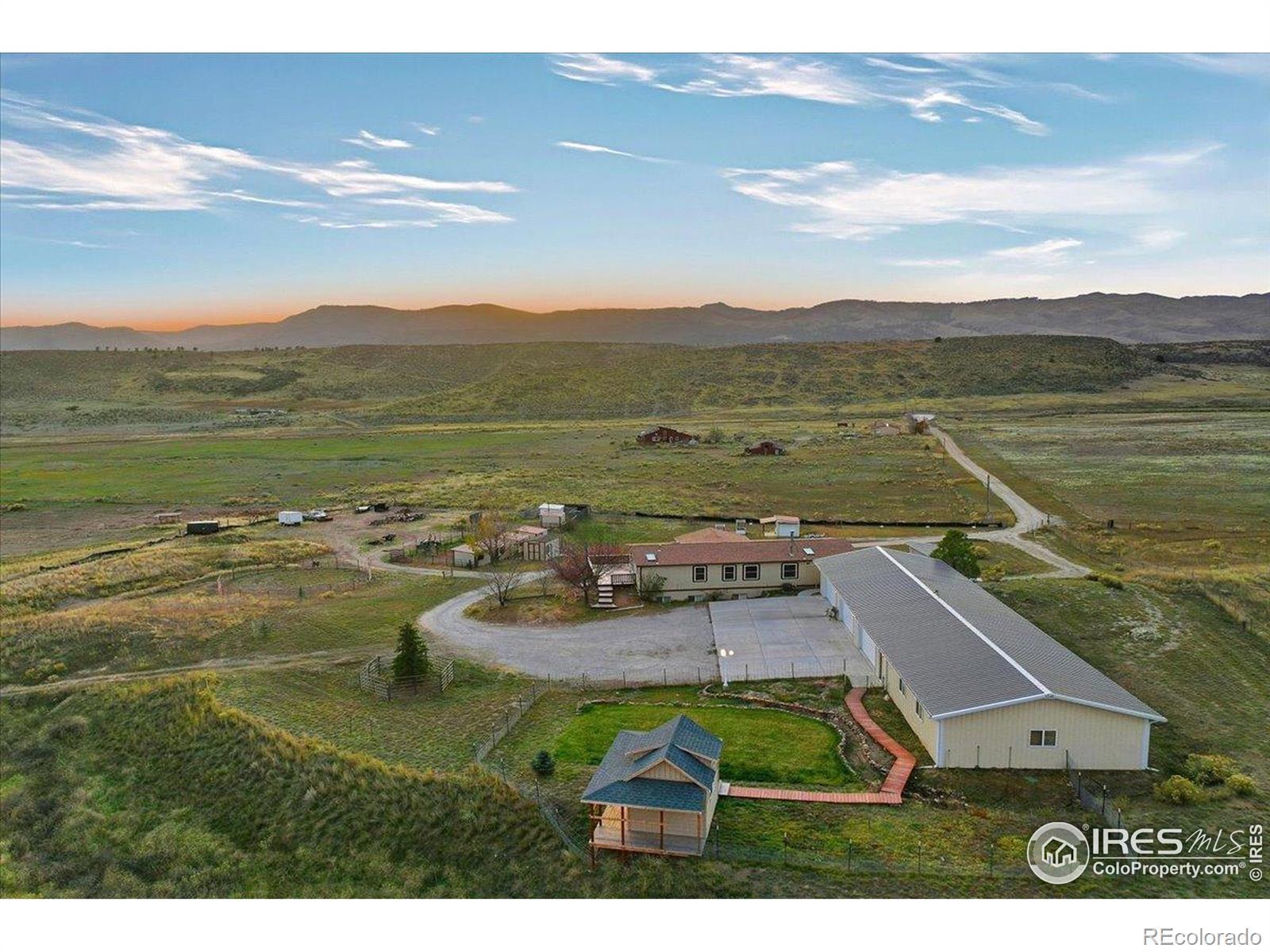 Discover the tranquility and freedom of true Colorado living at 7200 Hiding Elk Lane in Loveland. Set on 35 acres, this welcoming ranch home provides room to live, work, and enjoy the land-without the restrictions of an HOA. With views of the Devil's Backbone and mountains in every direction, this property offers a peaceful retreat while still providing convenient access to town amenities. Inside, the home features an updated kitchen, comfortable gathering areas, and practical main-floor living with a laundry room on both levels. The finished walk-out basement adds exceptional versatility, offering two separate exterior entrances-one into the main living area and one directly into the office. The layout and existing utility connections also allow for the potential to add a second kitchen, making it ideal for multi-generational living, guests, or expanded workspace options. The acreage is well-equipped for animals, recreation, and storage of equipment. A massive 104' x 30' detached 6-car garage with a heated shop provides extraordinary functionality. The property also includes loafing sheds with water, a tack shed, chicken coop, mower shed, sheep shed, and a brand new additional outbuilding with electricity-perfect as a personal retreat, studio, or hobby space. With open land, numerous outbuildings, and panoramic views, this is a rare opportunity to live the Colorado lifestyle.