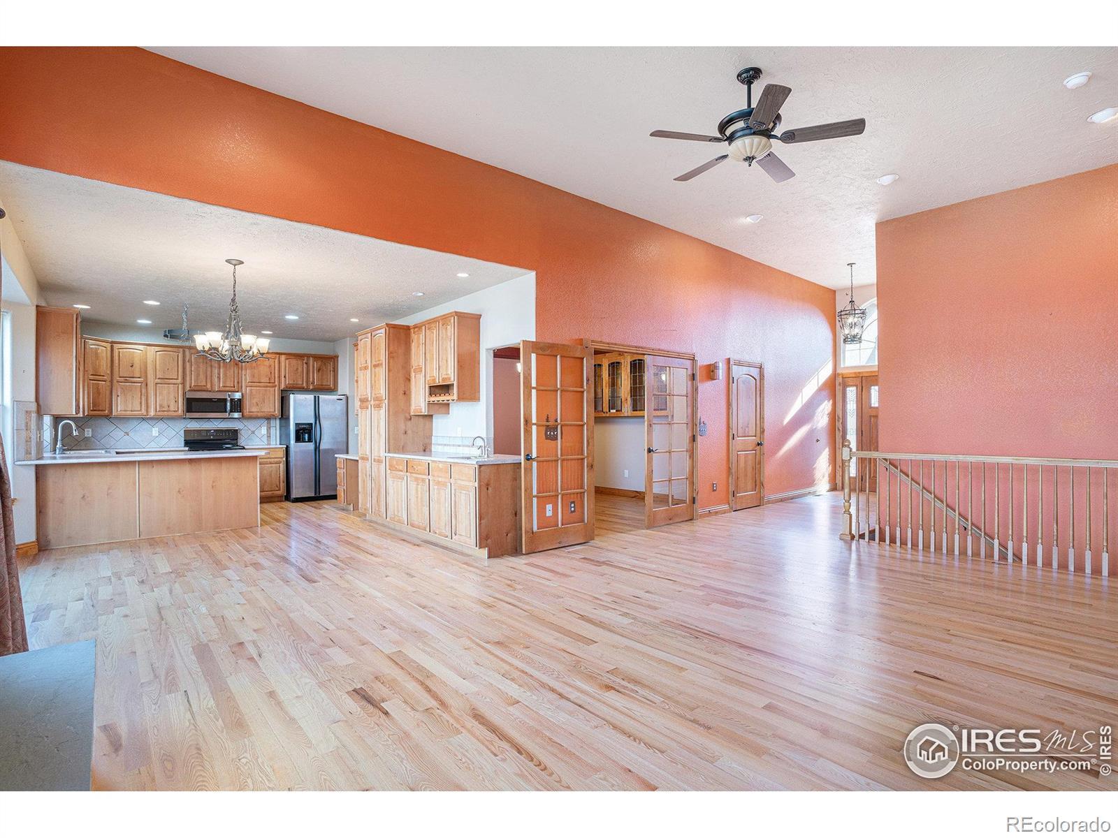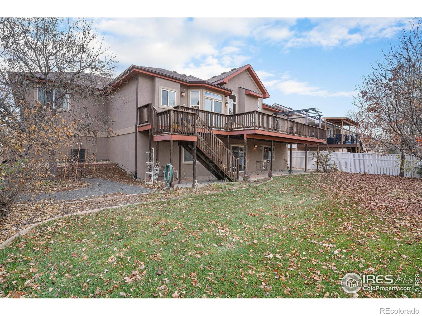 Beautiful ranch style home, custom built with solid wood floors, trimwork and doors. Open floor plan with walk-out basement and 3 car garage in West Greeley. It's vaulted living room creates the feel of open space with the centerpiece being a floor-to-ceiling stone fireplace flanked with windows in living room with vaulted ceilings. Hand-crafted stained glass panels in custom built dining room cabinets and glass french doors. Butlers bar in kitchen flanked with pull out cabinets and drawers and chefs hanging wrought-iron pot holder. Perfect for a cooks kitchen! Seperate laundery room is complete with extra shelving and laundry sink. More shelving in hallway for appliances or food srotage. Half bath at garage entry. Formal dining room complete with above mount lighting for an ambiant dining experience. Decking off kitchen that provides more outside entertaining space! Lovely primary bedroom with luxury 5-piece bathroom and walk in closet with high windows. Lower level large, spacious and perfect for more space for more entertaining, ofrering a wet-bar, bar fridge and cozy space for bistro table, wine racks graced decorated with a hand painted 'Italian Villa' wall and full wine rack. 2 more ample-sized bedrooms with bathroom and walk-in shower. Walkout to covered a shaded porch area and landscaped backyard for privacy. Set up for even-flow and more space for guests to enjoy! Don't wait, this home offers everything for everyone! Low electric bills. Solar is completely paid off!