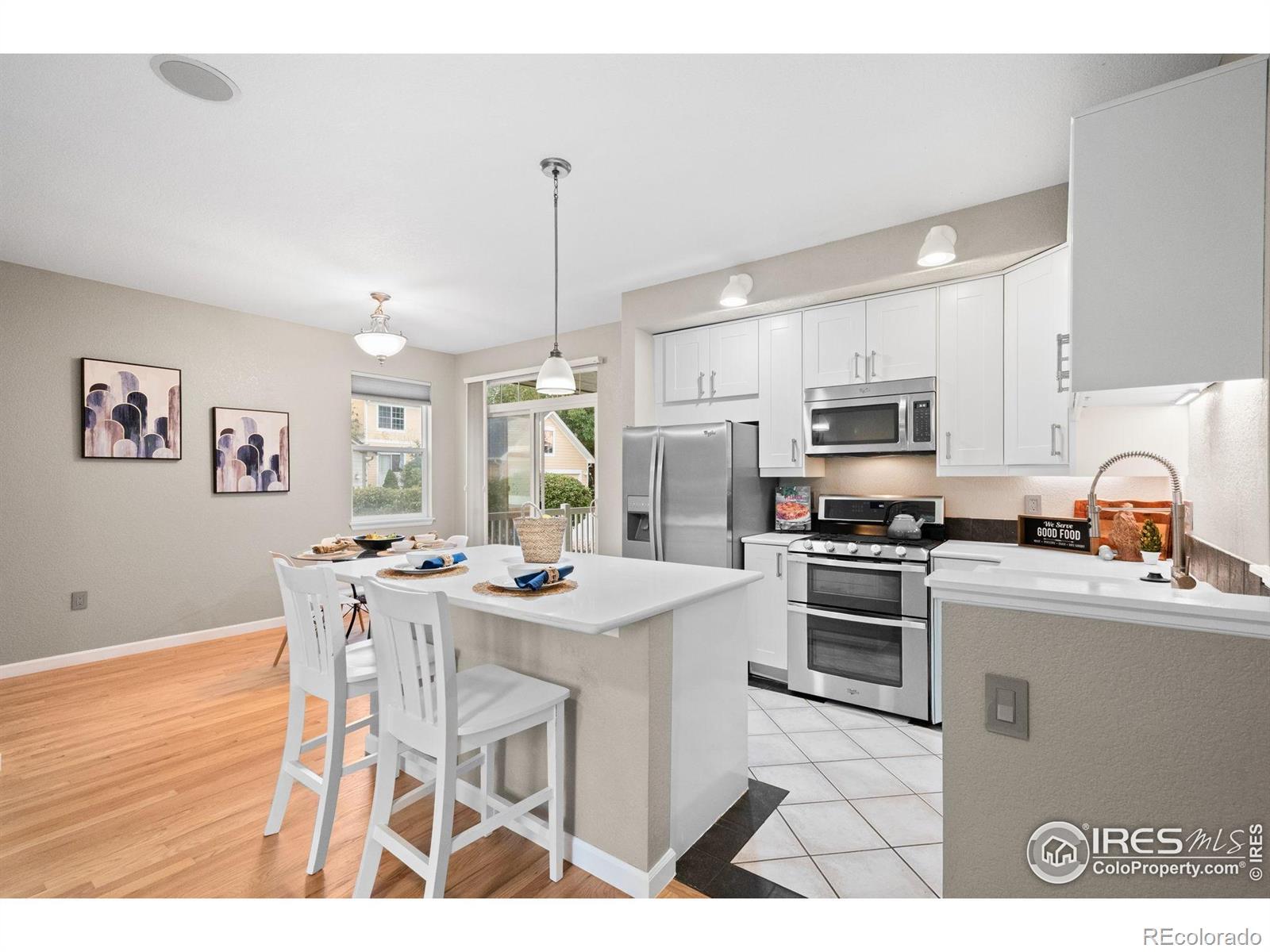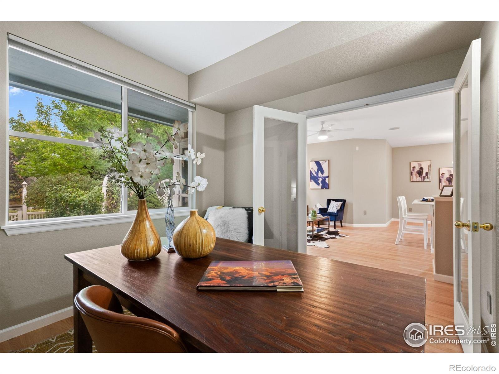 LOCATED IN SOUTHWEST LONGMONT, EASY ACCESS TO BOULDER. Sunny ground-floor corner unit with excellent natural light from 3 of the four walls. Not a stair or a step in this freshly updated 3-bedroom and 2-bath condo. The updates include modern white kitchen cabinets and newly refinished hardwood floors throughout; no "lived-in" carpeting to deal with. Open and easy to entertain between the kitchen, dining, and living areas. The master bedroom is spacious, with ample closet space, and is light and bright with a crawl space in the closet. The master bath features a tub/shower surround and a large vanity with ample storage space. The second bedroom has a large walk-in closet, and with lots of natural light, the third bedroom can also be used as a home office for the work-from-home professional. The main bath also features a tub/shower surround and a spacious vanity. The detached single-car garage is just steps away from the unit and includes shelving for additional storage-located in the highly desired St. Vrain Valley School District. The unit also includes an ample, fenced outdoor space, landscaped with low maintenance in mind, that provides a nice, private place to entertain in warmer months. Close to shopping at Village of the Peaks, Whole Foods Market, and Target. This lovely home is ready to move in and enjoy!