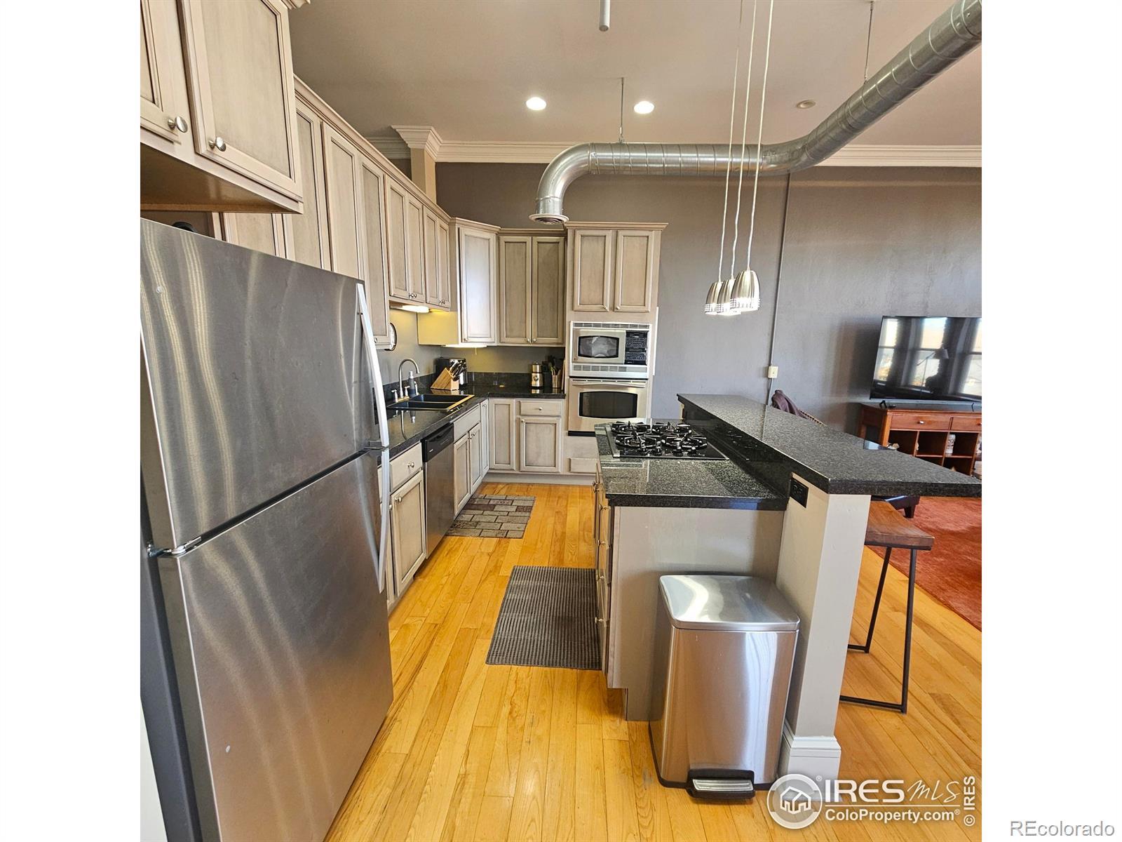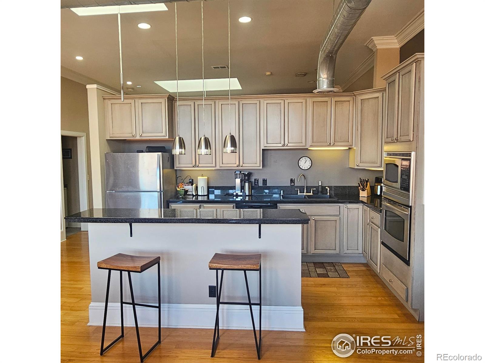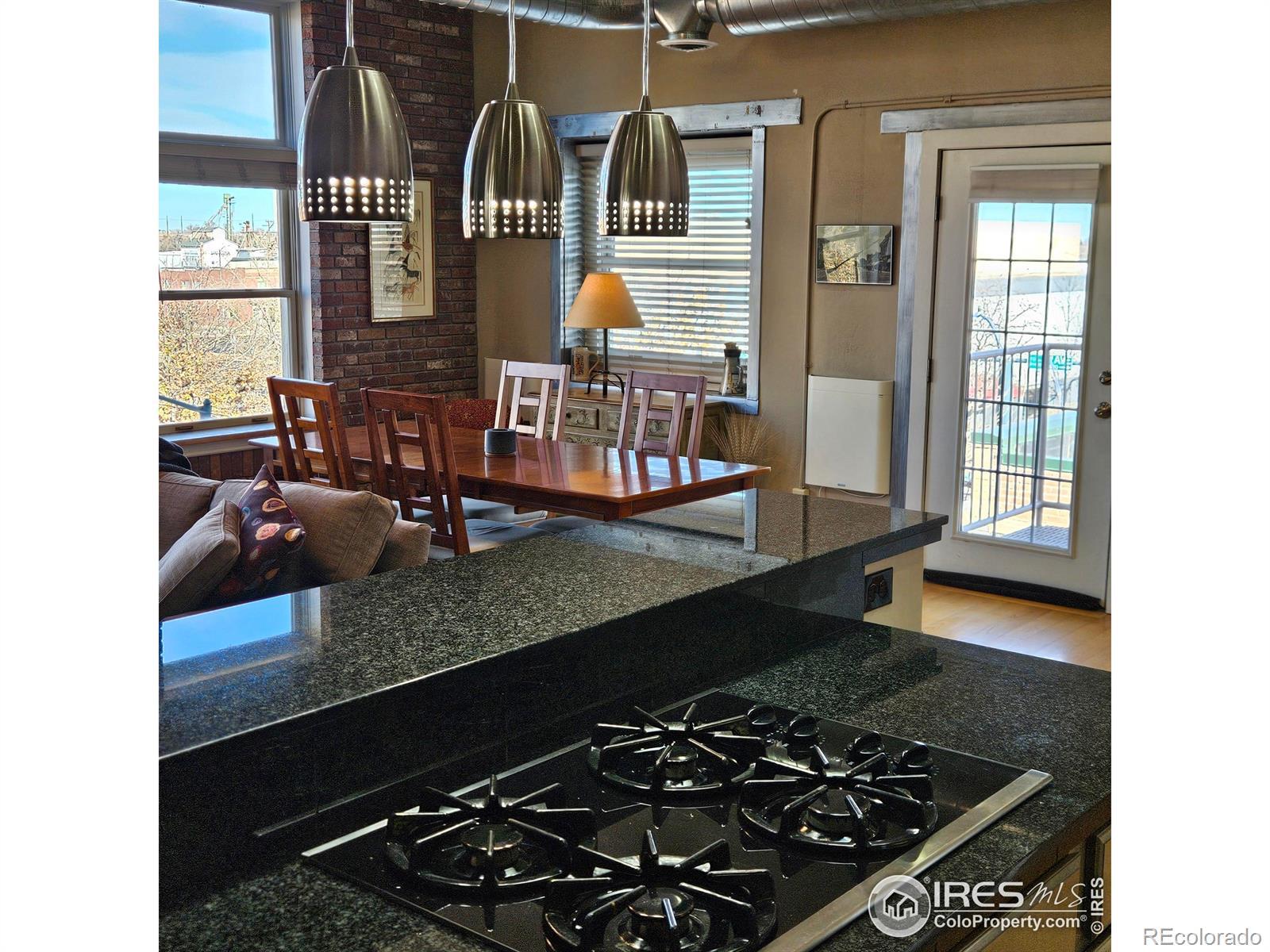 Top floor penthouse unit in the Shaw Loft Building with 10'+ high ceilings, brick accent, wood floors, granite kitchen counters, premium cabinets, gas range/oven, built-in microwave, washer/dryer. Located in the heart of historic downtown Greeley overlooking the 8th Street Plaza. Walk to restaurants, Moxi Theater, Natural Grocers, LINC Library, UCCC, recreation center and other nearby amenities. Individual HVAC equipment provides separately metered heating and cooling. Additional private storage closet located off common area near main staircase measures approximately 6' X 7' great for storing seasonal items and other personal gear in a secure area. Shared rooftop deck with direct access from unit. All 8 of the residential lofts at the Shaw Building are unique with each unit custom designed and built. The Shaw Loft building has a friendly and upscale feel in an unbeatable downtown location. No onsite parking but permits for parking in City lot directly across the street are available at nominal cost. Owner Agent lives in unit. Main residential entrance is on 8th Avenue via double glass doors. There is also a side entrance on 8th Street Plaza. Access code required for entry into building using the keypad next to exterior doors. From main floor lobby take stairs to the second floor and proceed up another 8 steps to "west building section" landing. There you will see entry door to unit #301. Once inside unit you will have another flight of private stairs to reach top floor living quarters. PLEASE READ - Because of the unique nature of the Shaw Building as a mixed-use condo project (residential and retail units) it does not meet conventional lending guidelines and will not be approved by government-backed lenders like Fannie Mae or Freddie Mac unless an exception waiver is granted by lender ("non-warrantable"). No FHA or VA loans. Cash or Conventional Financing Only. FirstBank and other portfolio lenders will consider funding with minimum down payment and solid credit.
