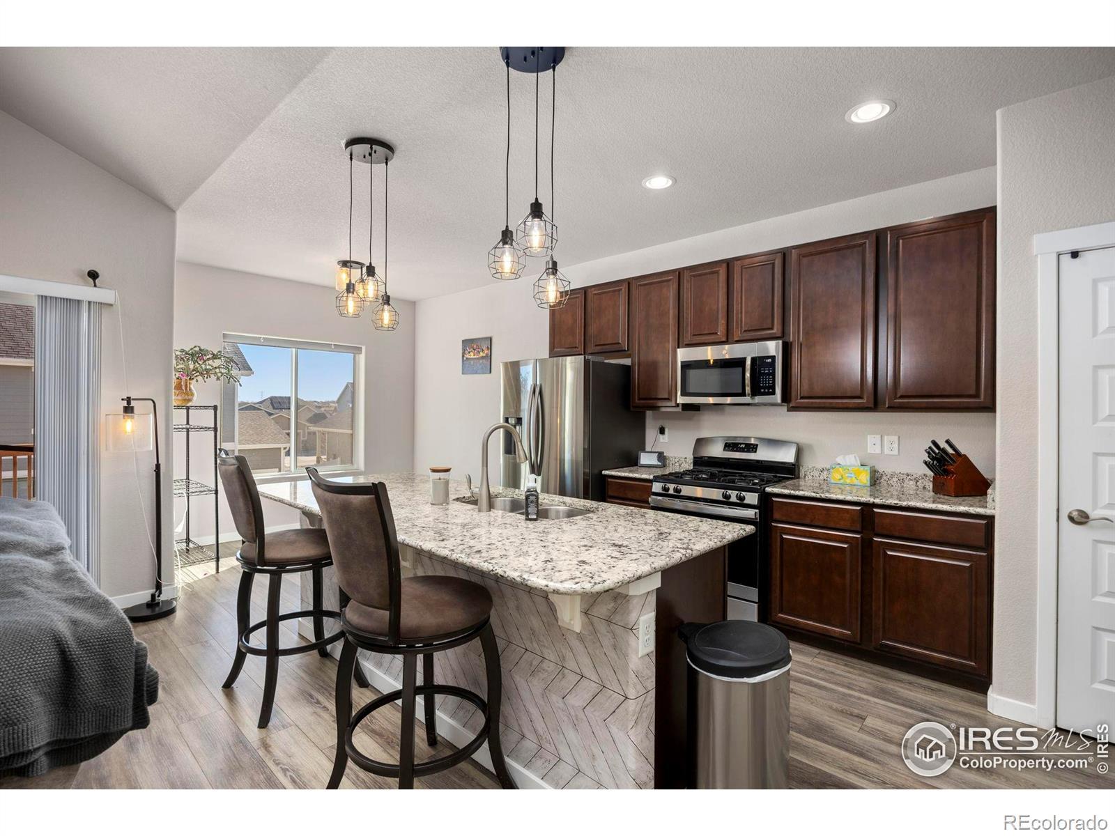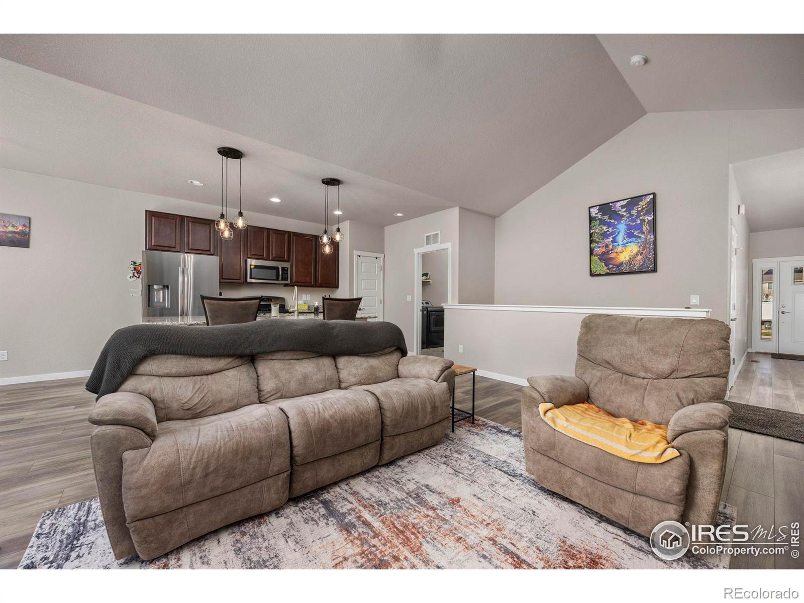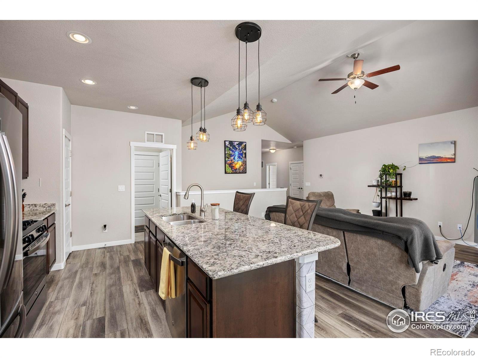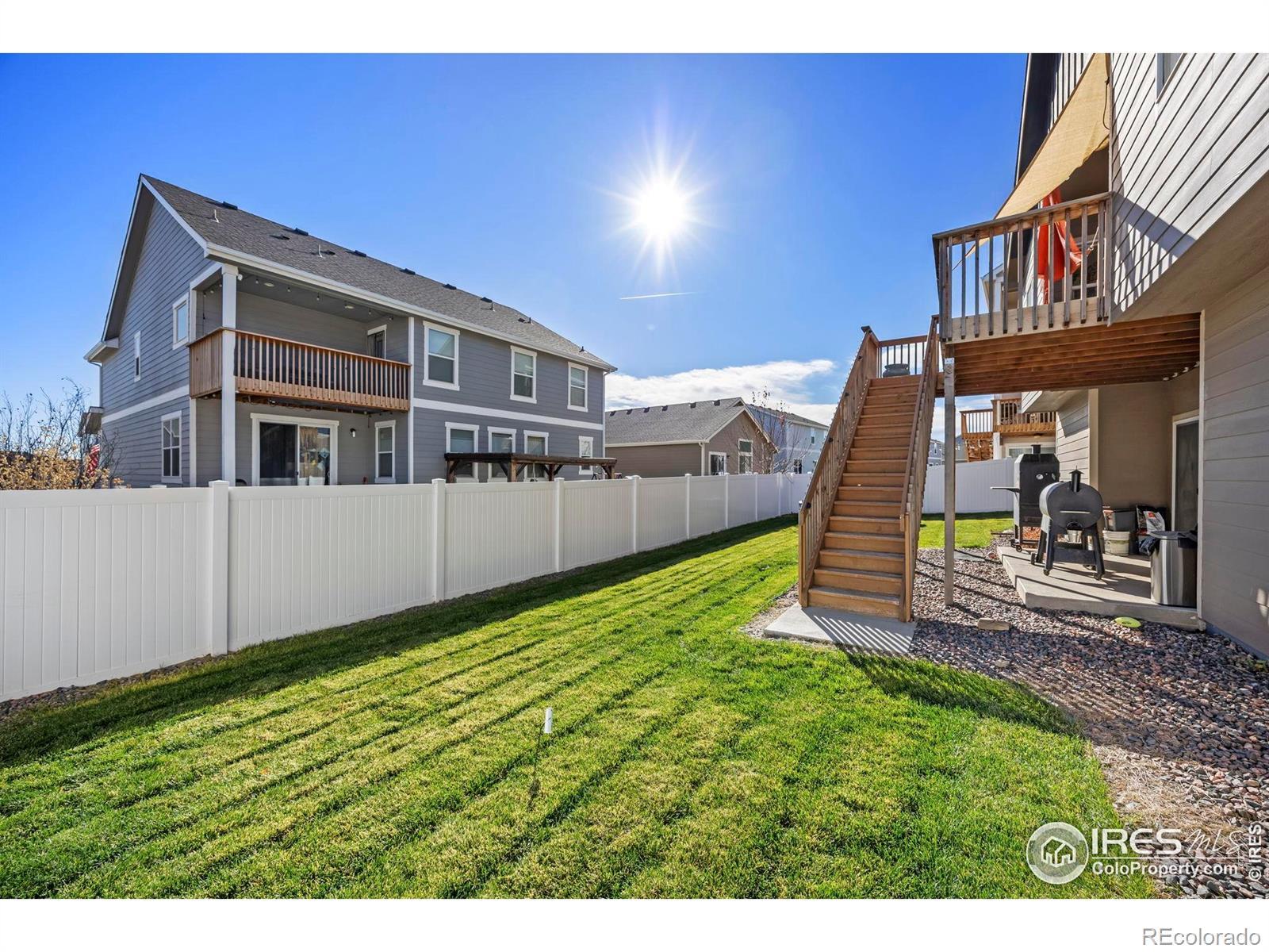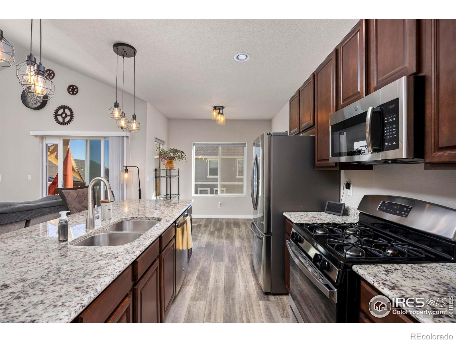 This beautifully maintained 5-year-old ranch-style home offers the perfect blend of modern elegance and functional living. Step inside to discover an inviting open-concept layout where the kitchen, dining, and living areas flow seamlessly-ideal for everyday living and entertaining alike. Stunning granite countertops extend throughout the home, adding timeless style and durability. With 2 spacious bedrooms on the main level and 2 additional large bedrooms in the finished walk-out basement, there's plenty of room for everyone to spread out. The expansive basement also features a generous family room with direct access to the well-kept backyard-perfect for movie nights, game days, or hosting guests. Enjoy Colorado living at its finest on the oversized back deck, offering a relaxing setting to unwind and take in the fresh air. With the covered patio below, you'll have year-round outdoor enjoyment. A 3-car garage provides ample storage and space for vehicles, hobbies, or tools. Located in West Greeley in The Trails at Sheep Draw community, this home combines comfort, quality craftsmanship, and convenience-close to parks, trails, shopping, dining, and more. Don't miss your chance to make this stunning home your own!