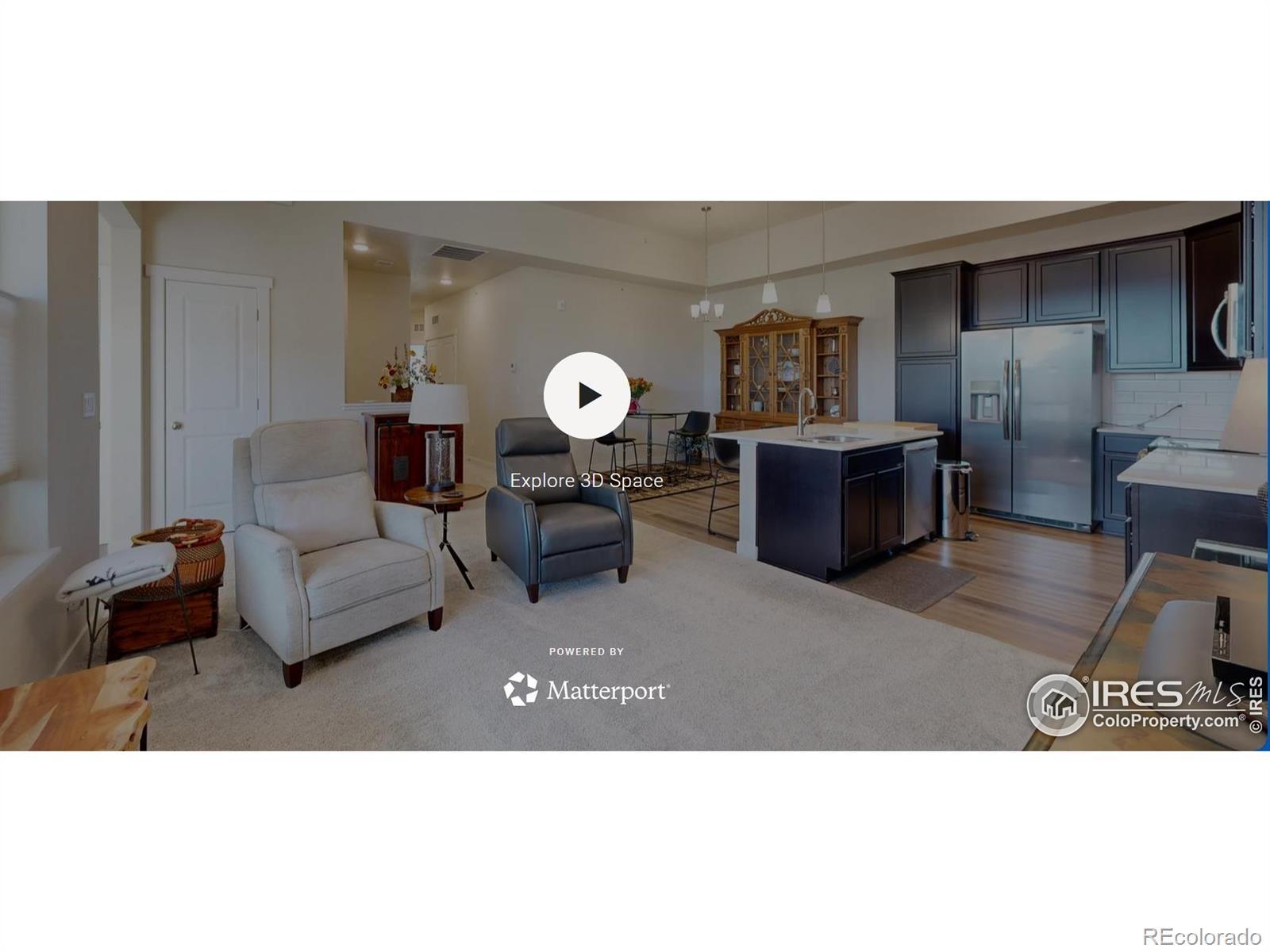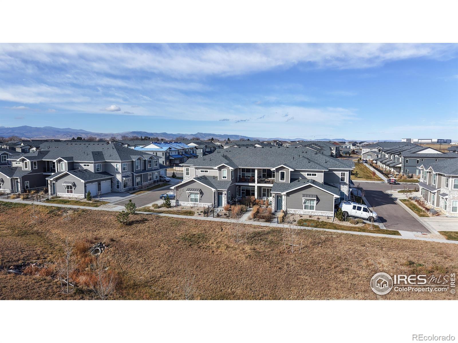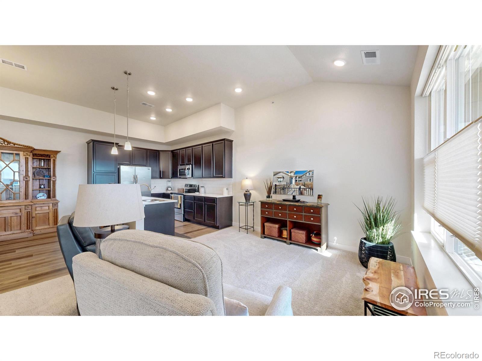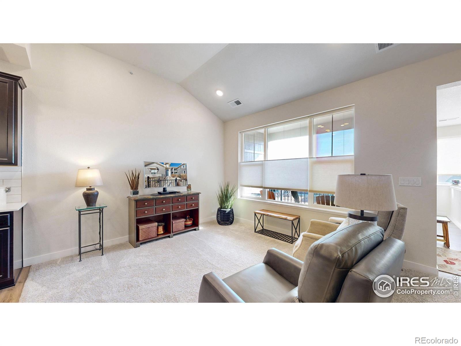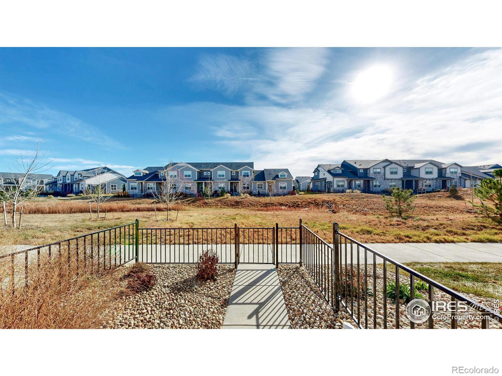 Beautiful, nearly new 3-bedroom, 2-bath condo offering effortless main-level entry with attached garage and spacious upper-level ranch-style living. High ceilings, abundant natural light, and an open-concept layout create an inviting, modern feel. The south-facing entry overlooks peaceful open space, with a private deck also capturing those serene views. Located in the heart of Northern Colorado's Centerra area, enjoy unbeatable access to the interstate, shopping, dining, and community amenities. Neighborhood perks include scenic trails, park areas, and a refreshing pool. Truly better than new with upgraded window treatments throughout-and move-in ready now.