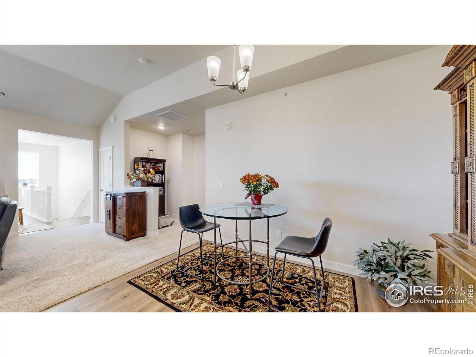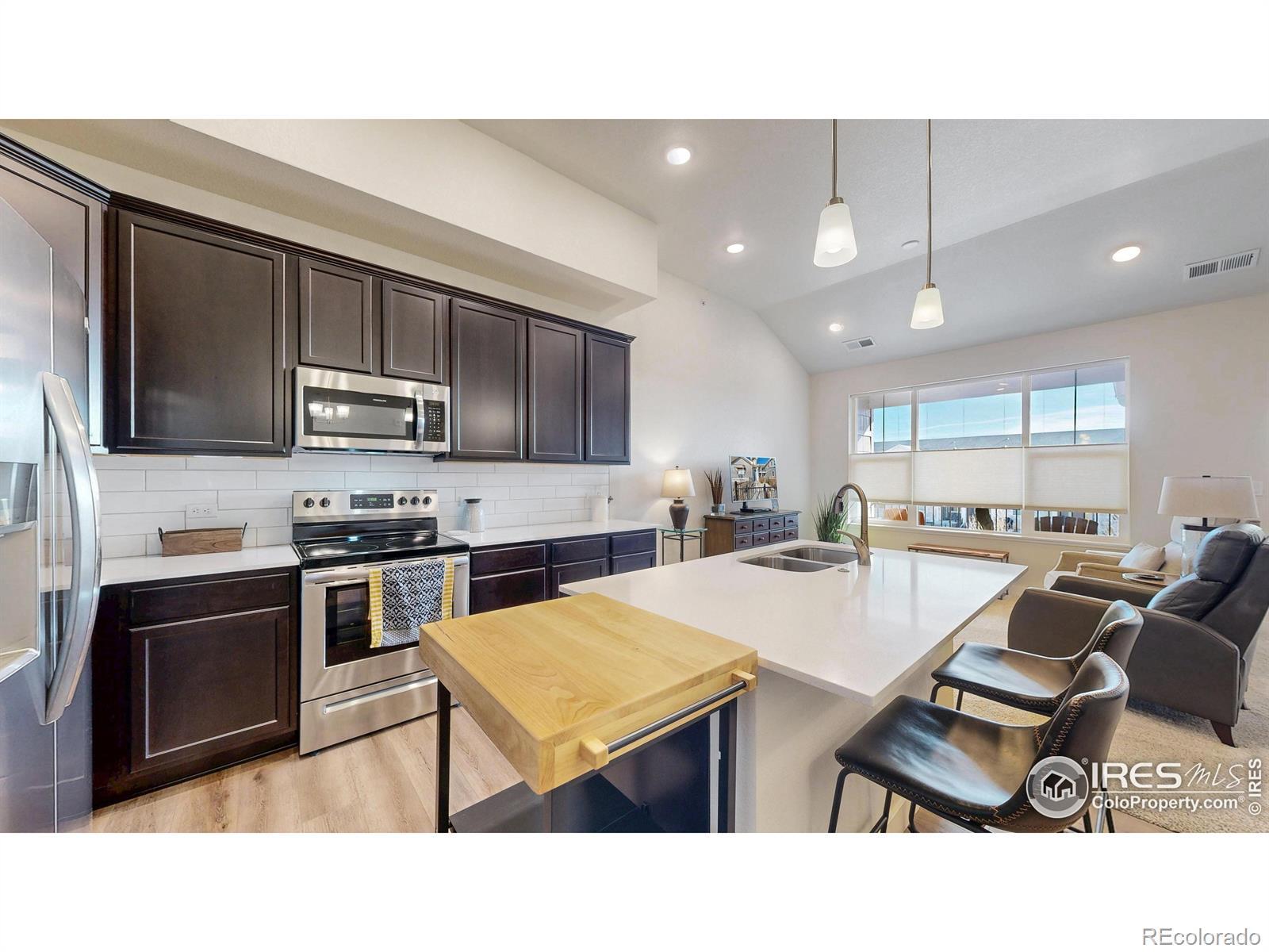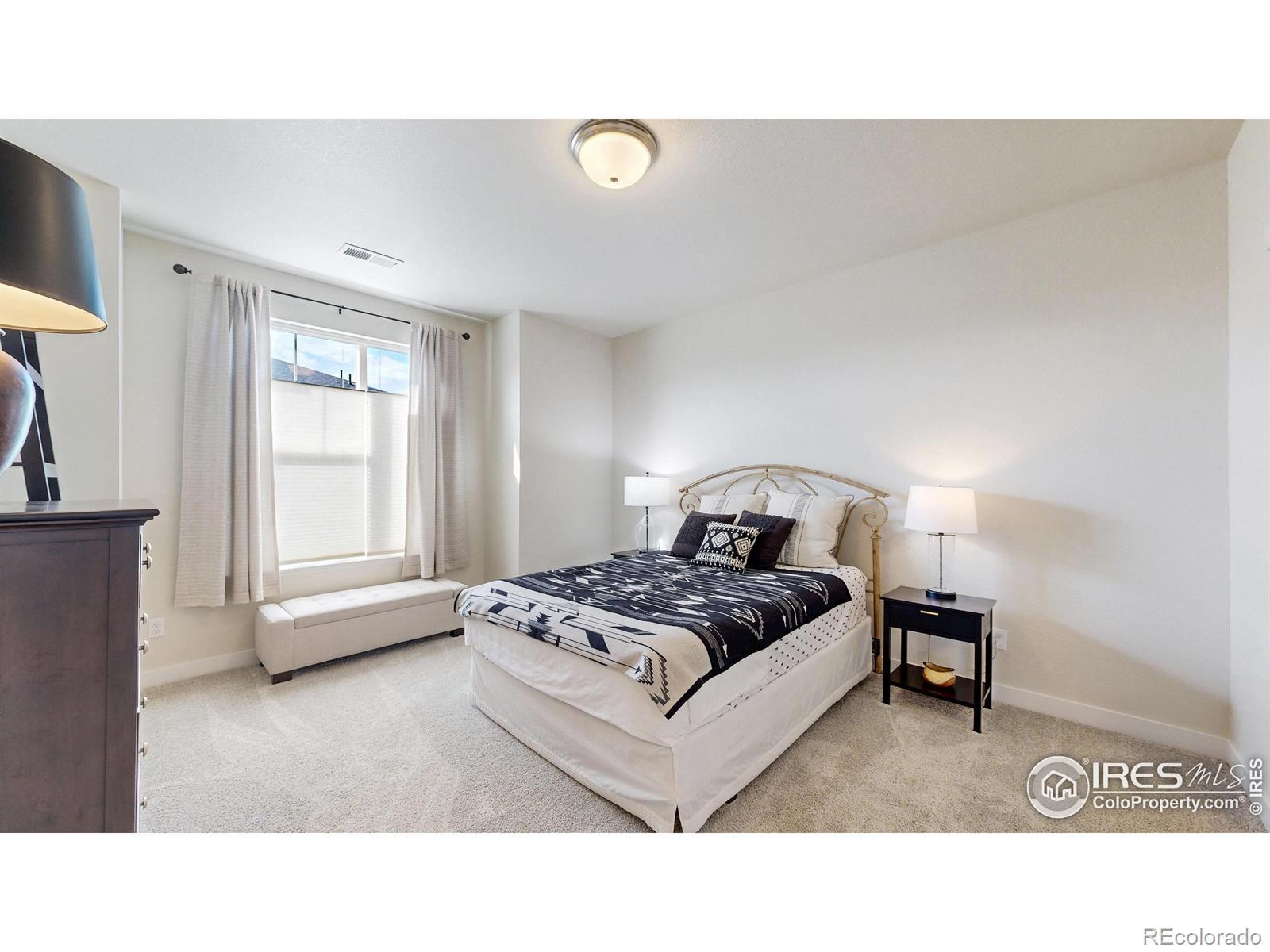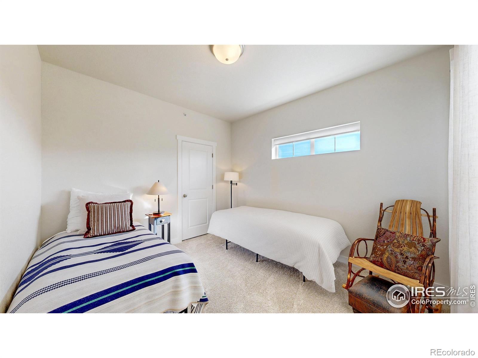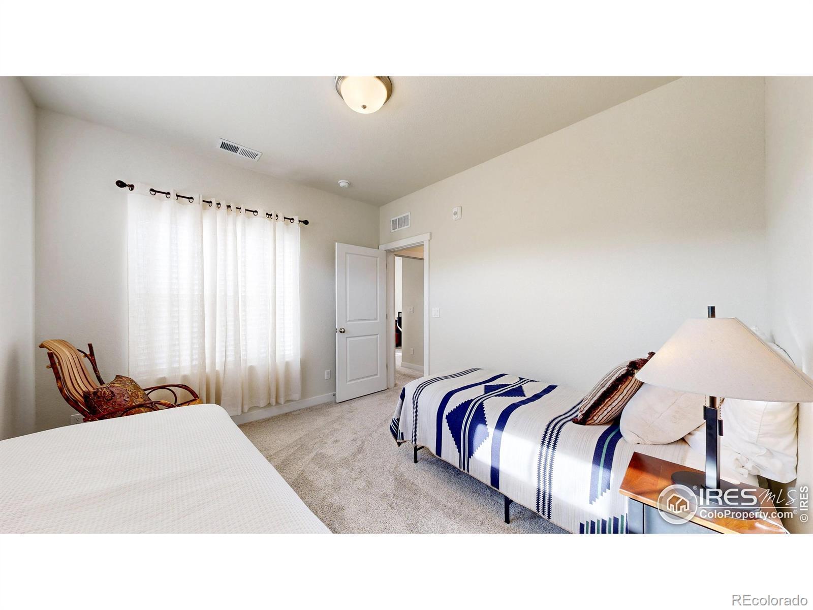Beautiful, nearly new 3-bedroom, 2-bath condo offering effortless main-level entry with attached garage and spacious upper-level ranch-style living. High ceilings, abundant natural light, and an open-concept layout create an inviting, modern feel. The south-facing entry overlooks peaceful open space, with a private deck also capturing those serene views. Located in the heart of Northern Colorado's Centerra area, enjoy unbeatable access to the interstate, shopping, dining, and community amenities. Neighborhood perks include scenic trails, park areas, and a refreshing pool. Truly better than new with upgraded window treatments throughout-and move-in ready now.