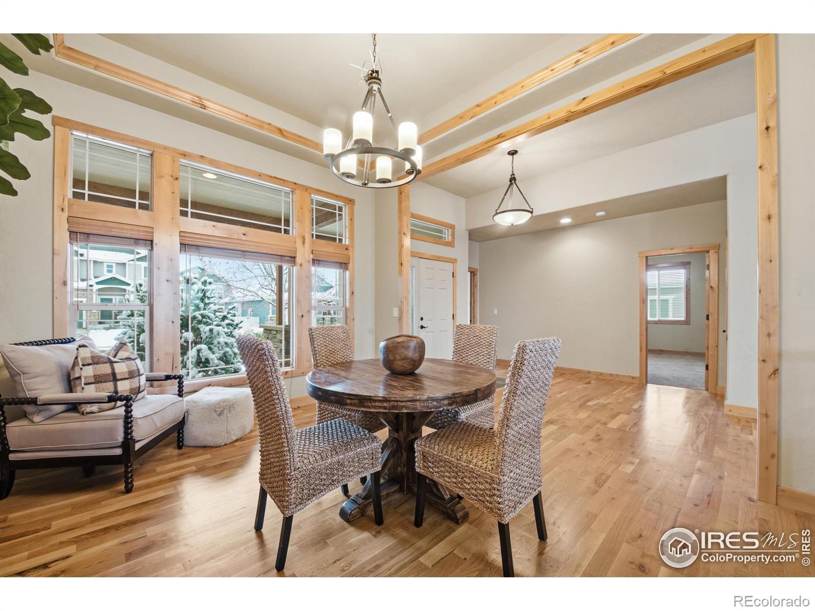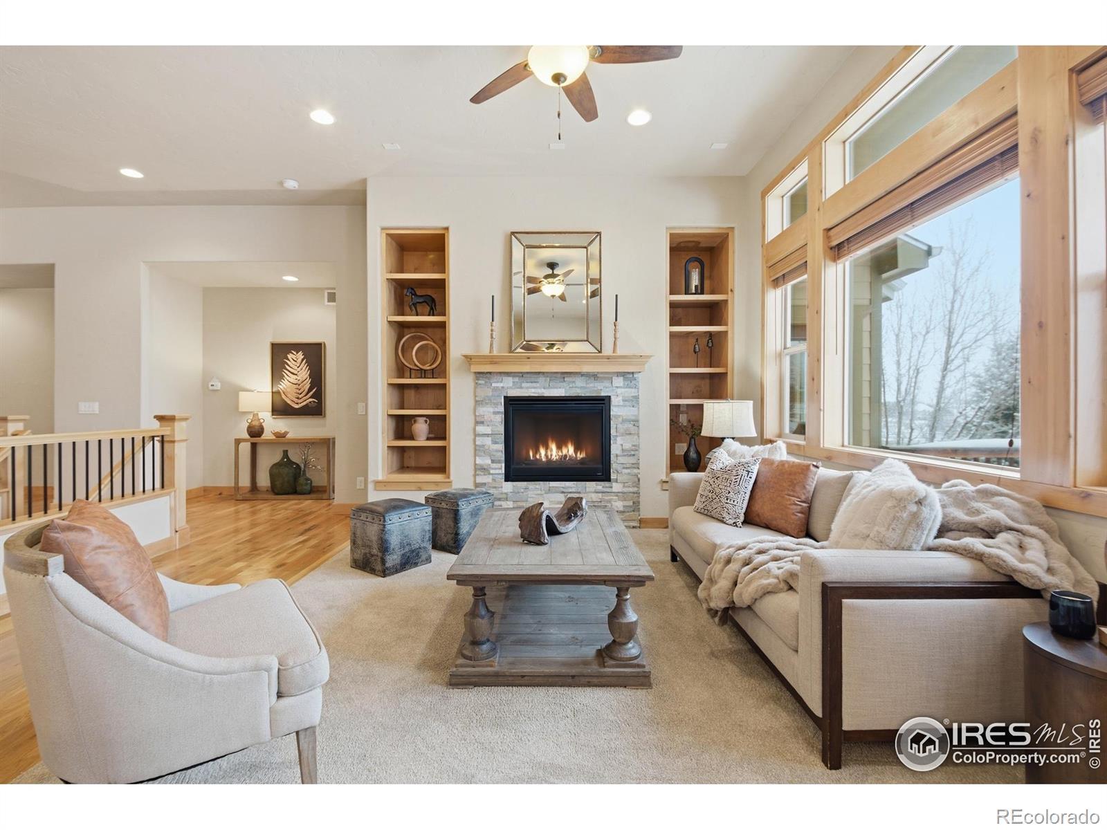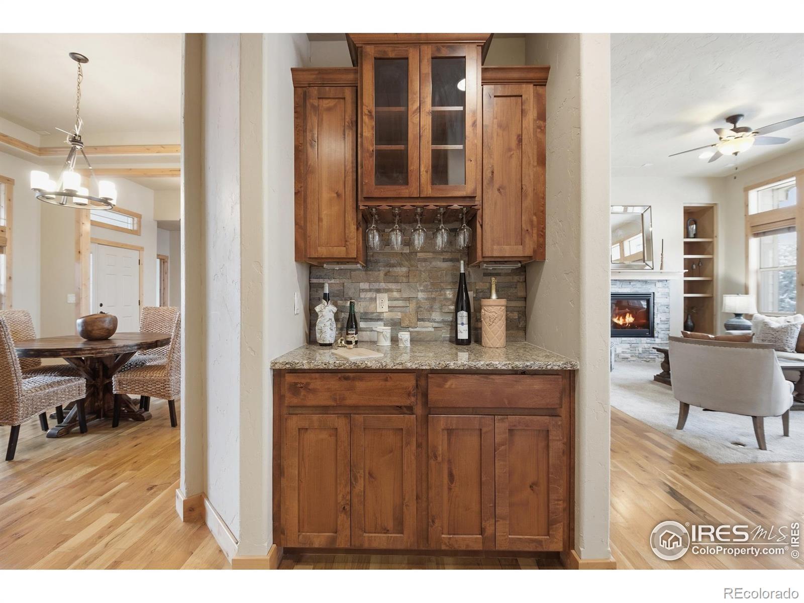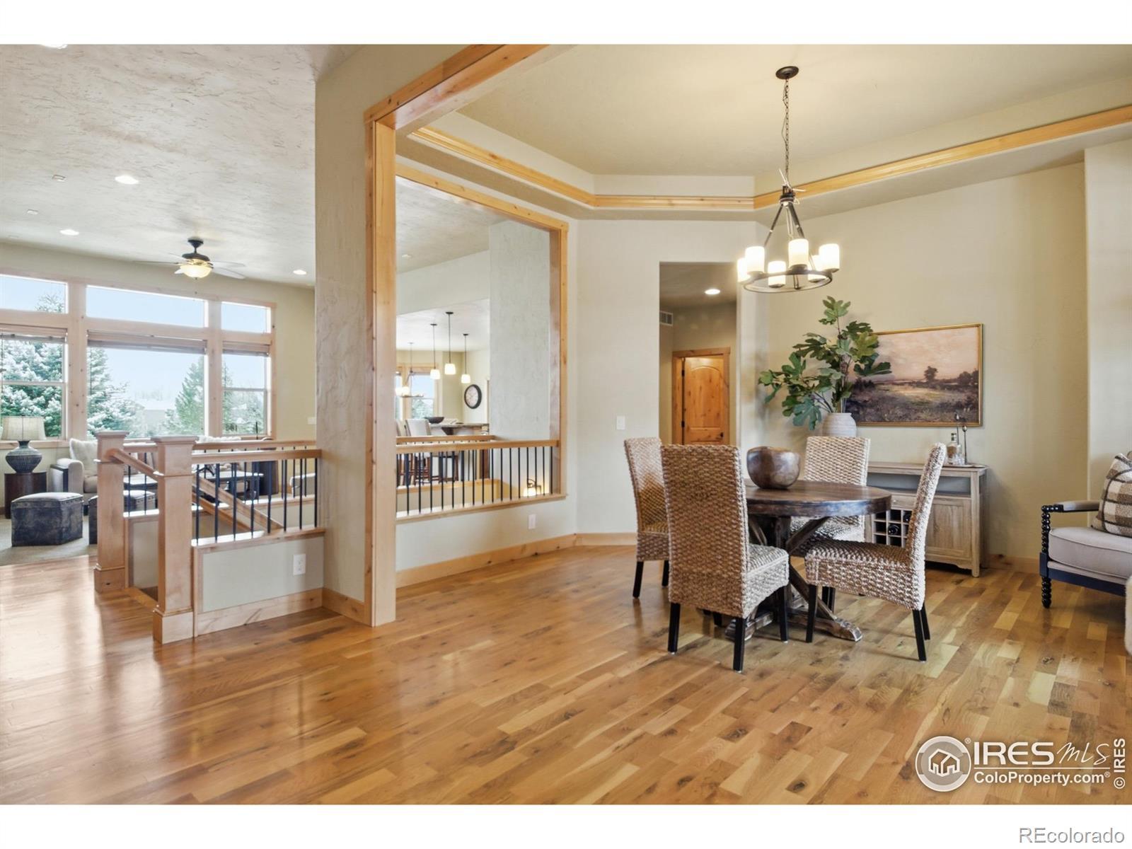 Discover elevated Colorado living in this beautifully crafted Craftsman-style ranch offering 5 bedrooms, 4 baths, and an open, light-filled floorplan designed for comfort and style. Rich hand-troweled walls and ceilings, warm alder trim and doors, and thoughtful details throughout give this home timeless character and exceptional livability.The main level showcases hardwood and tile flooring with 9' and vaulted 11' ceilings. The bright great room features a gas fireplace and beautiful built-ins, creating a warm, inviting space for gathering. The gourmet kitchen offers mission-style alder cabinetry, stainless steel appliances, a built-in gas cooktop with vented hood, wall oven and microwave, slab granite countertops, a walk-in pantry, and a butler's pantry. The casual dining area opens to a covered deck with a gas line for a grill, ideal for outdoor dining. A second deck with views backing to open space and neighboring 2-acre estate lots, and a covered front porch further enhance the home's inviting outdoor spaces. The main-floor primary suite is a true retreat with an 11' tray ceiling, walk-in closet, and a luxurious 5-piece bath featuring a soaking tub, granite countertops, and tile flooring. Two additional main-level bedrooms share a full Jack-and-Jill bath.The finished garden-level basement offers the same high-end finishes and includes an expansive family/rec room, second gas fireplace, wet bar with granite and beverage fridge, two large bedrooms, a full bath, and a generous storage room. With 8.7' ceilings and abundant natural light, it feels open and welcoming.Car enthusiasts will appreciate the oversized 3-car tandem garage with workbench and impressive 44' depth. Located on a quiet street near Coyote Gulch Open Space and playground, and the Poudre Trail, this home offers tranquility and convenience. With exceptional craftsmanship, abundant storage, and beautifully integrated indoor-outdoor living, this property is truly a standout.