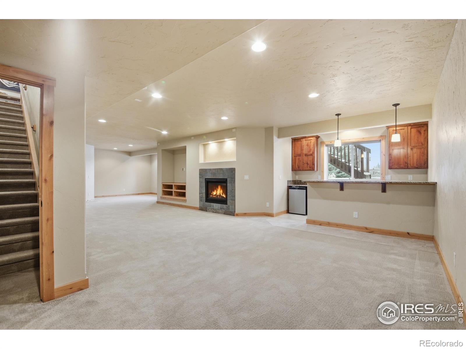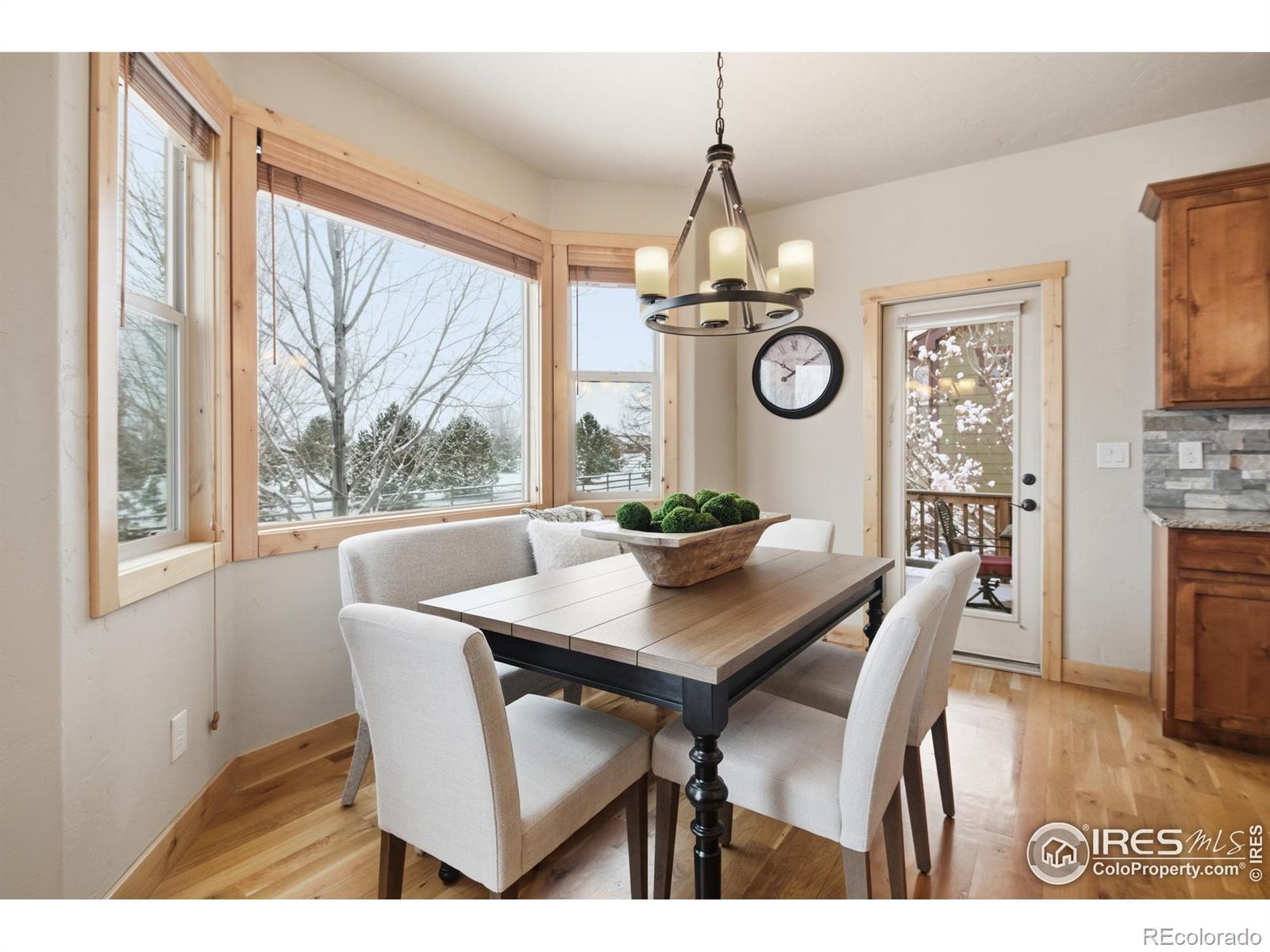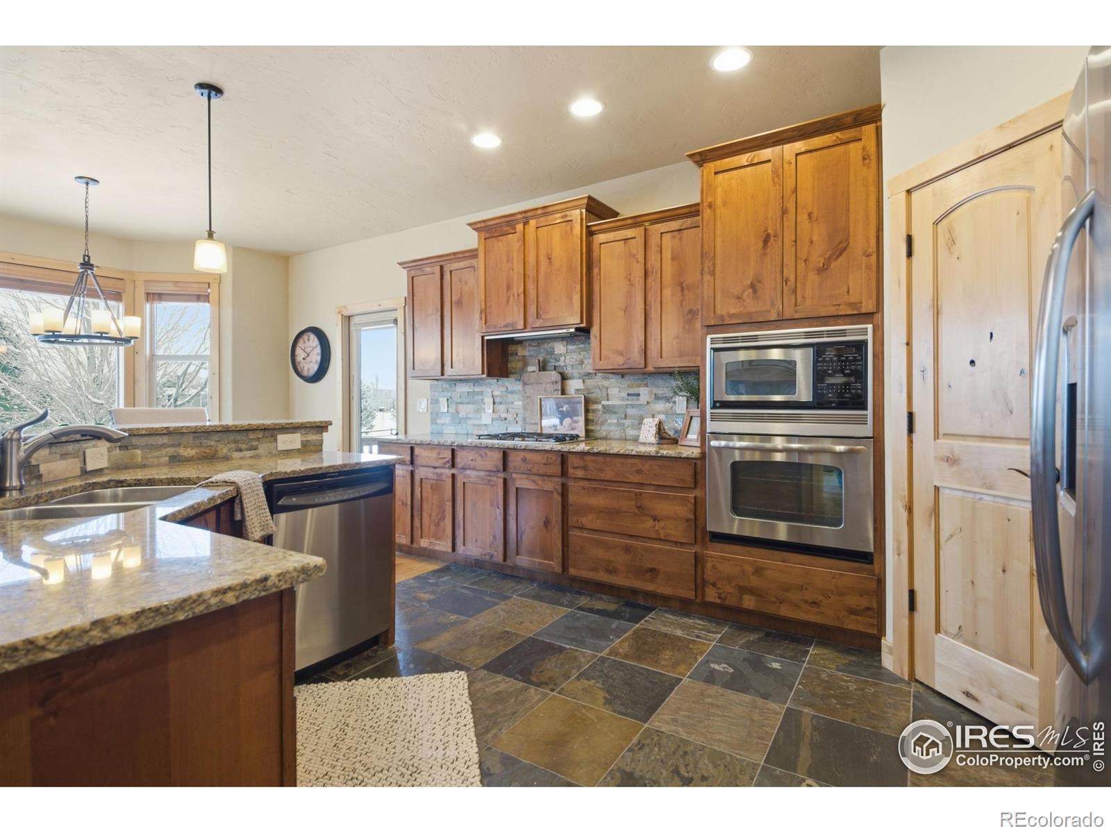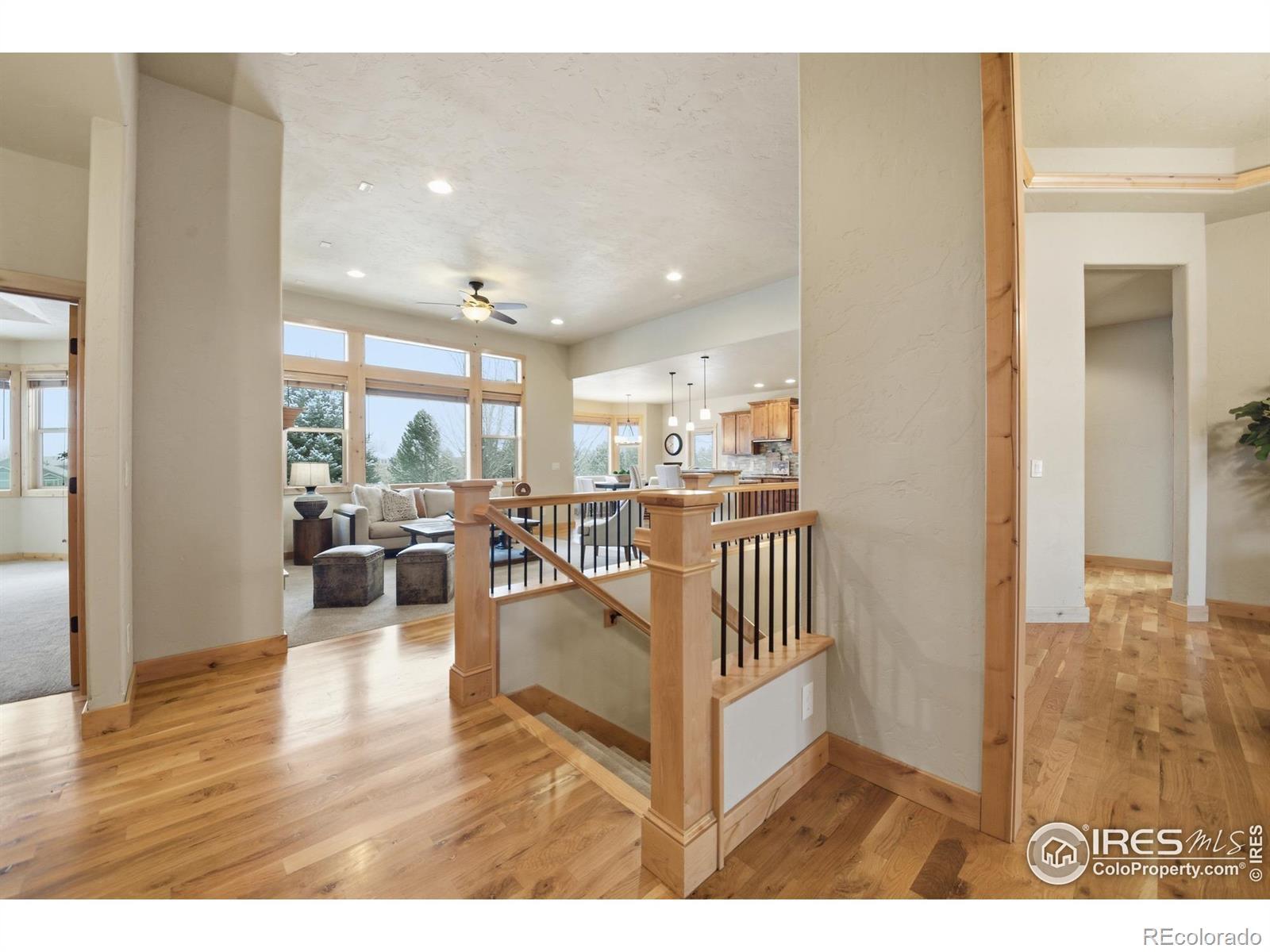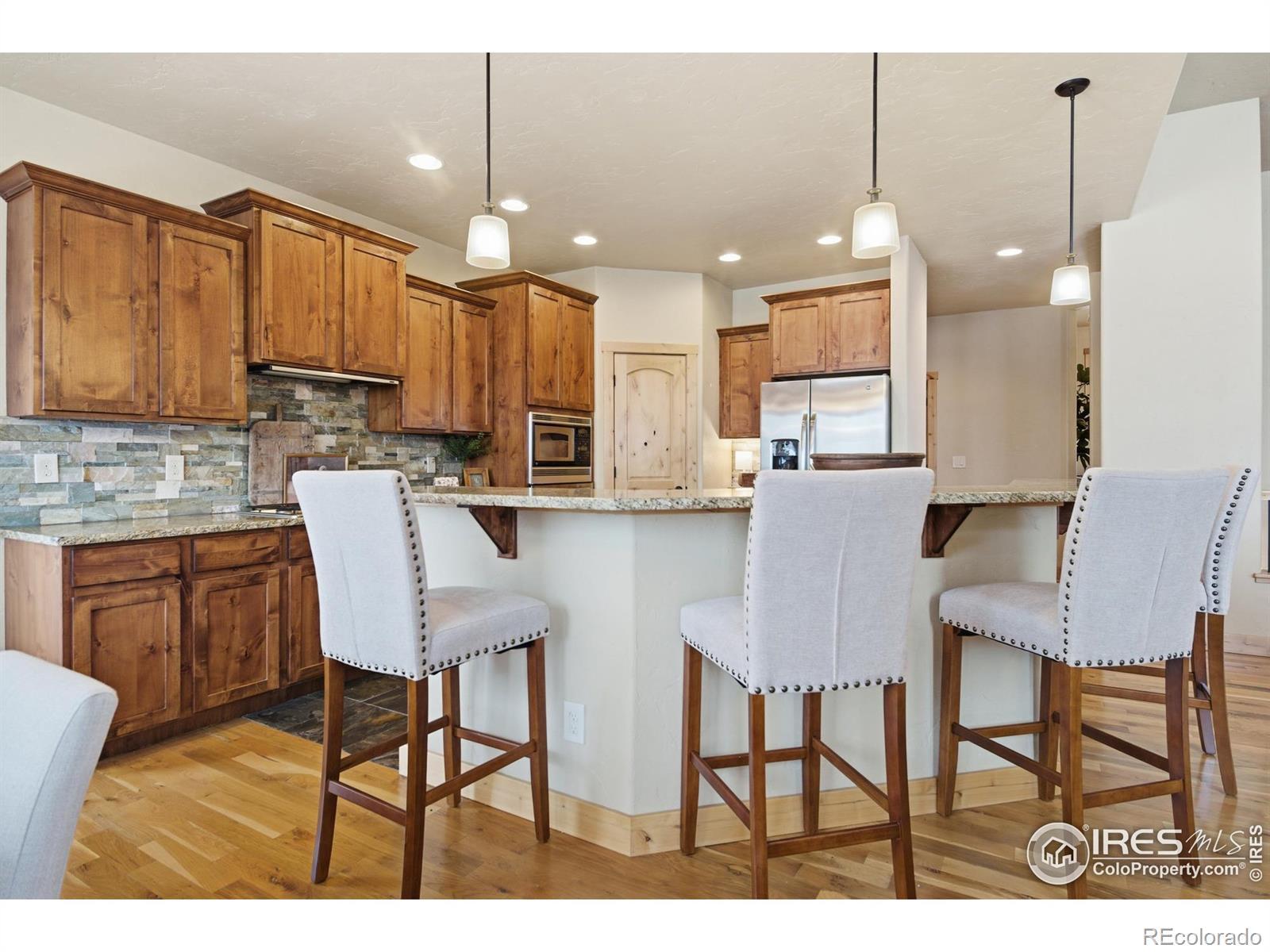 Discover elevated Colorado living in this beautifully crafted Craftsman-style ranch offering 5 bedrooms, 4 baths, and an open, light-filled floorplan designed for comfort and style. Rich hand-troweled walls and ceilings, warm alder trim and doors, and thoughtful details throughout give this home timeless character and exceptional livability.The main level showcases hardwood and tile flooring with 9' and vaulted 11' ceilings. The bright great room features a gas fireplace and beautiful built-ins, creating a warm, inviting space for gathering. The gourmet kitchen offers mission-style alder cabinetry, stainless steel appliances, a built-in gas cooktop with vented hood, wall oven and microwave, slab granite countertops, a walk-in pantry, and a butler's pantry. The casual dining area opens to a covered deck with a gas line for a grill, ideal for outdoor dining. A second deck with views backing to open space and neighboring 2-acre estate lots, and a covered front porch further enhance the home's inviting outdoor spaces. The main-floor primary suite is a true retreat with an 11' tray ceiling, walk-in closet, and a luxurious 5-piece bath featuring a soaking tub, granite countertops, and tile flooring. Two additional main-level bedrooms share a full Jack-and-Jill bath.The finished garden-level basement offers the same high-end finishes and includes an expansive family/rec room, second gas fireplace, wet bar with granite and beverage fridge, two large bedrooms, a full bath, and a generous storage room. With 8.7' ceilings and abundant natural light, it feels open and welcoming.Car enthusiasts will appreciate the oversized 3-car tandem garage with workbench and impressive 44' depth. Located on a quiet street near Coyote Gulch Open Space and playground, and the Poudre Trail, this home offers tranquility and convenience. With exceptional craftsmanship, abundant storage, and beautifully integrated indoor-outdoor living, this property is truly a standout.