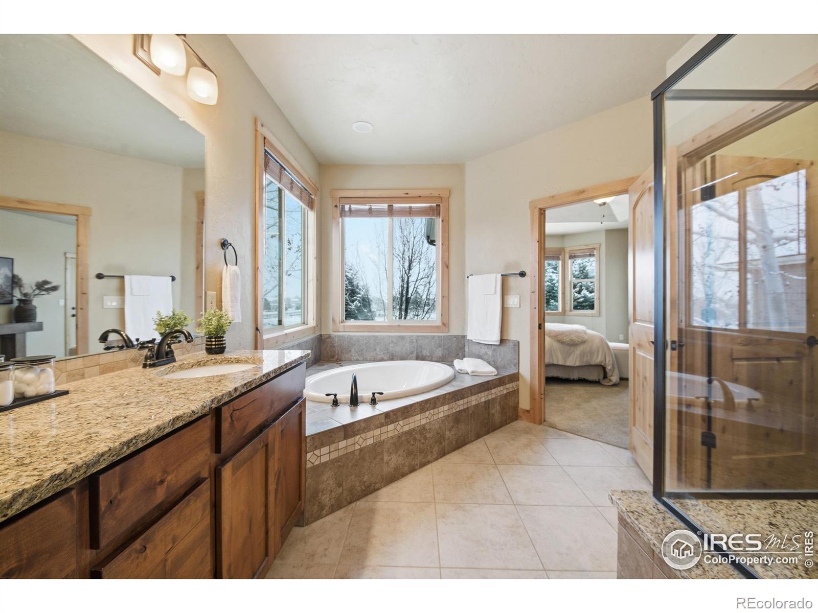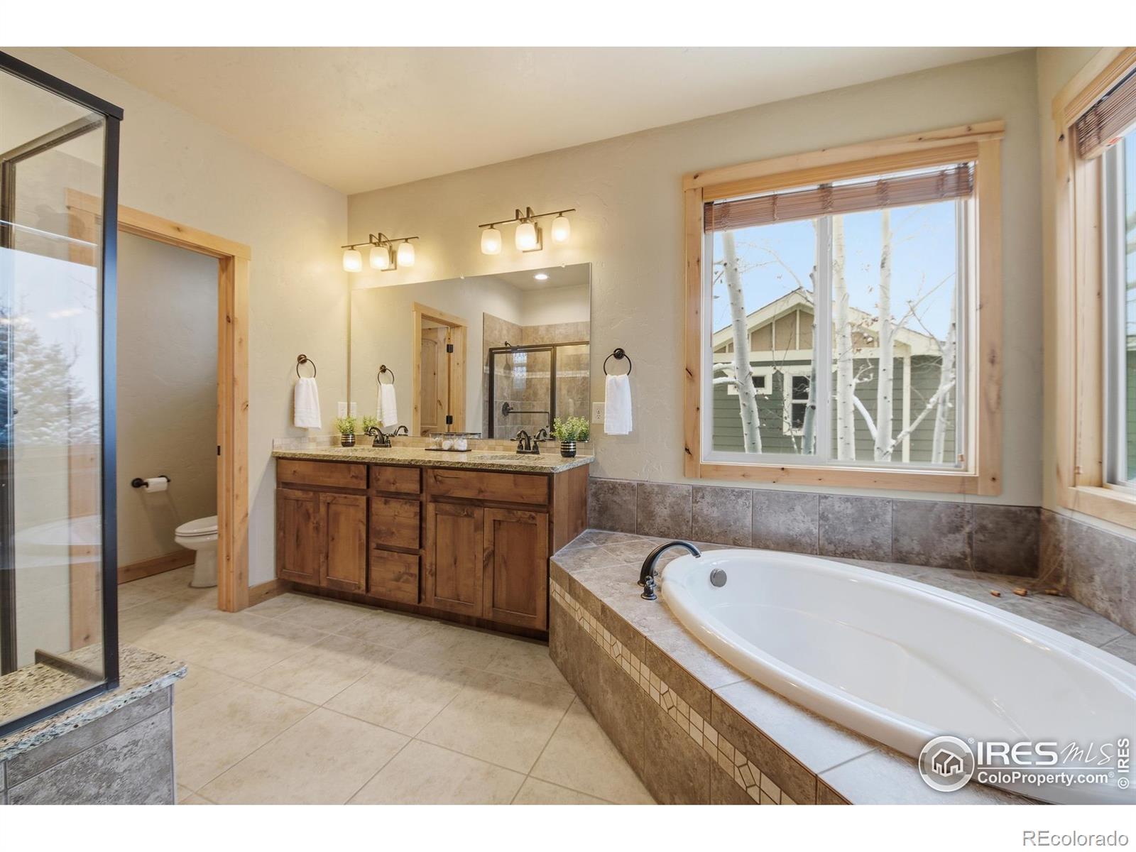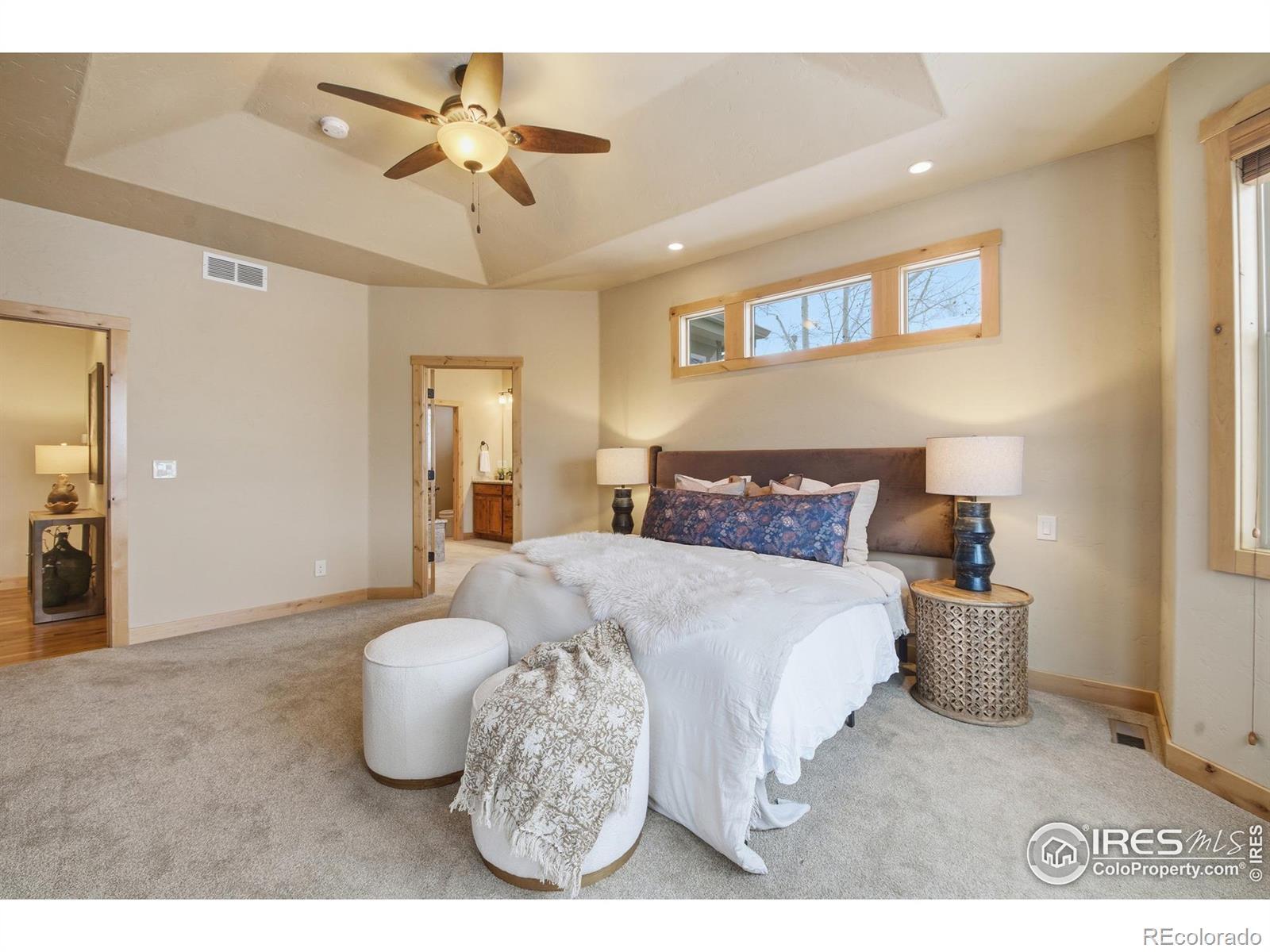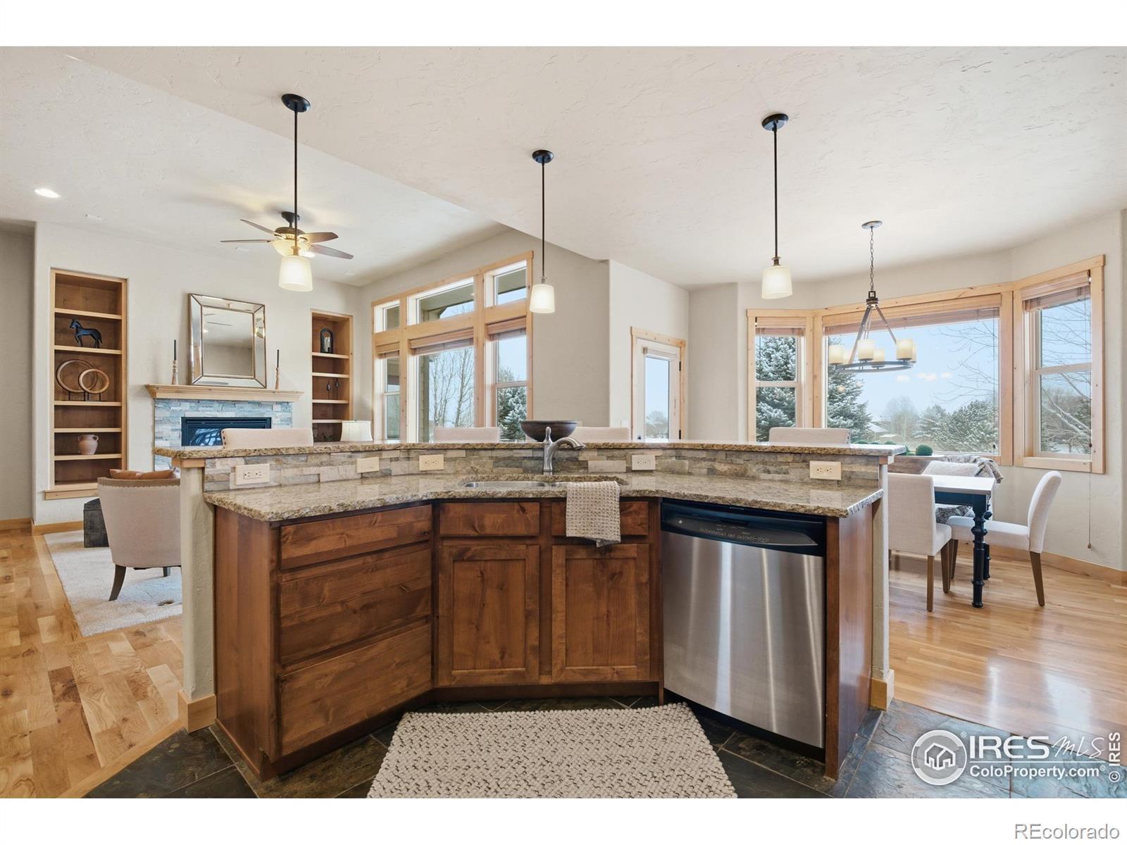 Discover elevated Colorado living in this beautifully crafted Craftsman-style ranch offering 5 bedrooms, 4 baths, and an open, light-filled floorplan designed for comfort and style. Rich hand-troweled walls and ceilings, warm alder trim and doors, and thoughtful details throughout give this home timeless character and exceptional livability.The main level showcases hardwood and tile flooring with 9' and vaulted 11' ceilings. The bright great room features a gas fireplace and beautiful built-ins, creating a warm, inviting space for gathering. The gourmet kitchen offers mission-style alder cabinetry, stainless steel appliances, a built-in gas cooktop with vented hood, wall oven and microwave, slab granite countertops, a walk-in pantry, and a butler's pantry. The casual dining area opens to a covered deck with a gas line for a grill, ideal for outdoor dining. A second deck with views backing to open space and neighboring 2-acre estate lots, and a covered front porch further enhance the home's inviting outdoor spaces. The main-floor primary suite is a true retreat with an 11' tray ceiling, walk-in closet, and a luxurious 5-piece bath featuring a soaking tub, granite countertops, and tile flooring. Two additional main-level bedrooms share a full Jack-and-Jill bath.The finished garden-level basement offers the same high-end finishes and includes an expansive family/rec room, second gas fireplace, wet bar with granite and beverage fridge, two large bedrooms, a full bath, and a generous storage room. With 8.7' ceilings and abundant natural light, it feels open and welcoming.Car enthusiasts will appreciate the oversized 3-car tandem garage with workbench and impressive 44' depth. Located on a quiet street near Coyote Gulch Open Space and playground, and the Poudre Trail, this home offers tranquility and convenience. With exceptional craftsmanship, abundant storage, and beautifully integrated indoor-outdoor living, this property is truly a standout.