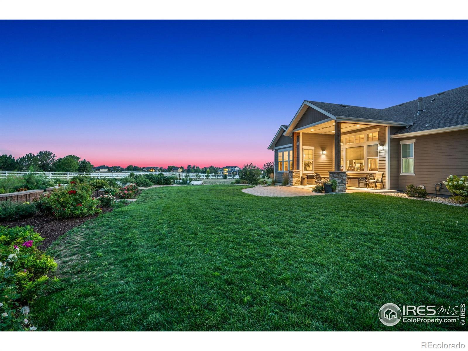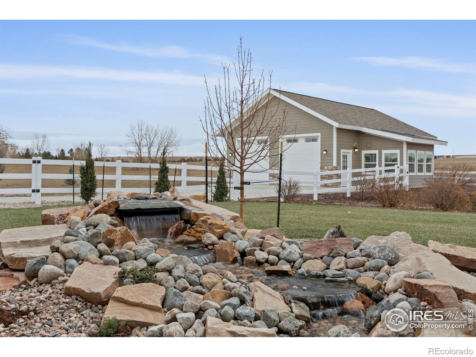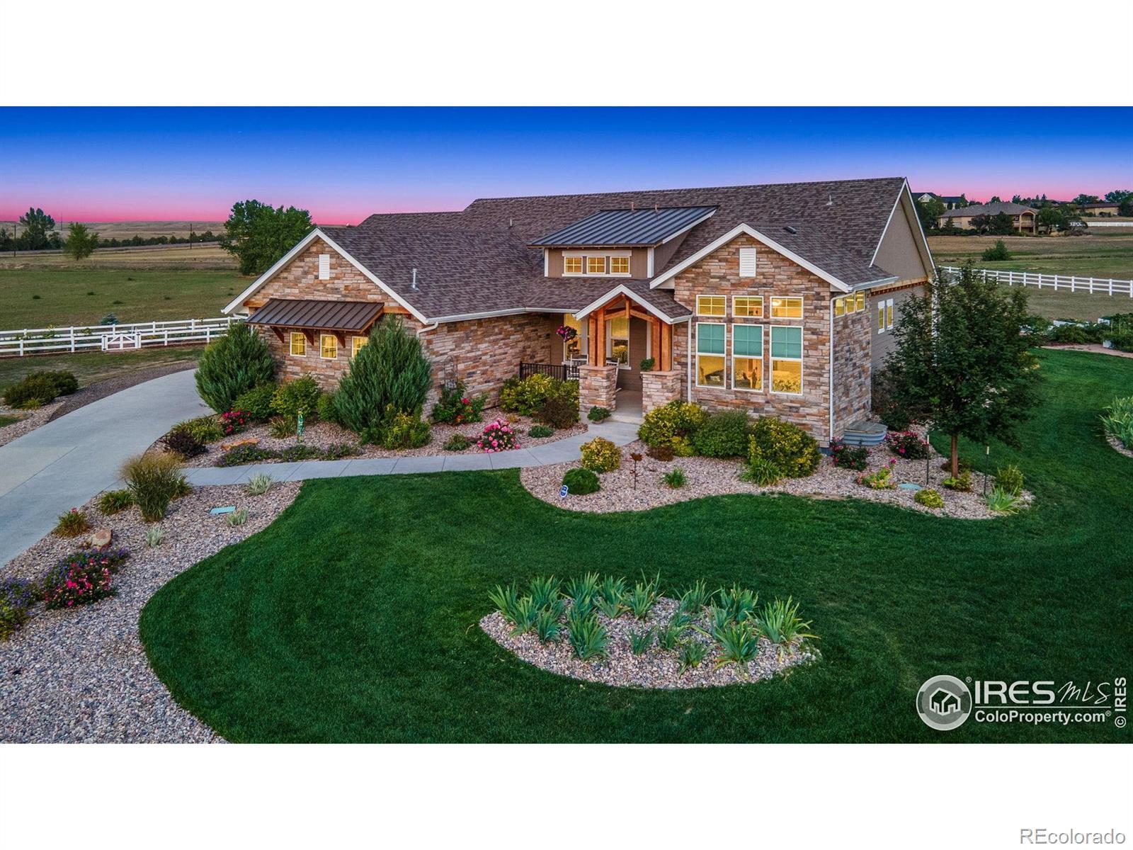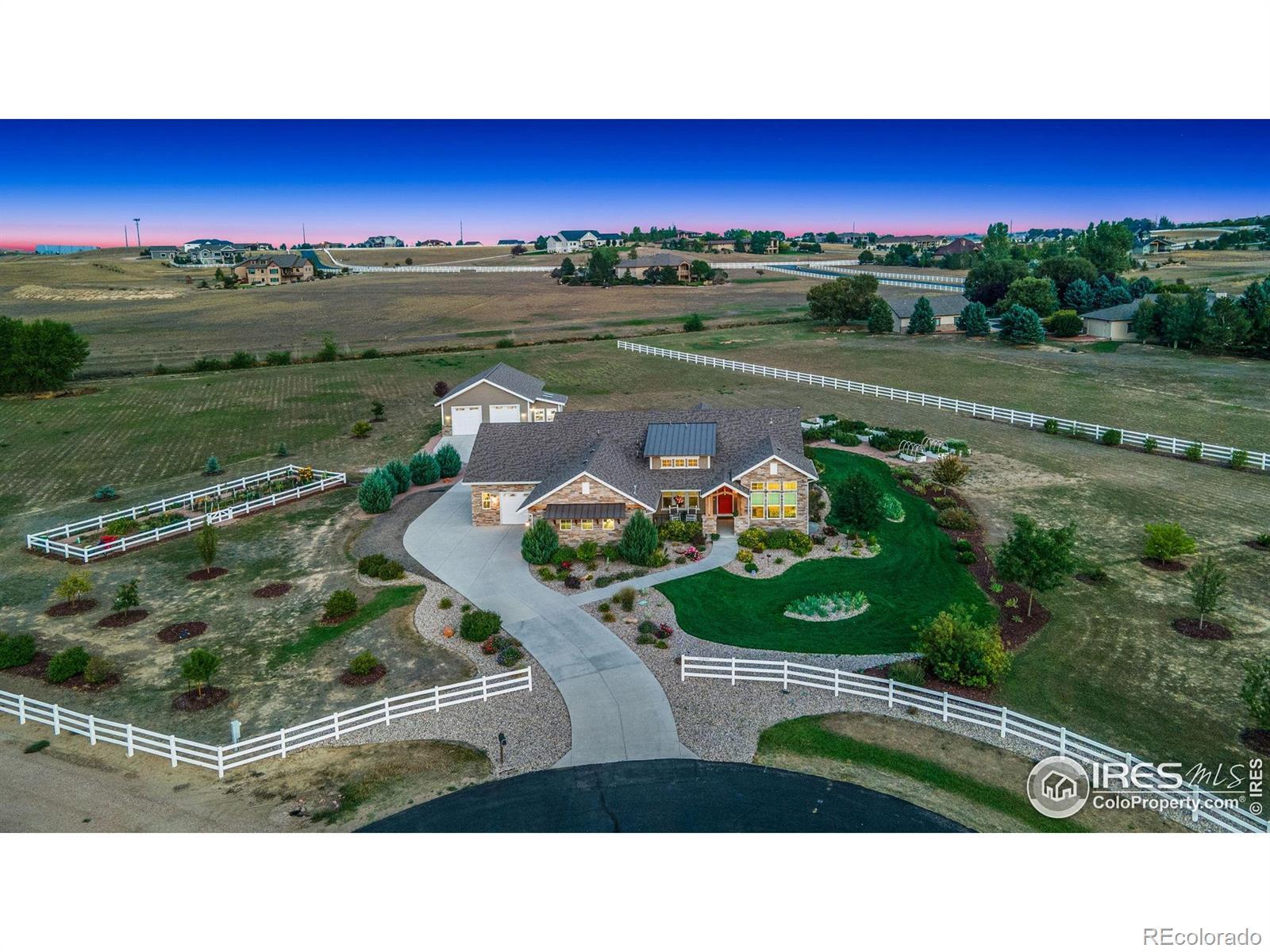 Welcome to this custom ranch home on 3.7 acres, ideally located just minutes from downtown Fort Collins. This property is a dream for gardeners, featuring multiple well-designed garden spaces, irrigated raised beds, and a gated botanical area that could also serve as a future dog run. The landscape includes a variety of fruit trees, thoughtfully cultivated planting areas, and a newly installed, multi-tier natural stone water feature. Set at the end of a peaceful cul-de-sac in the desirable Belmont Farms subdivision, the home offers mountain views, spacious surroundings, and neighborhood walking paths, all within 20 minutes of downtown Fort Collins. A key highlight is the nearly 1,400 sq ft detached shop, complete with heat, two 12-ft bay doors with side-mounted openers ,several 220V outlets for tools or equipment, and plenty of exterior parking. The attached greenhouse includes automatic venting and a dedicated sink for early-season garden prep. The heated, attached 3-car garage provides almost 1,300 sq ft of additional workspace and storage and houses a whole-home Generac generator for added security. Inside, the floor plan is functional and inviting, featuring an open-concept great room with fireplace, dining area, and a well-equipped kitchen with a large island and prep sink, walk-in pantry, built-in appliances, and a gas range with hood. The main level includes two bedroom suites plus an office that could serve as a fourth bedroom. The primary suite offers a spa-inspired bathroom and a spacious walk-in closet with custom organization. The finished basement expands the living space with a large recreation room, complete bar area, media and library space, and a private guest ensuite. This well-maintained property offers a rare combination of acreage, convenience, and versatility.